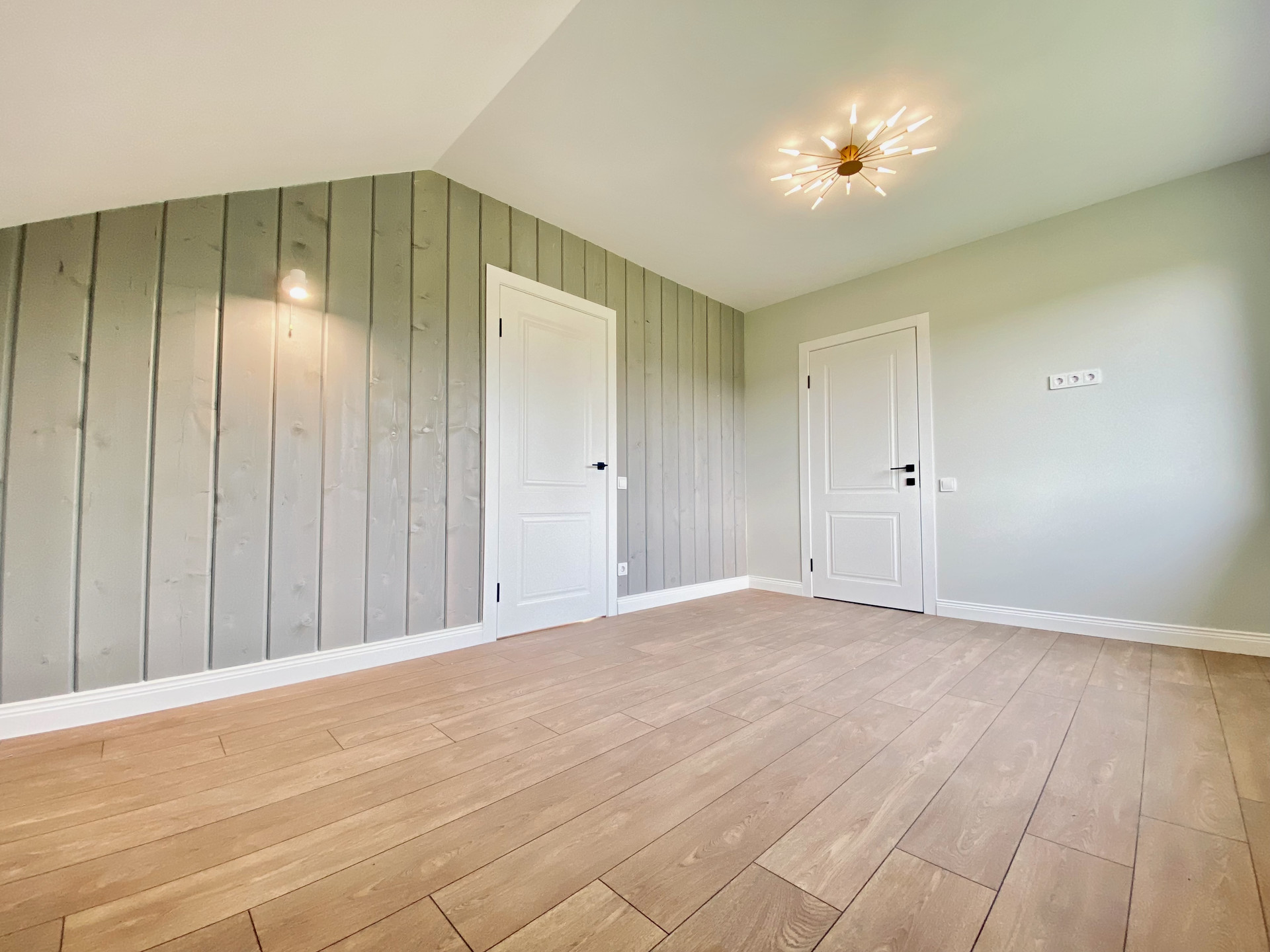 Первый этаж просторная кухня - гостиная 20 кв.м с собственным выходом на террасу из лиственницы 19,5м2 , спальная комната, просторная прихожая с нишей под шкаф и санузел, отделанный плиткой и с теплым полом.