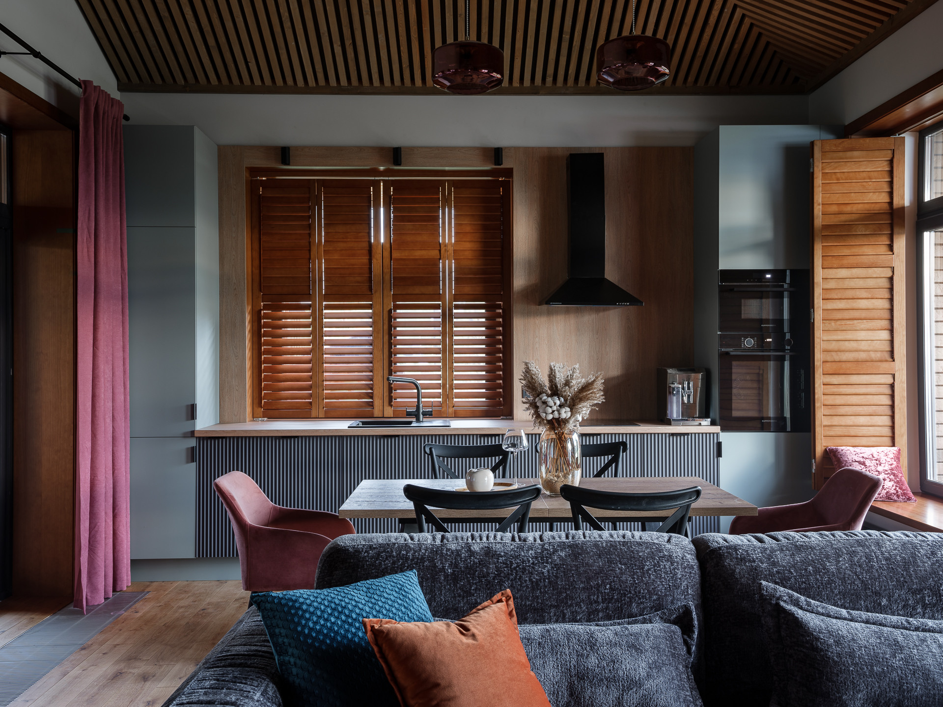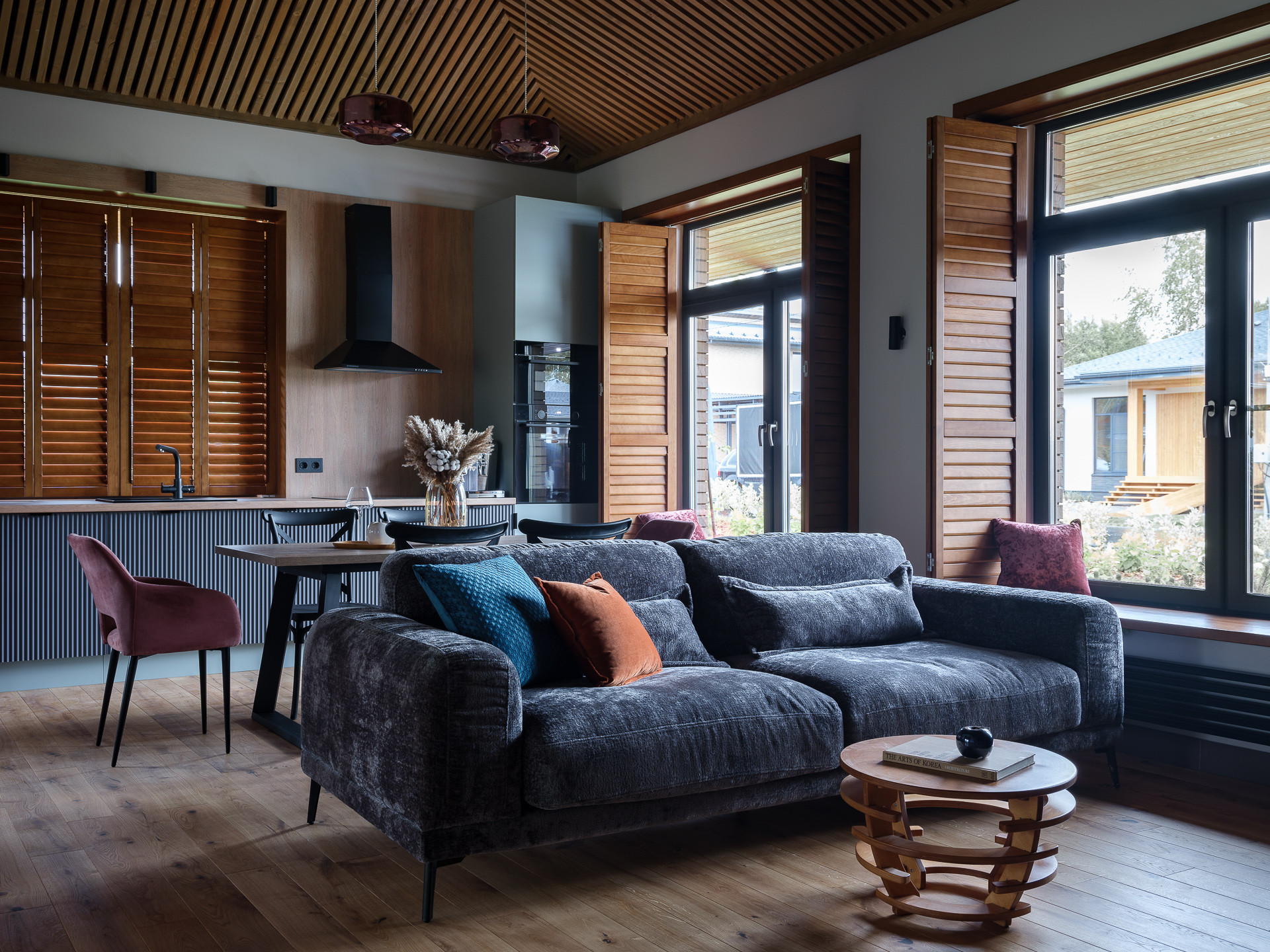 Планировка дома – функциональность в каждой детали. Все помещения располагаются последовательно: места для удобного хранения вещей, приватные зоны для отдыха и просторная кухня-гостиная, где центром внимания станет камин. Из зоны кухни через распашные стеклянные двери мы переходим на террасу. Панорамное остекление стирает границы и создает тесное взаимодействие внутреннего пространства и окружающего ландшафта.