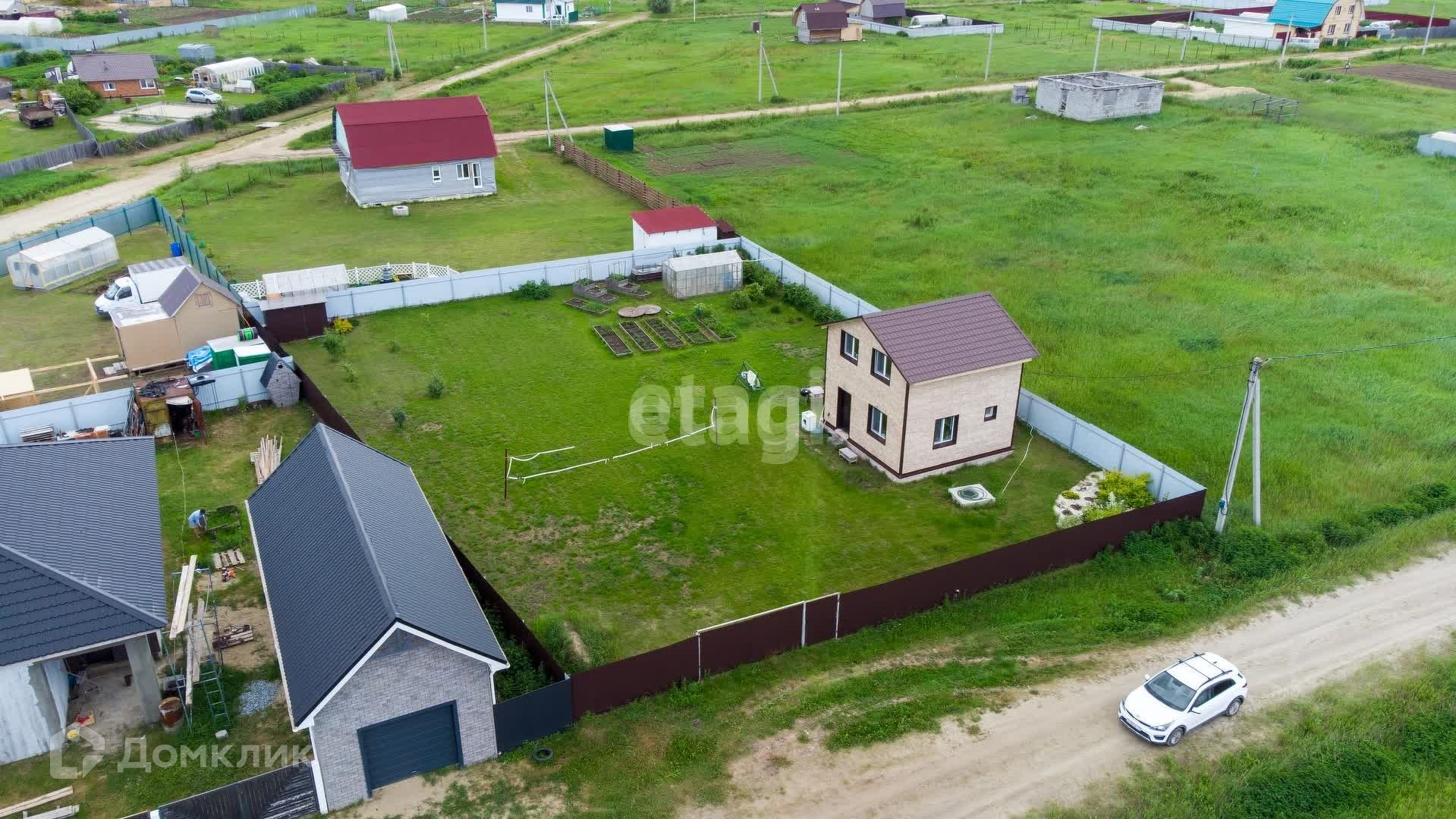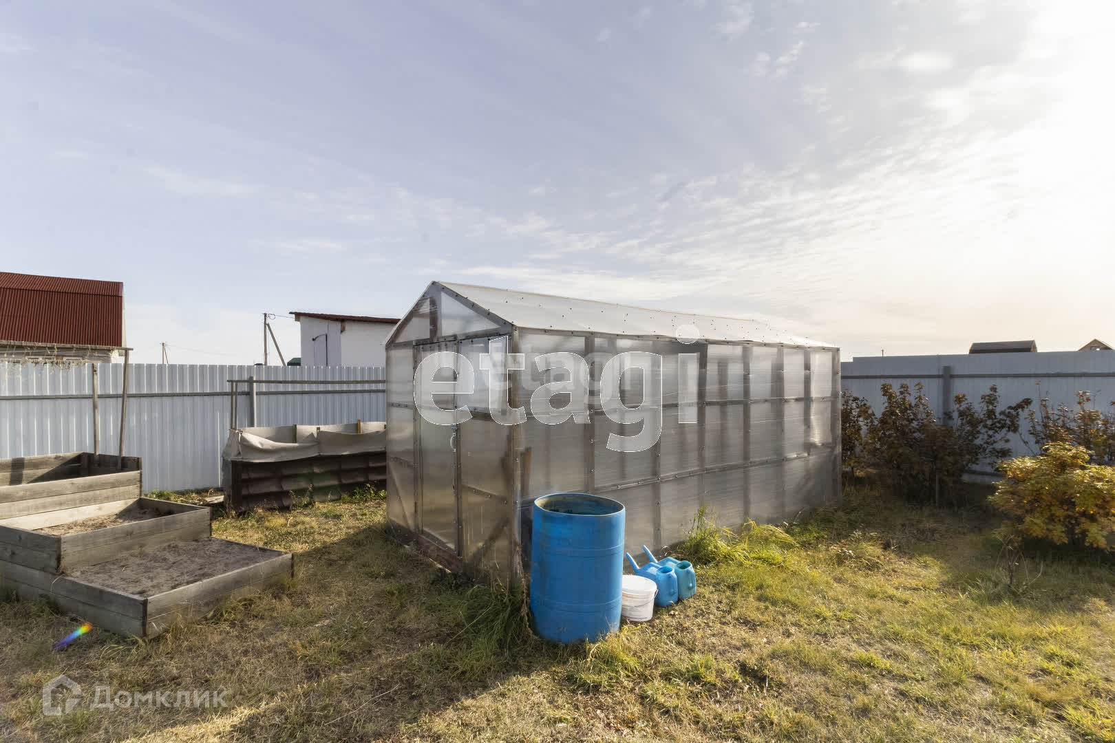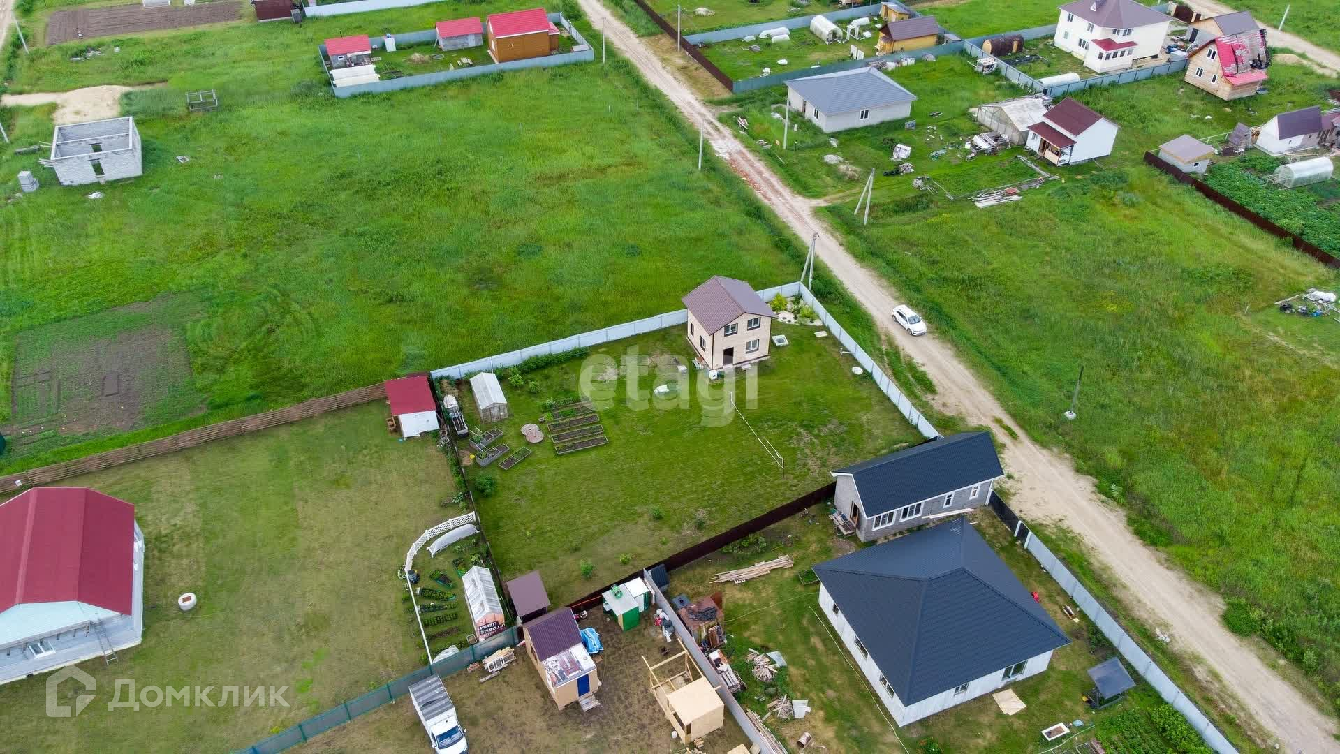 Участок огорожен со всех сторон, установлены ворота и калитка. На участке есть хозблок с уличным туалетом, теплица, сделаны грядки. На участке растёт машина, клубника, голубика, черная и красная смородина, шиповник, яблони Медуница и Антоновка, сливы, груша, вишня. Также выполнено декоративное ландшафтное озеленение.