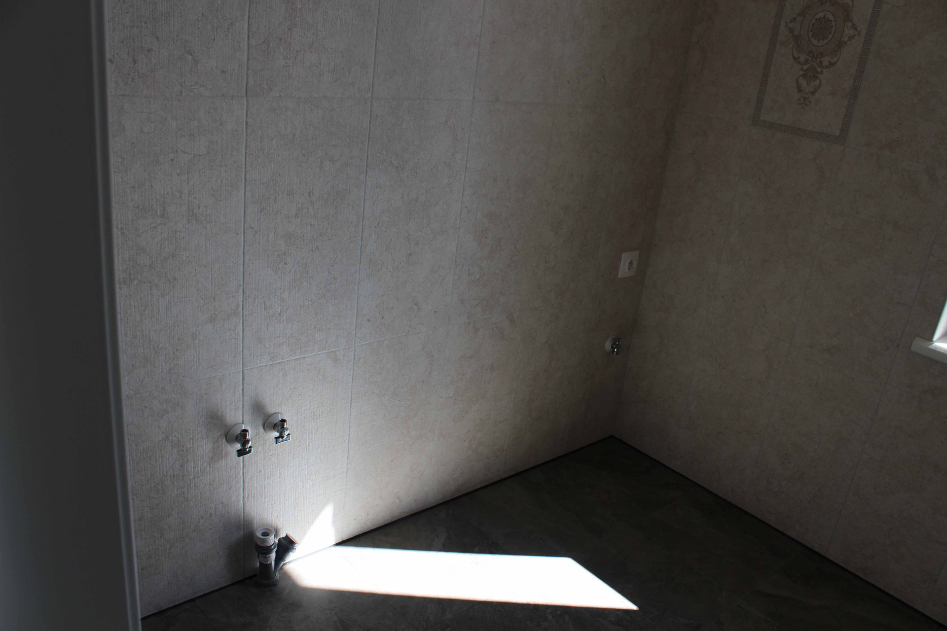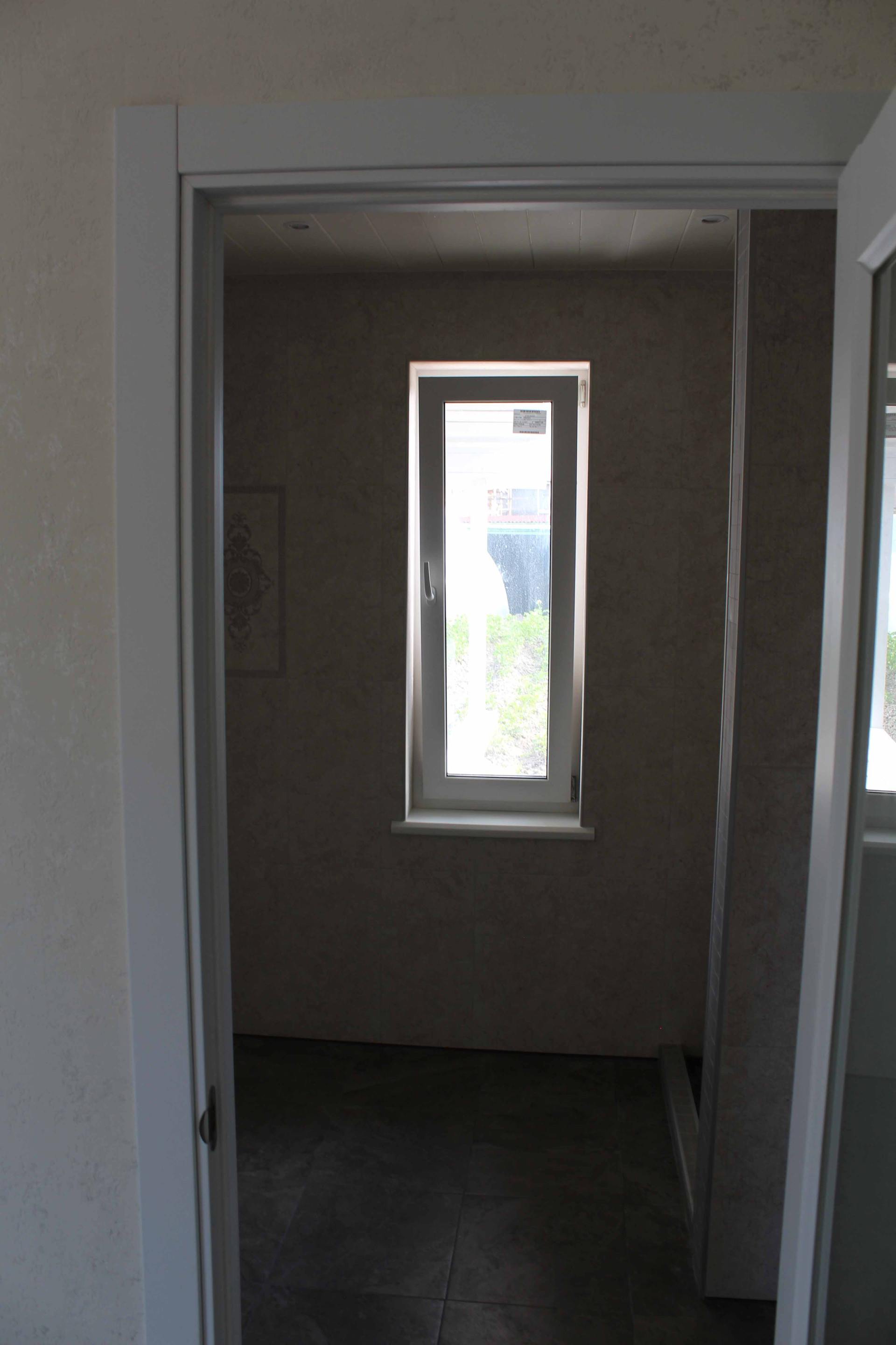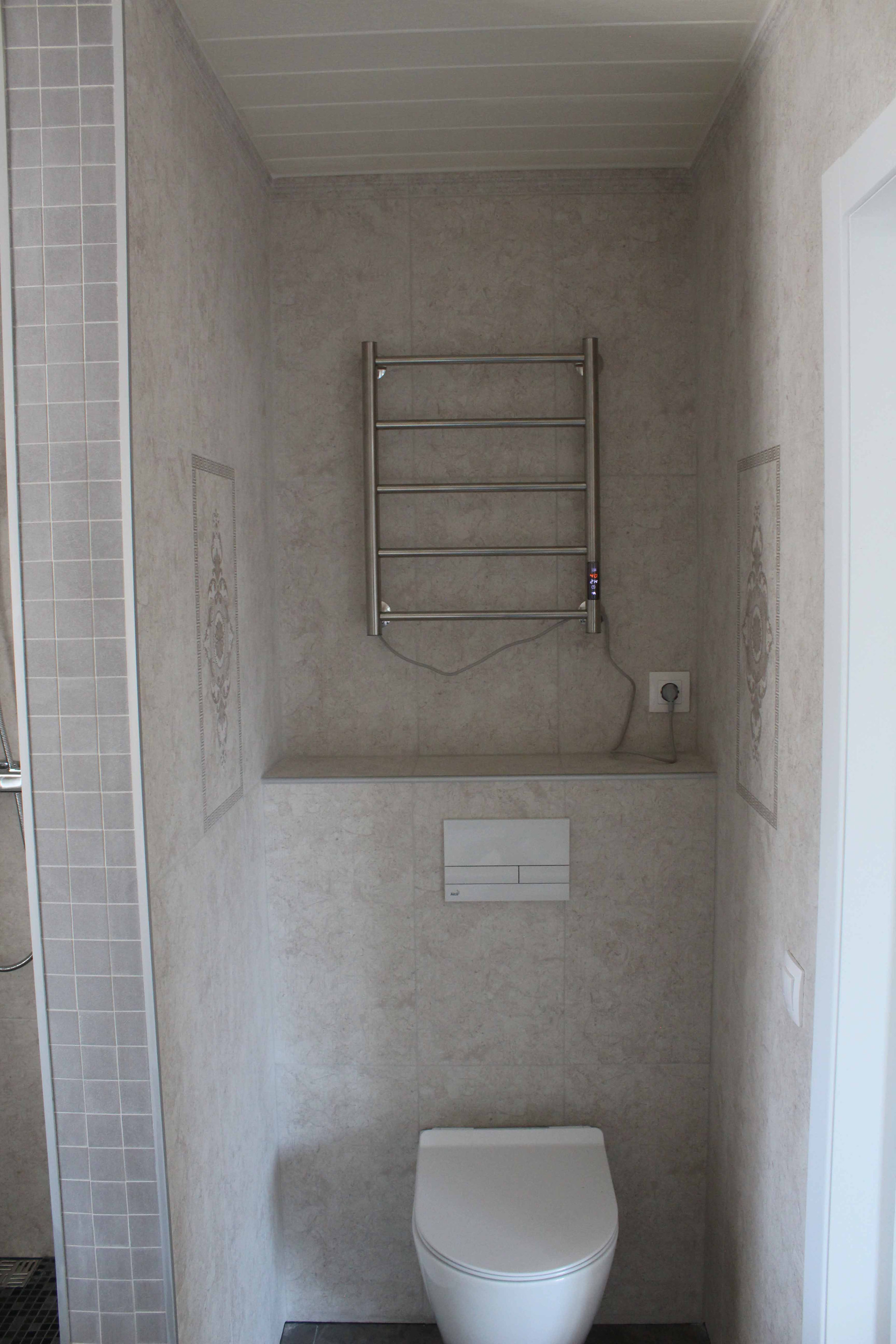 8. Санузел с окном отделка полностью. Унитаз - инсталяция, душевой смеситель, полотенцесушитель. Место для стиральной машины сделано.