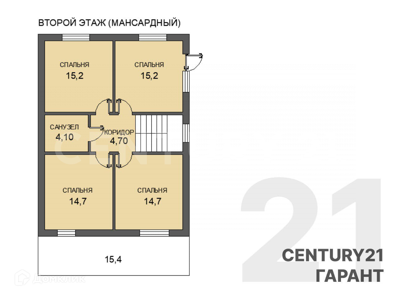 На втором этаже совмещенный с/у 4.10 м2, 4 спальни (15.2+15.2+14.7+14.7) м2.