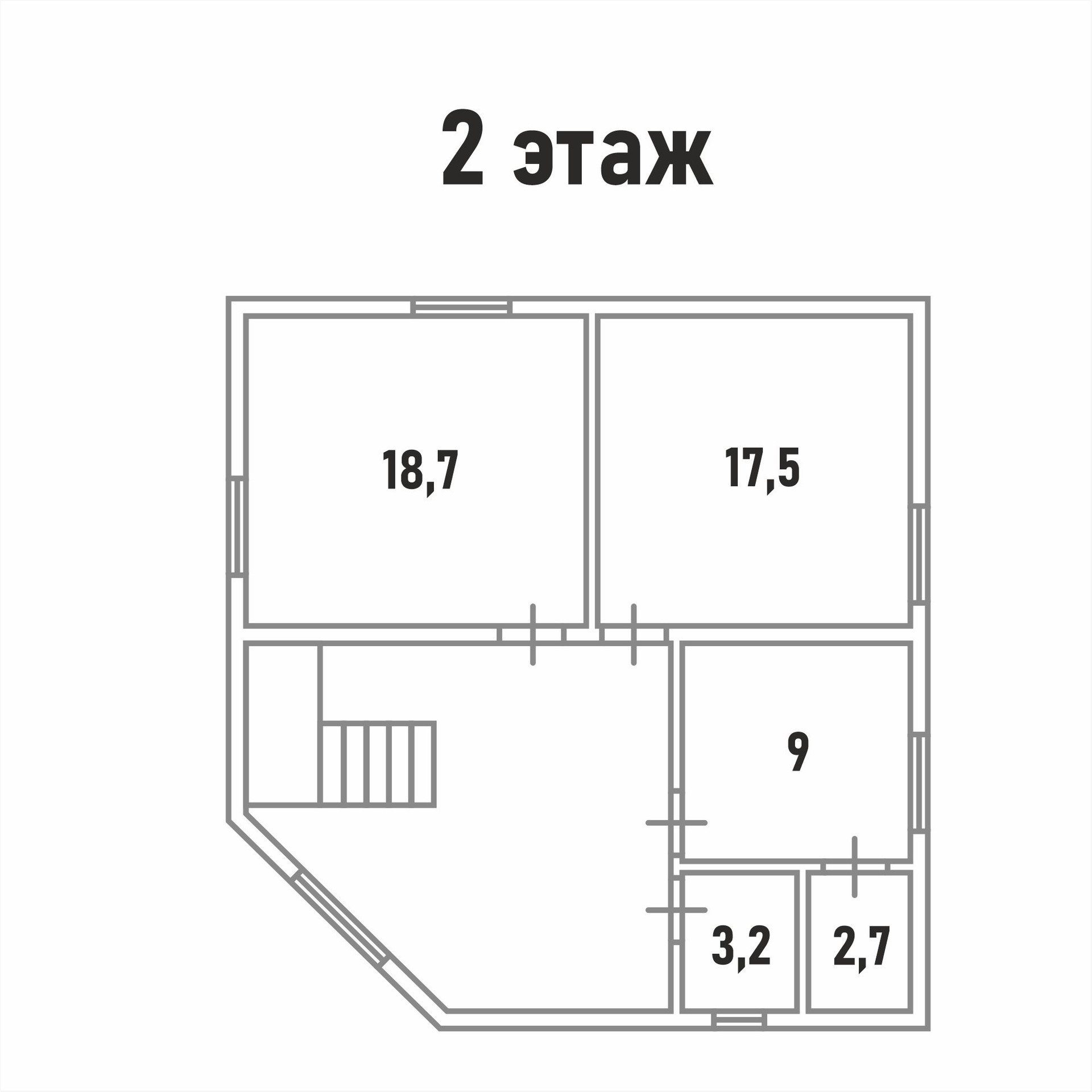 Планировка второго этажа включает в себя 3 спальни 18,7 кв. м, 17,5 кв. м и 9 кв. м, санузел и просторный холл, где можно разместить зону отдыха или кабинет.