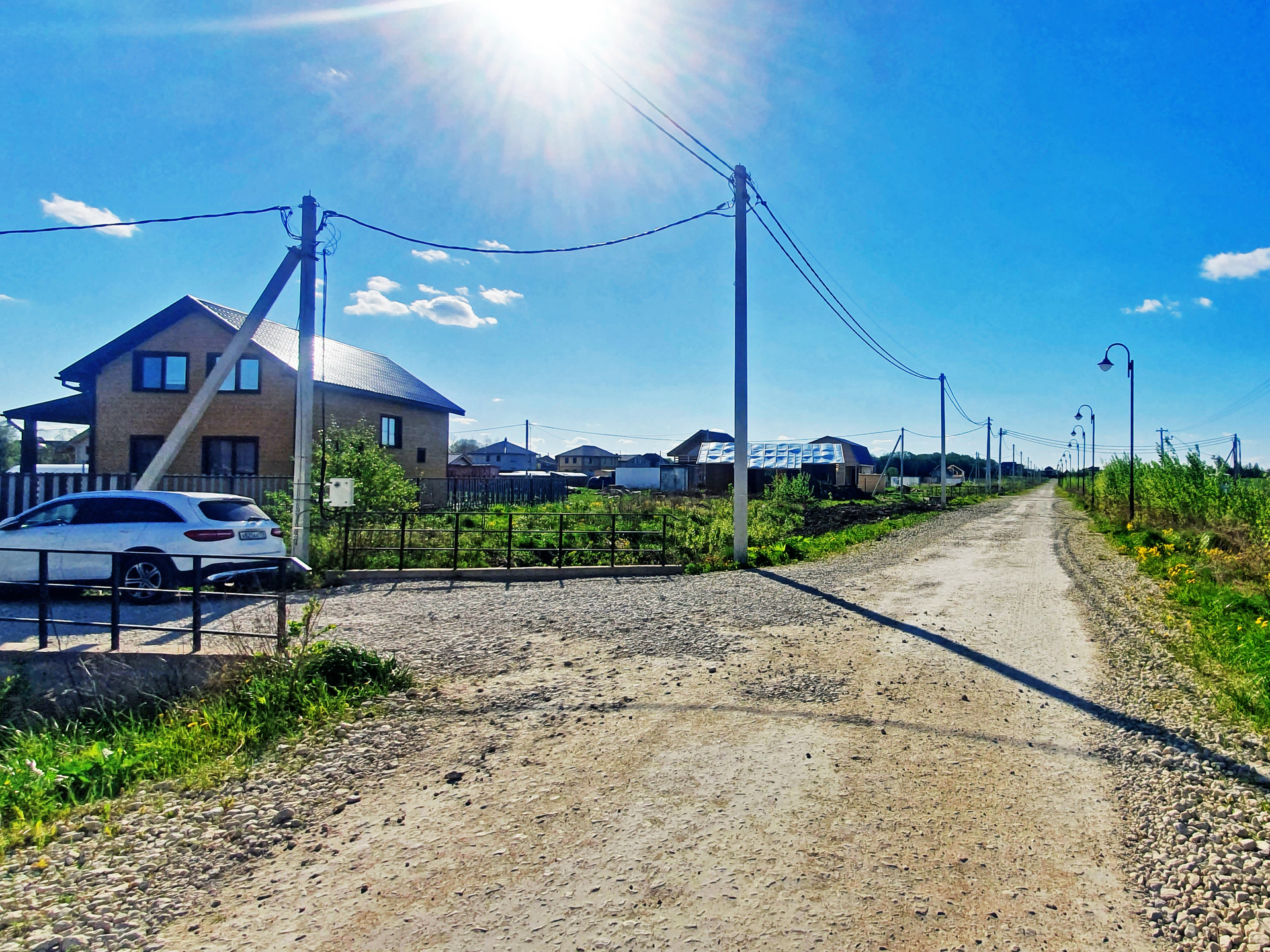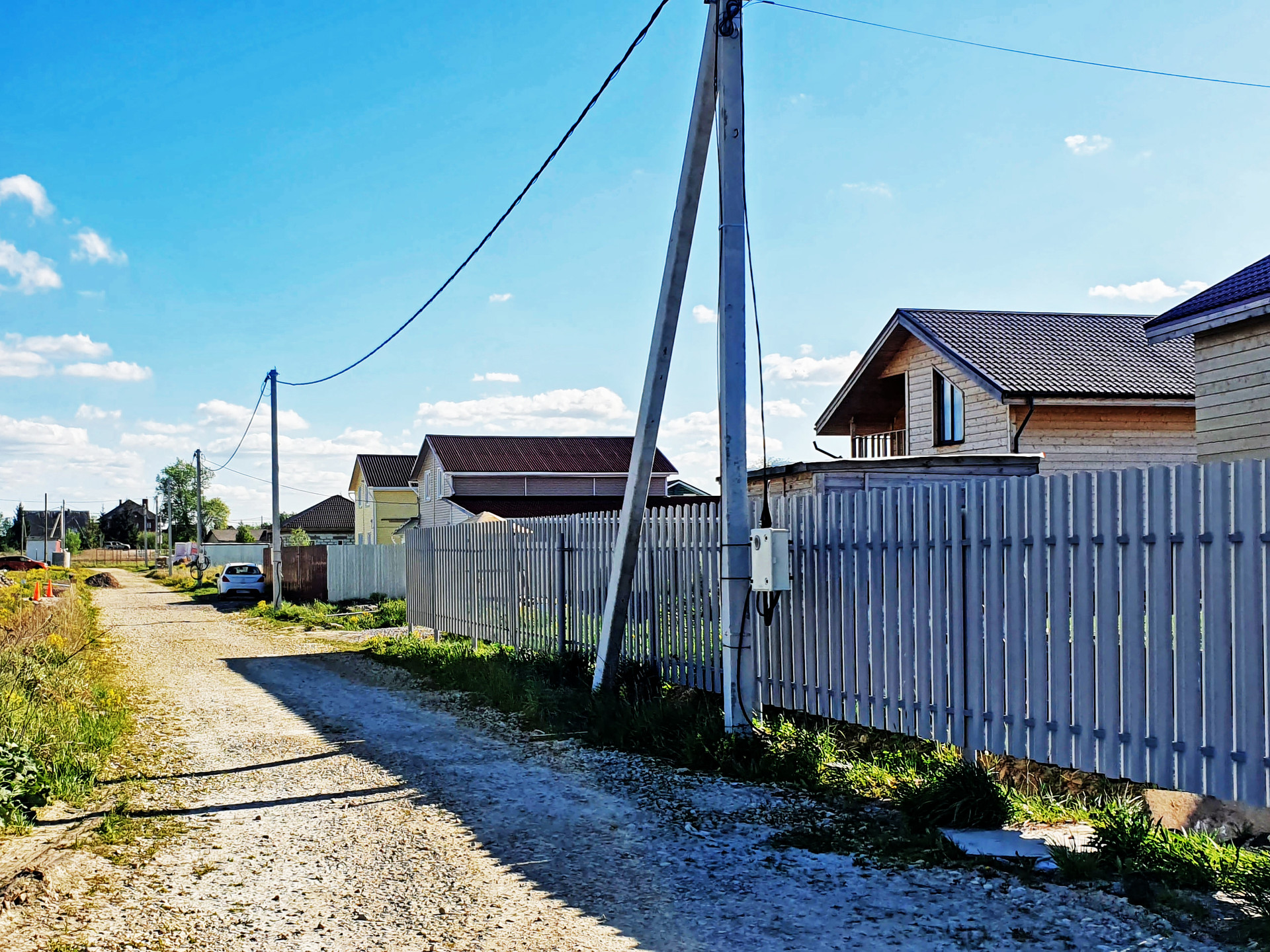В коттеджном поселке электричество, хорошие дороги, дренаж вдоль дорог, уличное освещение.