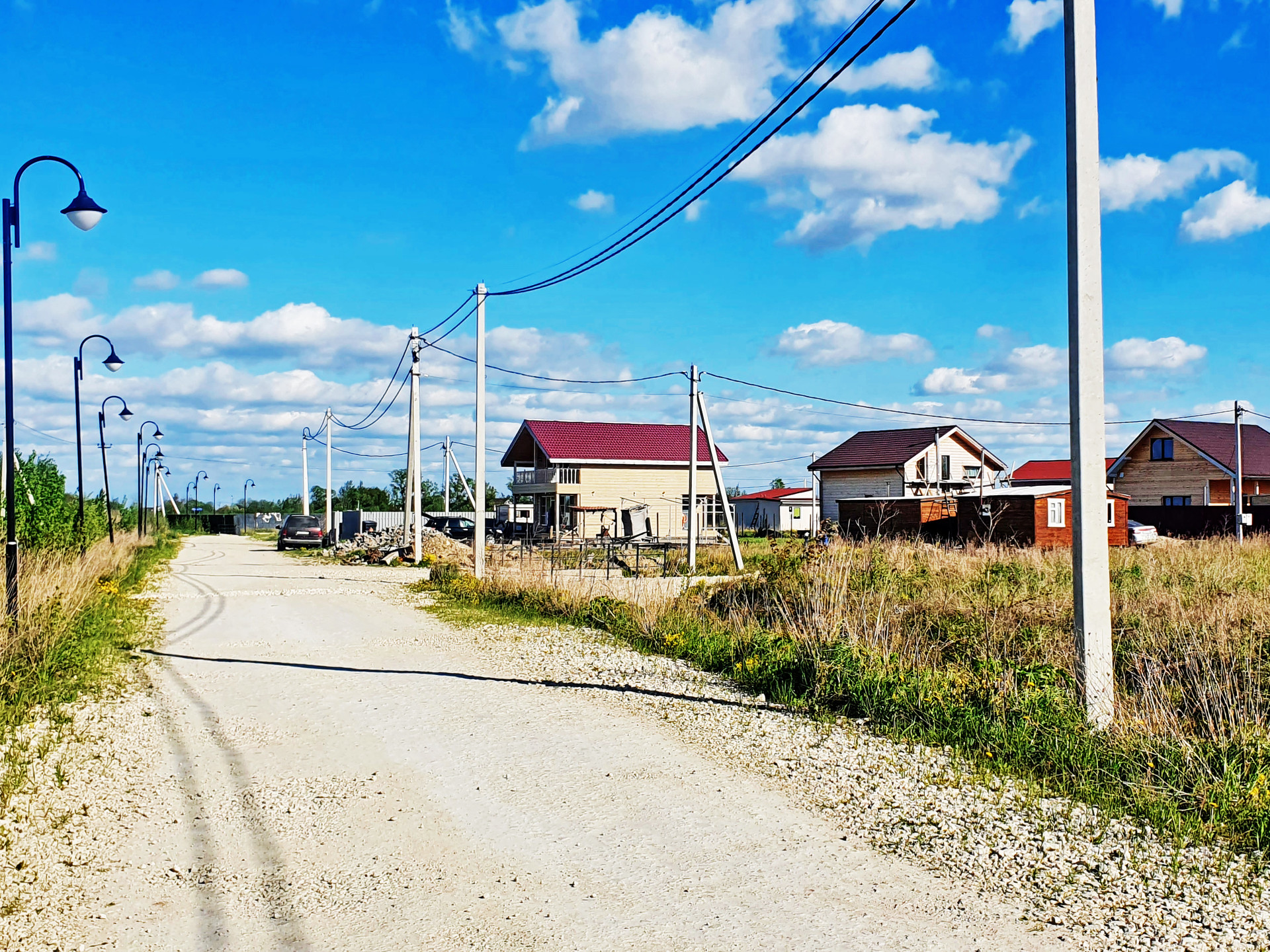 В коттеджном поселке электричество, хорошие дороги, дренаж вдоль дорог, уличное освещение.
