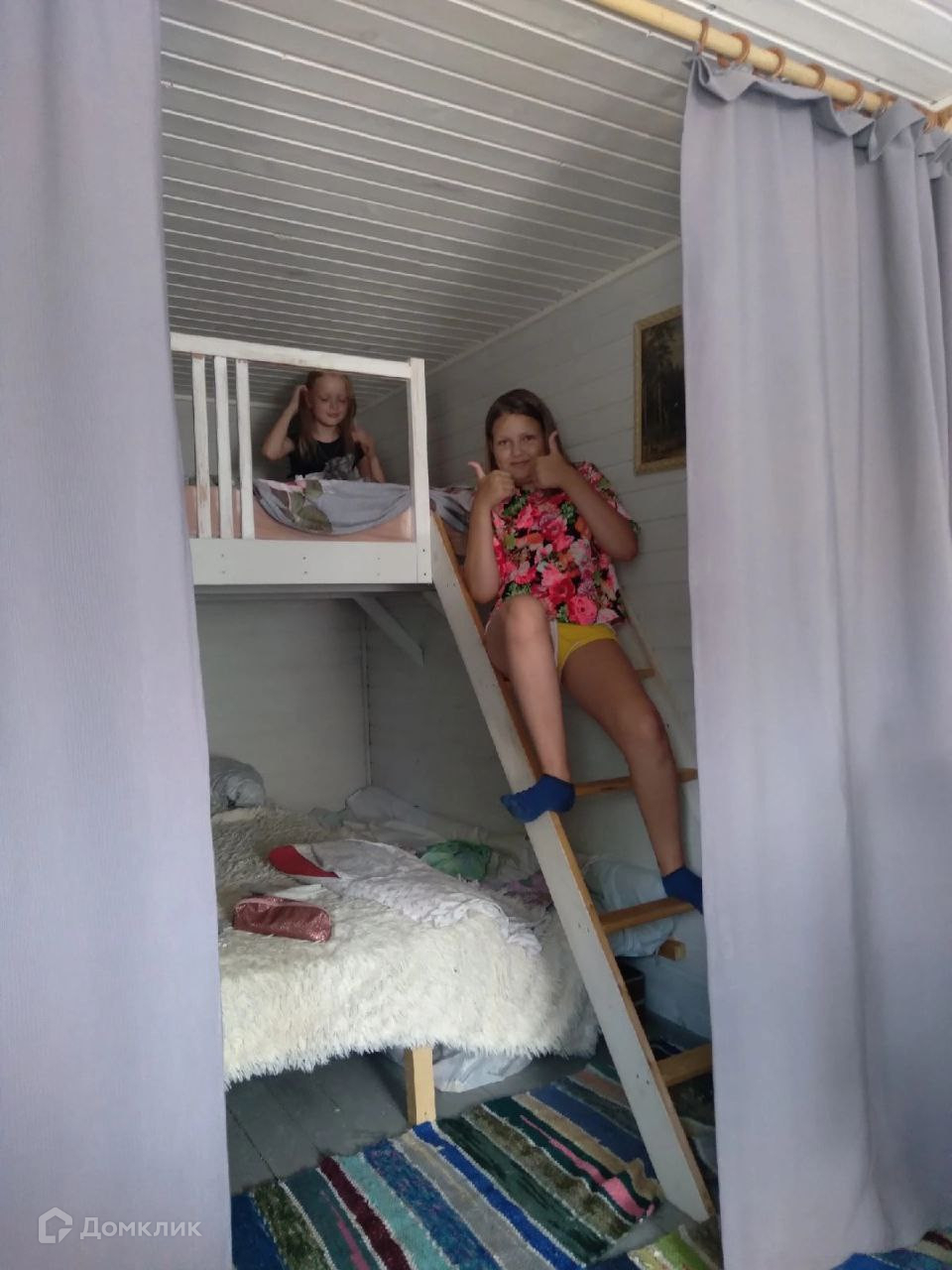 В первом доме расположены коридор, кухня и спальня (разделены между собой шторой), установлена встроенная 2-х ярусная кровать на 5 человек.
