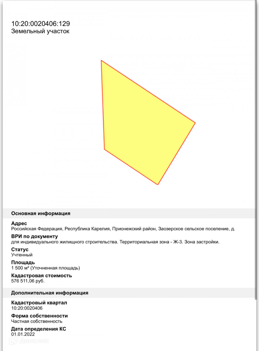 Кадастровый номер участка 10:20:0020406:129.