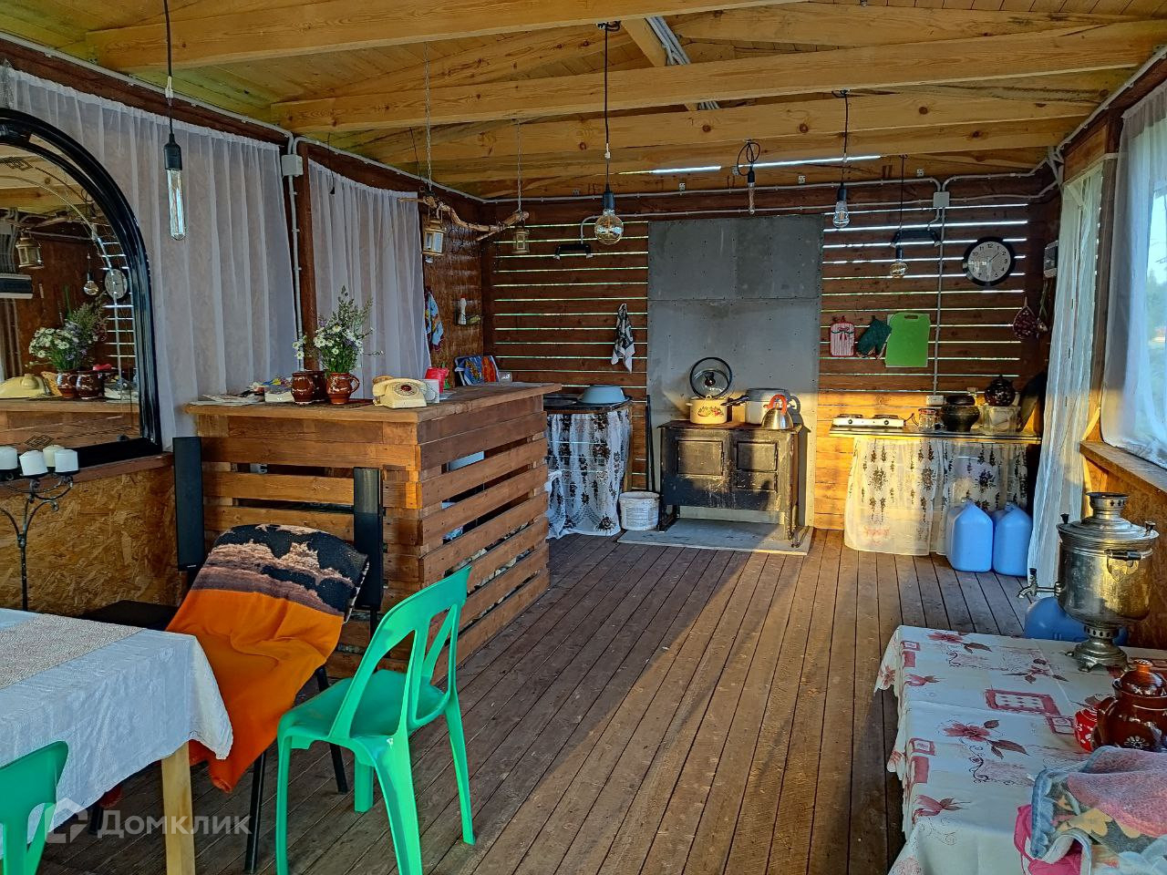 Веранда 7*5 (без окон ). В ней установлена печь, Барная стойка, холодильник. Используется как летняя кухня.Электричество: