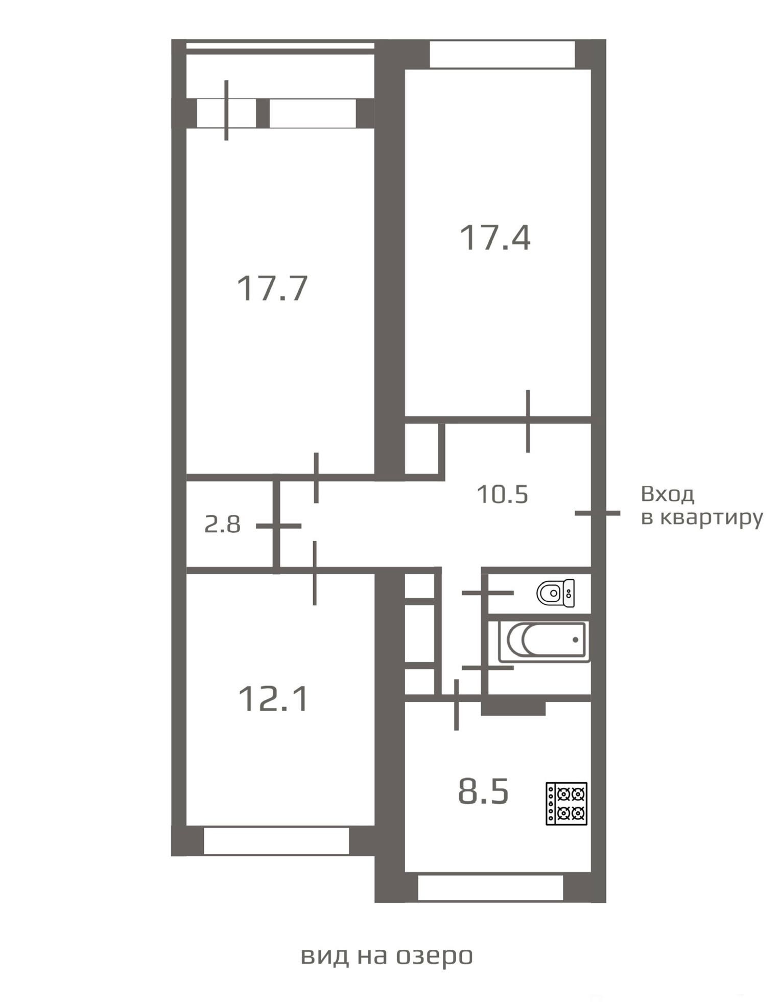 ХАРАКТЕРИСТИКИ КВАРТИРЫ: Общая площадь квартиры 73.1 кв.м., кухня 8.5 кв.м., изолированные комнаты 12.1, 17.4, 17.7 кв.м., широкая прихожая 10.5 кв. м., раздельный санузел, лоджия, кладовая комната.