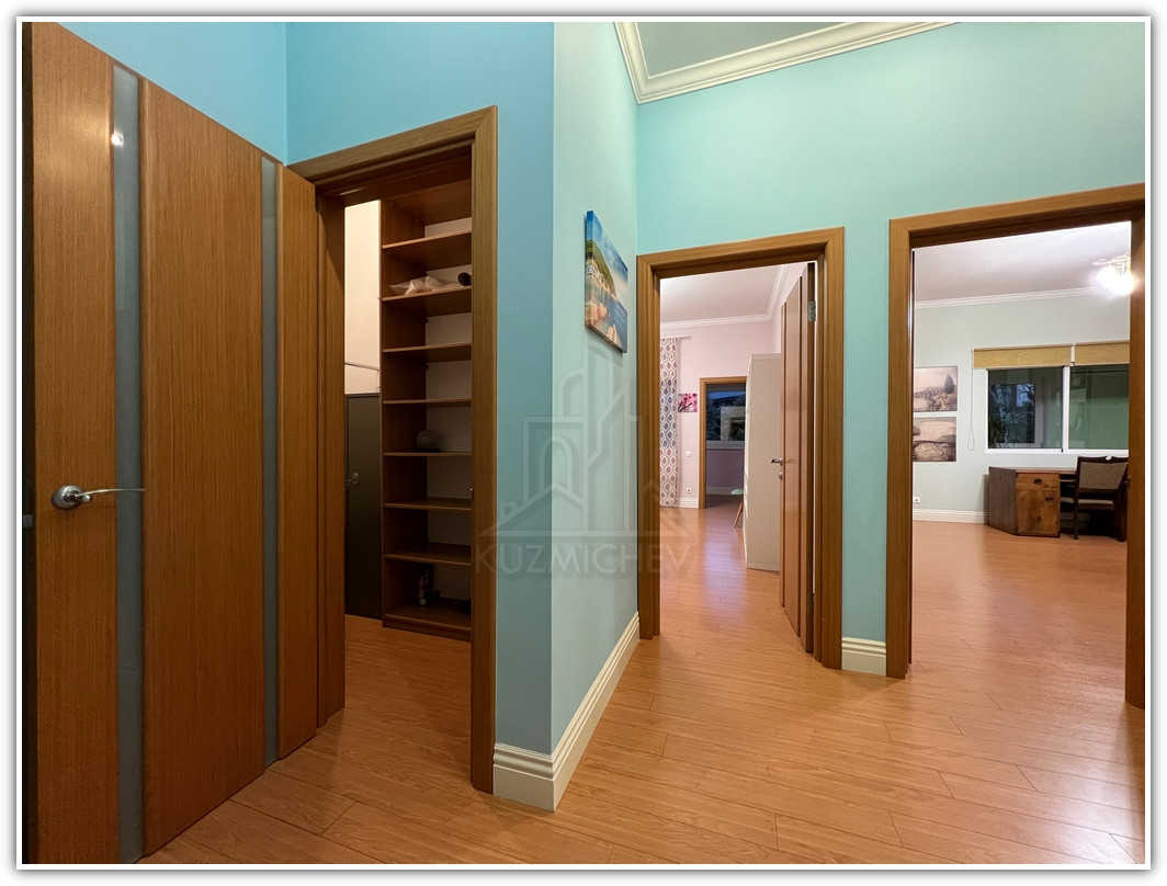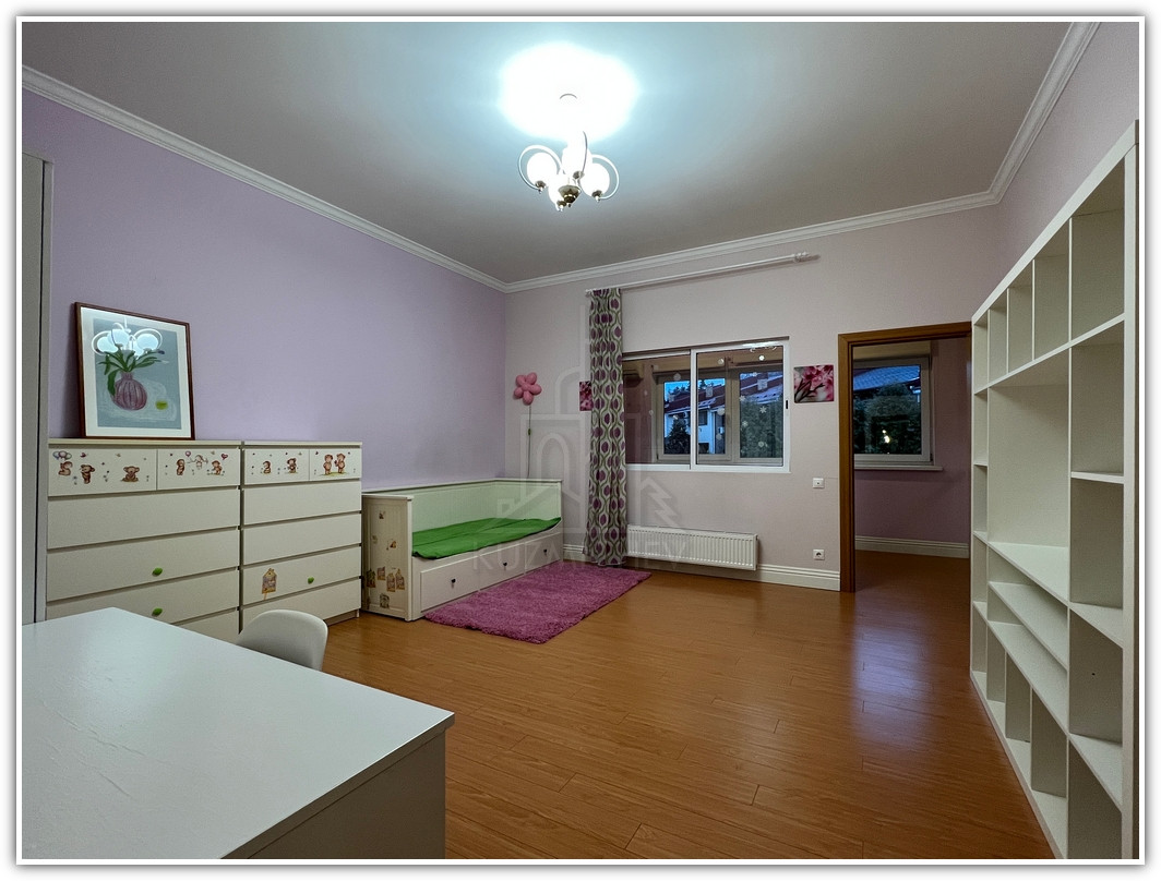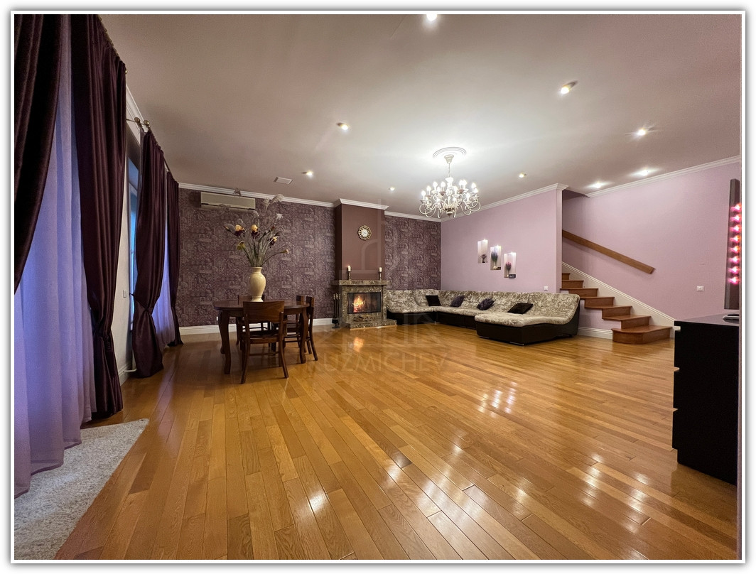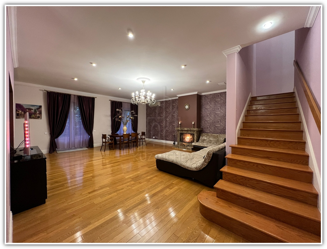 1 этаж: прихожая- 8 кв.м., кухня со всей б/техникой- 15 кв.м., гостиная с камином- 55 кв.м. с выходом в очень зеленый внутренний двор с березами и туями, площадью- 3 сотки, гостевой санузел- 3 кв.м., бойлерная- 5 кв.м., гараж на 2 а/м 31 кв.м. + перед домом своя парковка под навесом на 2 а/м для гостей;