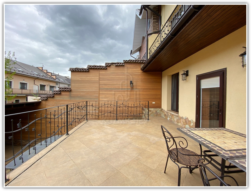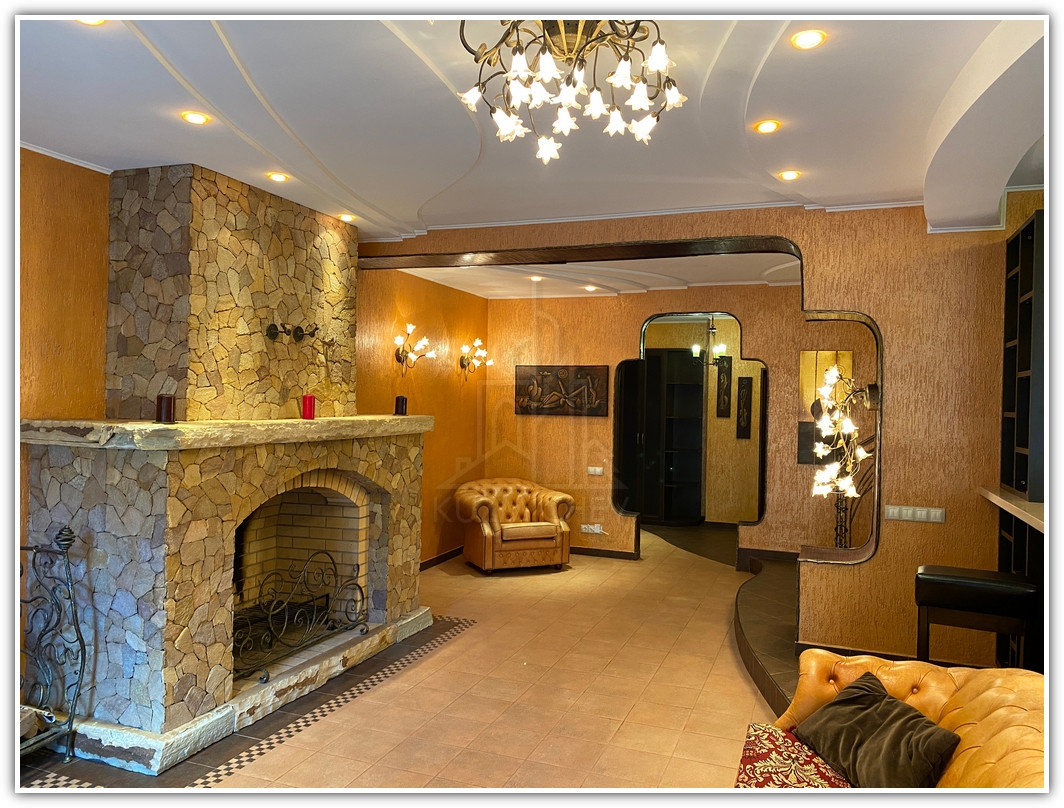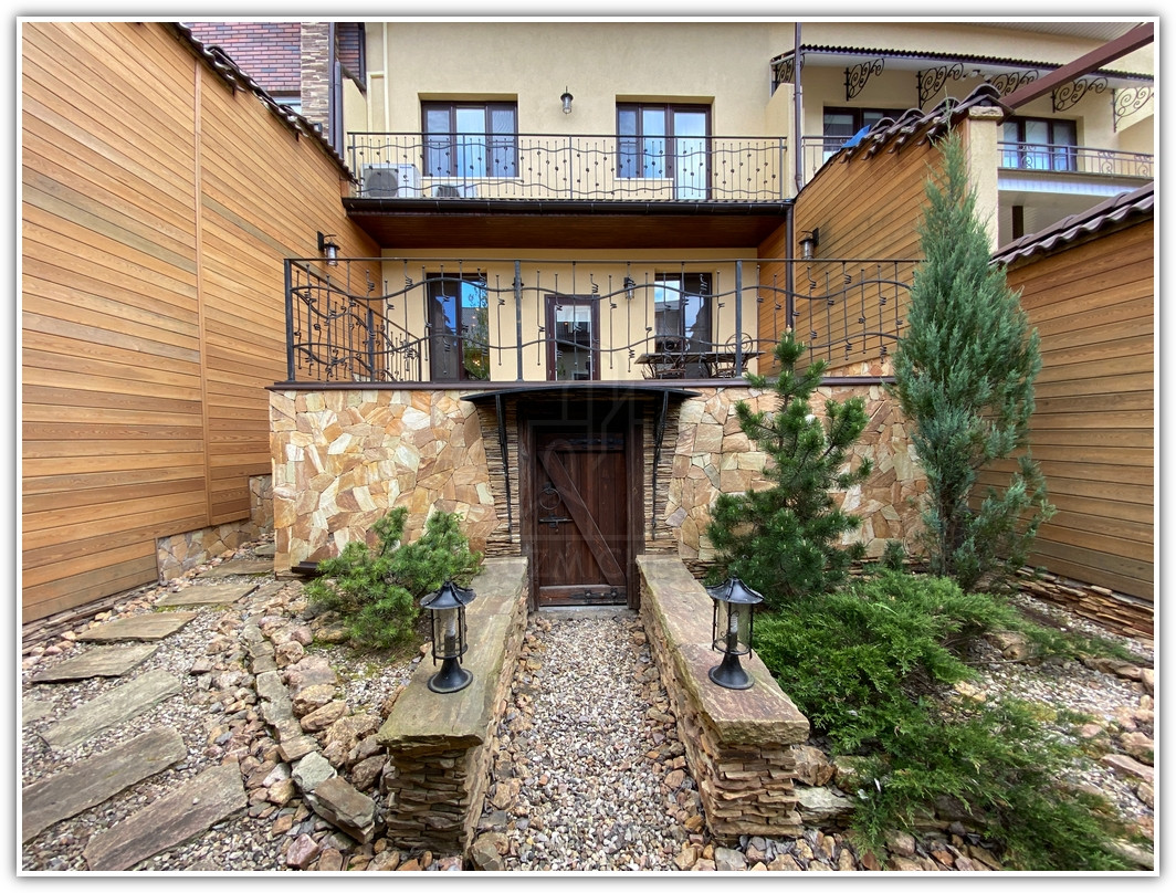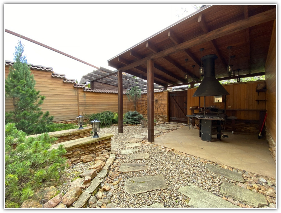 1 этаж: прихожая- 10 кв.м., холл- 10 кв.м., кухня- 14 кв.м., гостиная с камином- 33 кв.м. с выходом на летнюю террасу внутреннего двора- 20 кв.м., гостевой санузел, бойлерная, внутренний двор с навесом и барбекю- 40 кв.м.;