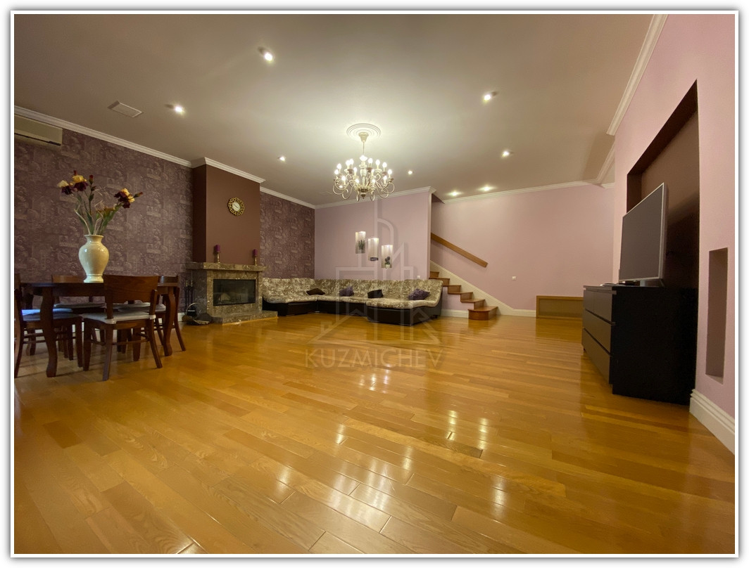 1 этаж: прихожая- 8 кв.м., кухня со всей б/техникой- 15 кв.м., гостиная с камином- 55 кв.м. с выходом в очень зеленый внутренний двор с березами и туями, площадью- 3 сотки, гостевой санузел- 3 кв.м., бойлерная- 5 кв.м., гараж на 2 а/м 31 кв.м. + перед домом своя парковка под навесом на 2 а/м для гостей;