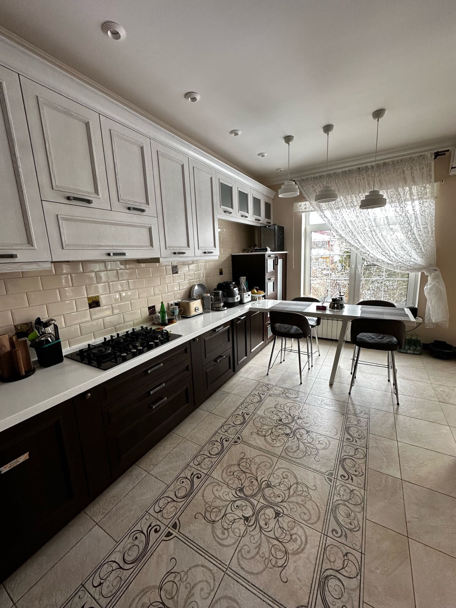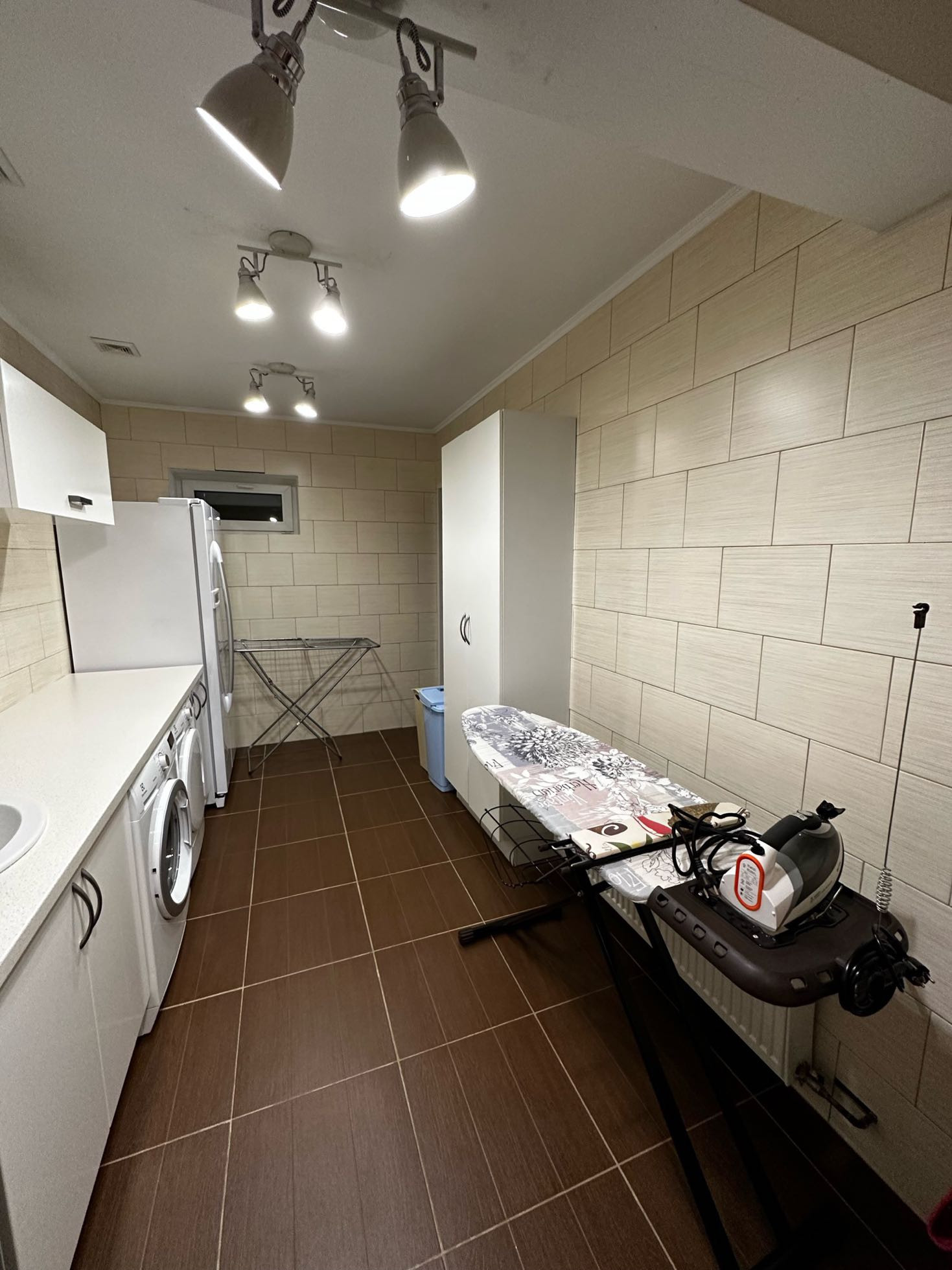 Этаж 1: Прихожая, гостевой с/у с душевой кабиной, постирочная со стиральной и сушильной машинами, с несколькими холодильниками и морозильными камерами, большое подсобное помещение, бойлерная с отдельным входом, кухня-гостиная, общей площадью 78.5 м2 и выходом во двор с зоной барбекю. Кухня укомплектована встроенной современной техникой и мебелью. Внутренний двор выровнен, высажен газон, вдоль забора плодоносят вишня, слива, черная смородина, виноград. От соседей участок огражден высаженными Туями.