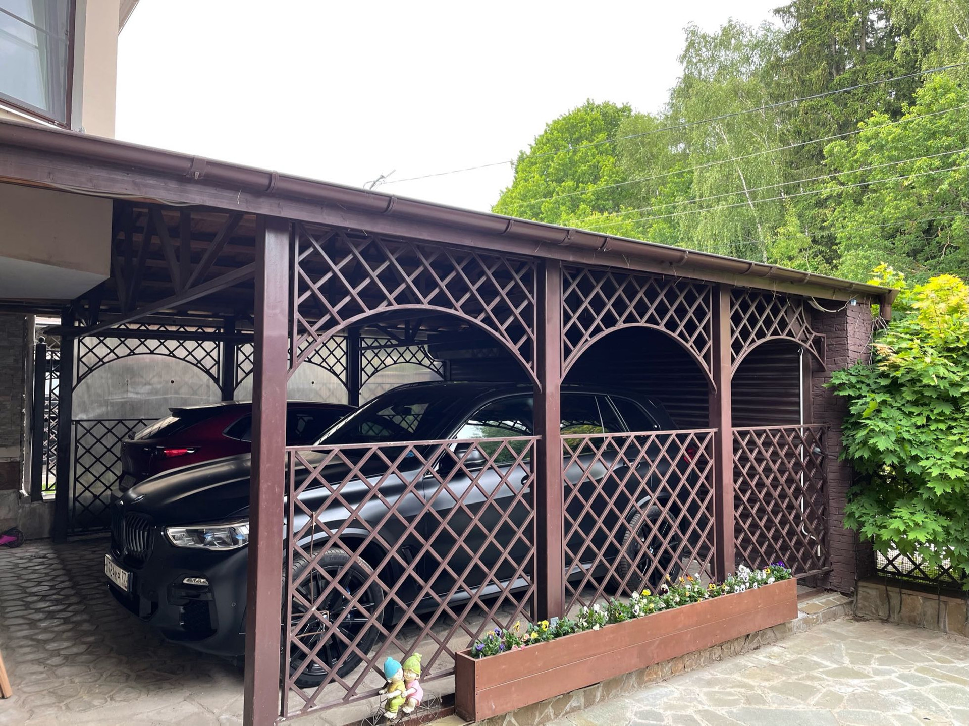 Навес для 2 авто, оборудованный рольставнями. +Крытый, утеплённый гараж для 1 авто, с выходом из дома большое подсобное помещение, бойлерная с отдельным входом (6 м2).