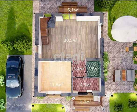 Планировка: 3 спальни (47,8 м2), 2 санузла (6 м2), кухня-гостиная (30,5 м2), холлы (15,3 м2), ТЕРАССЫ (5 м2).