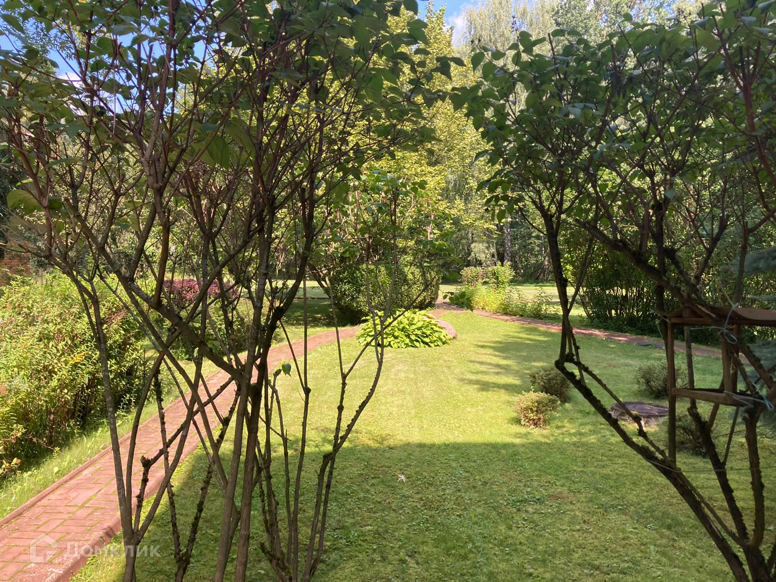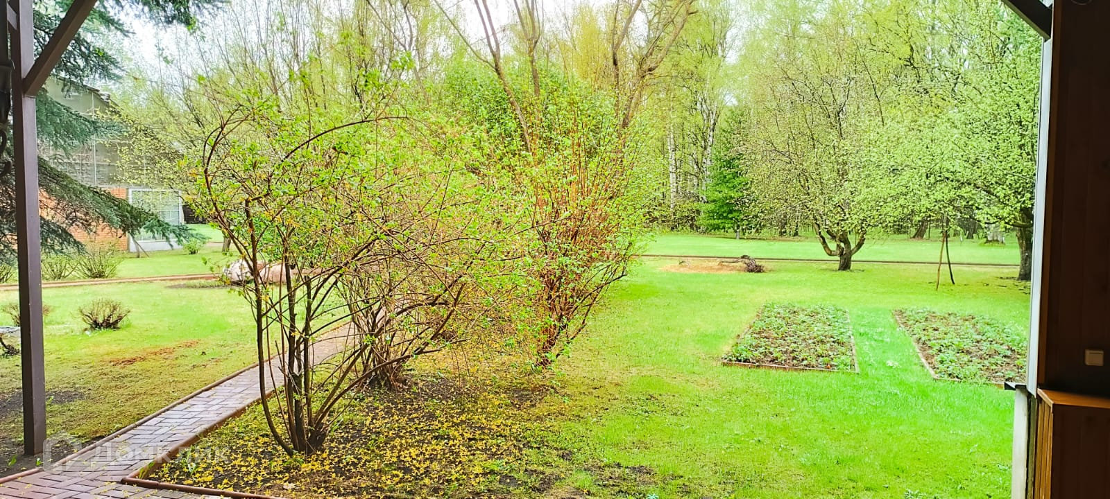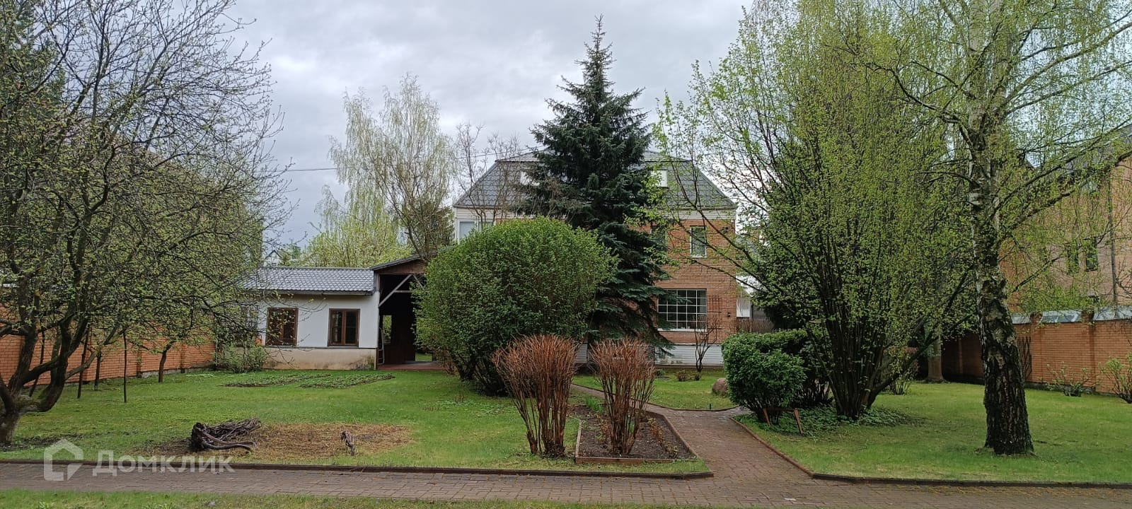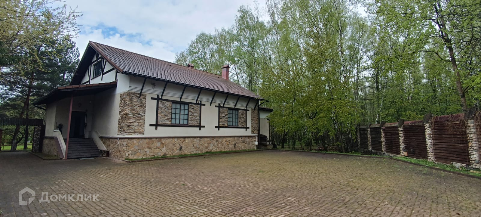 Двор выложен тротуарной плиткой. Большое место для парковки автомобилей. На участе кустарники и деревья. Рядом лес с прогулочными тропами и современный парк.