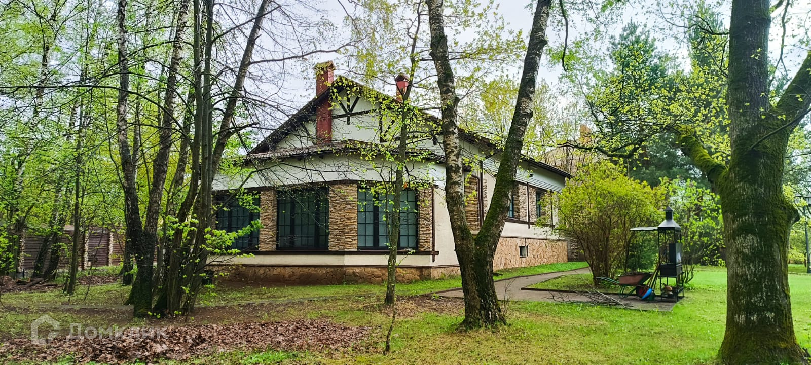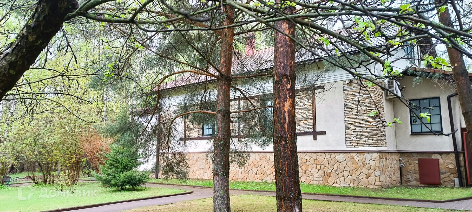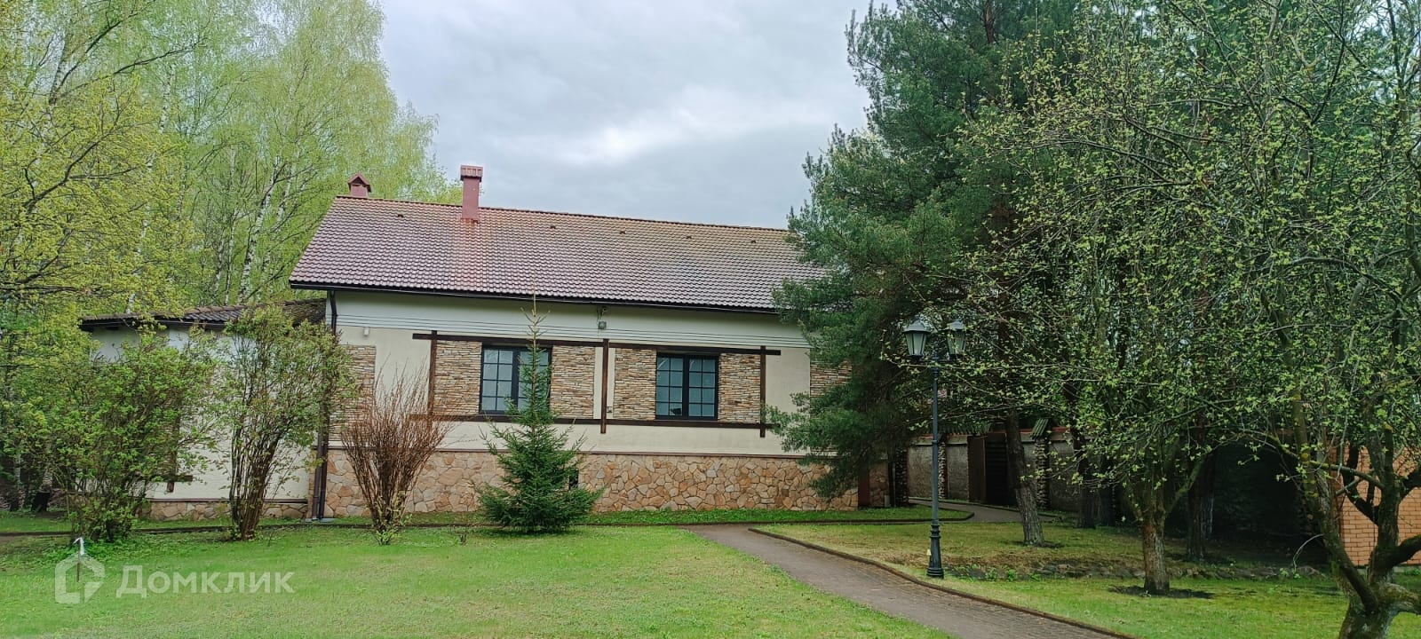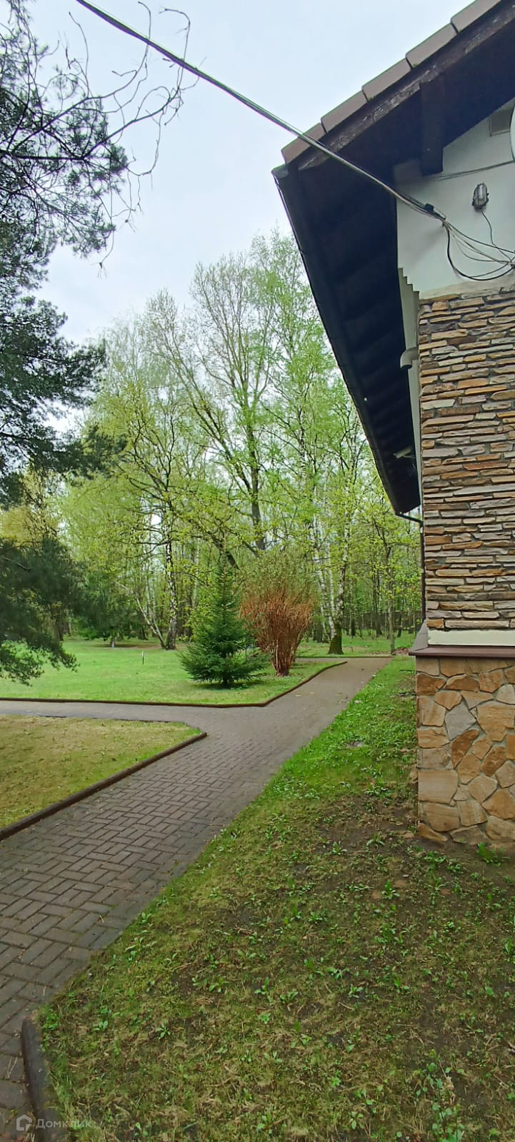 Двор выложен тротуарной плиткой. Большое место для парковки автомобилей. На участе кустарники и деревья. Рядом лес с прогулочными тропами и современный парк.