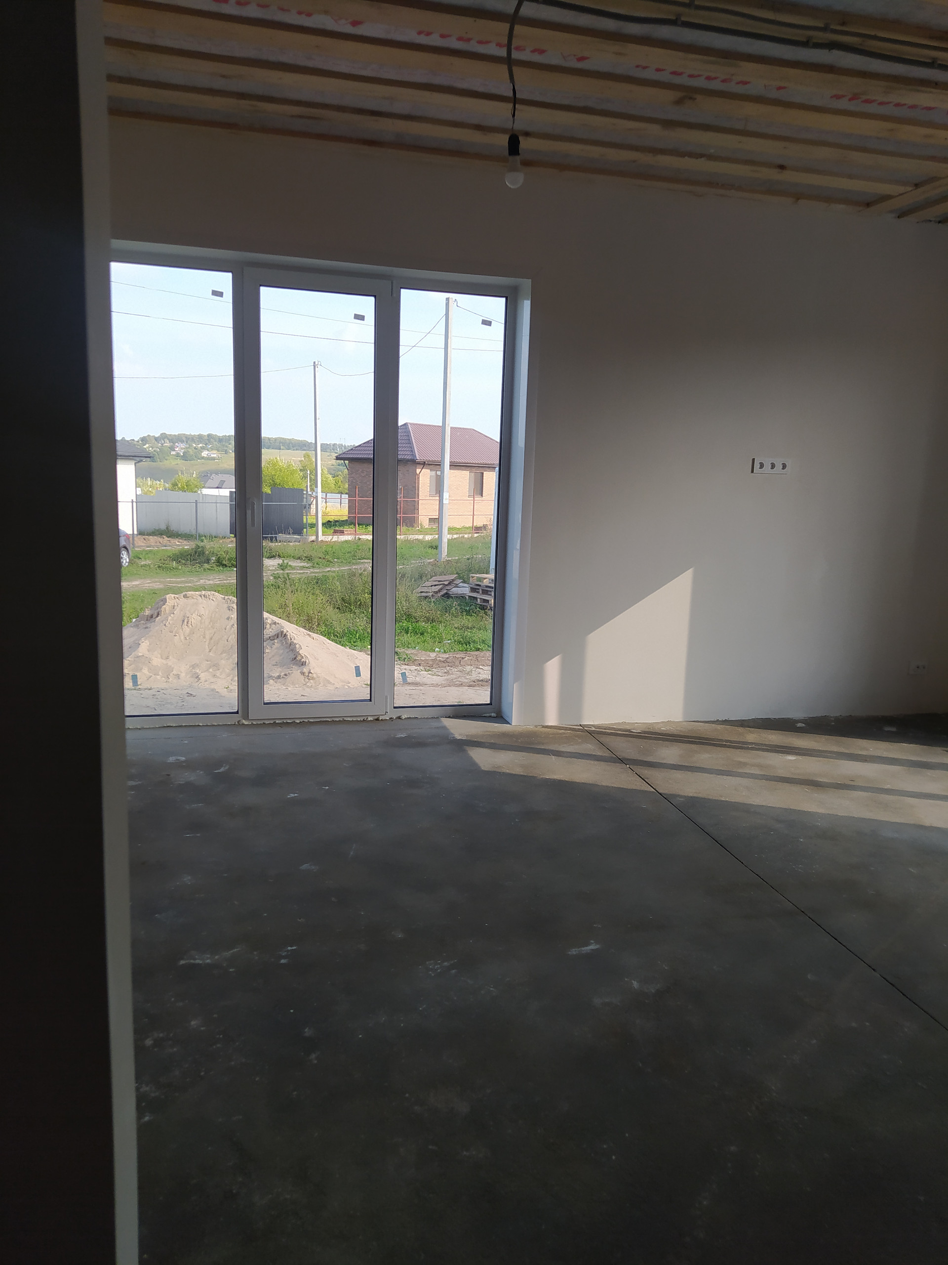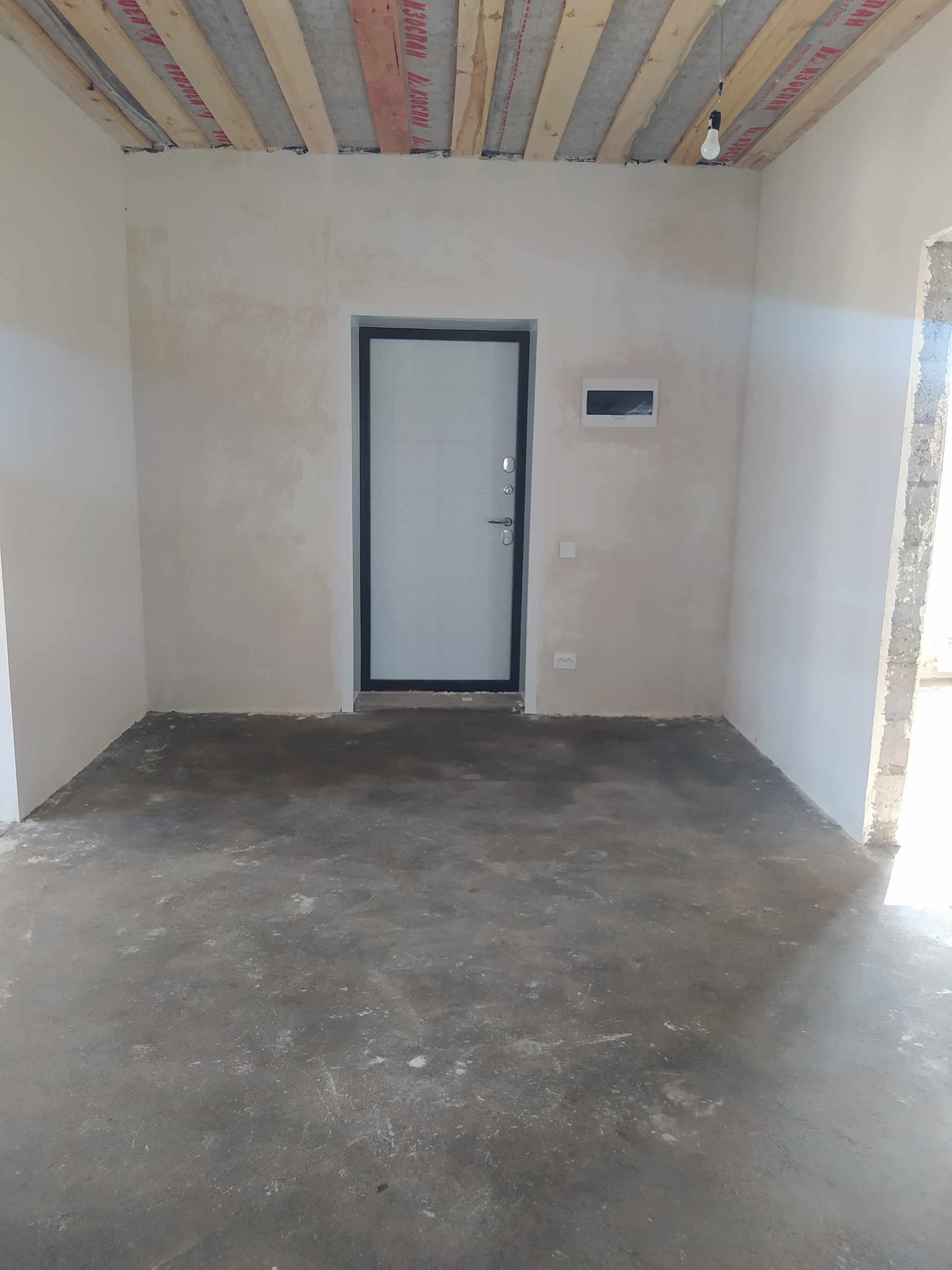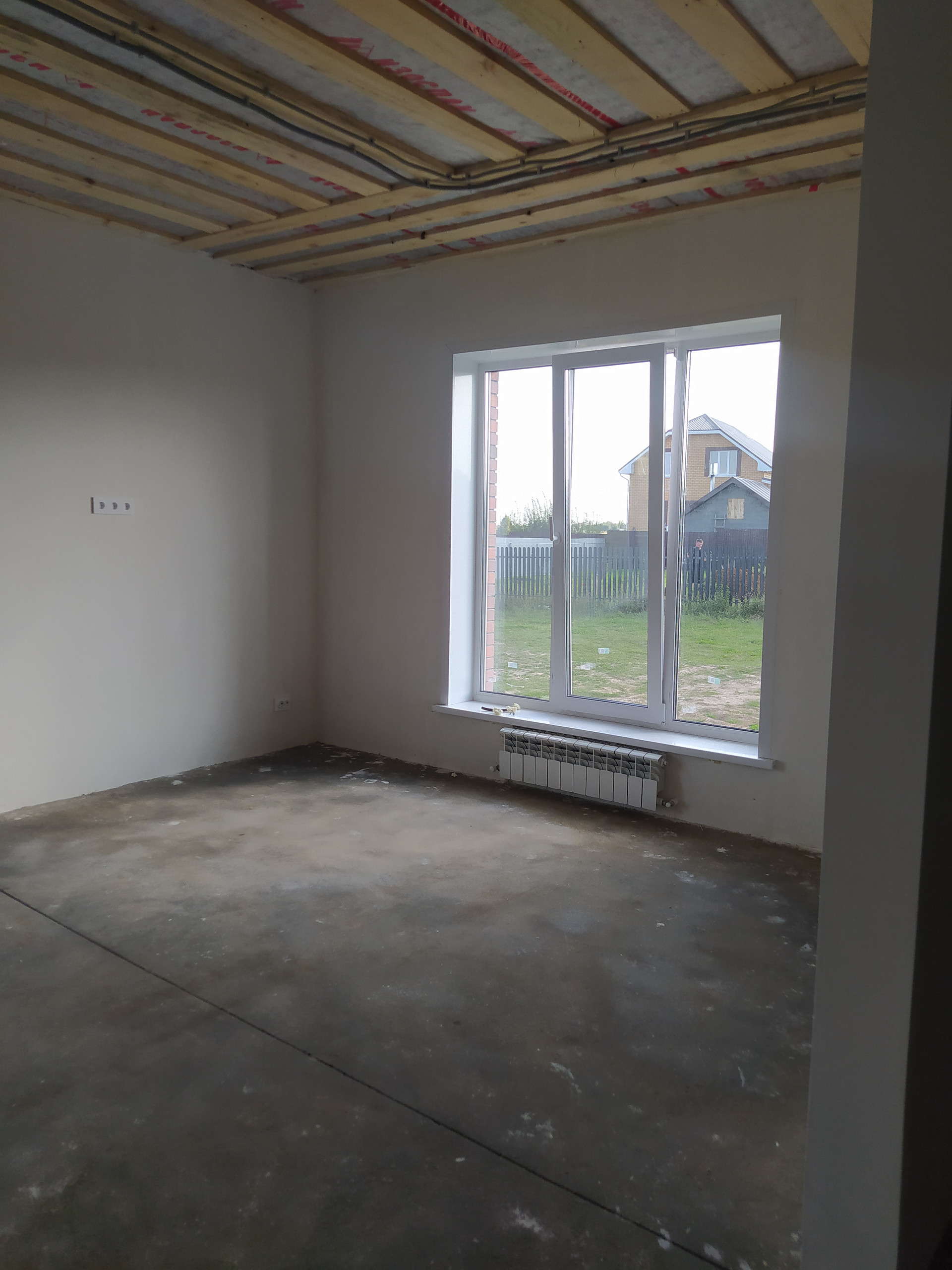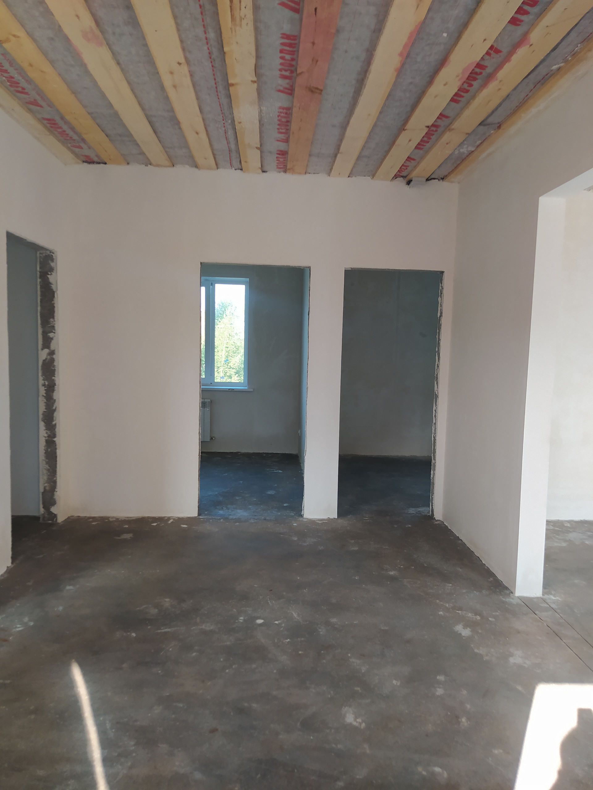 В доме предчистовая отделка, стены в е выровнены, оштукатурены и ошпаклеваны, можно клеить обои.