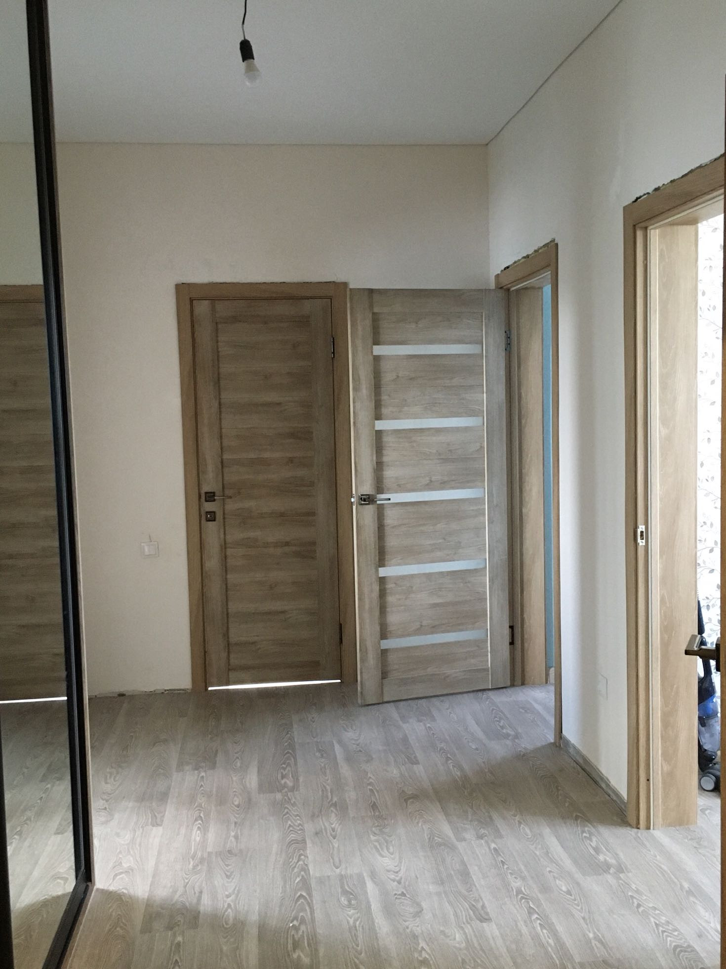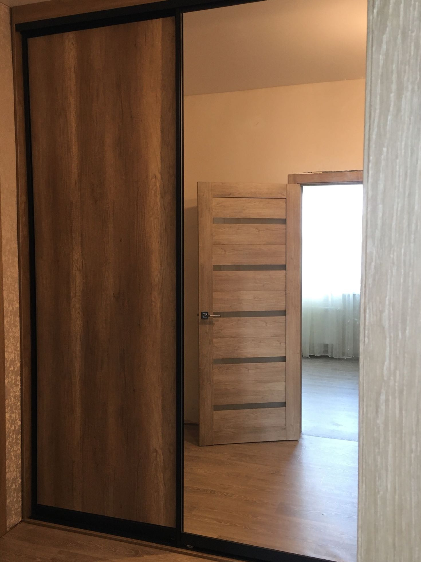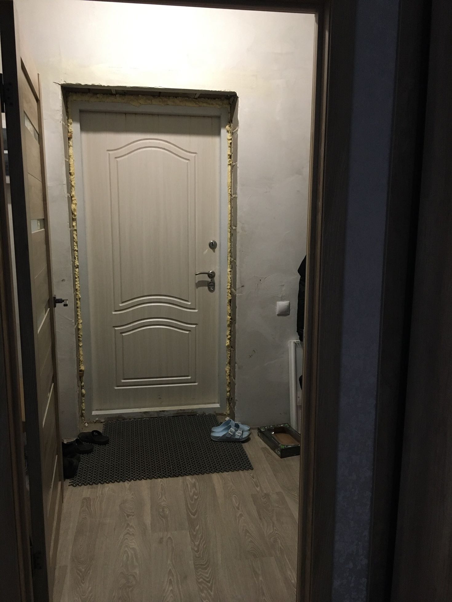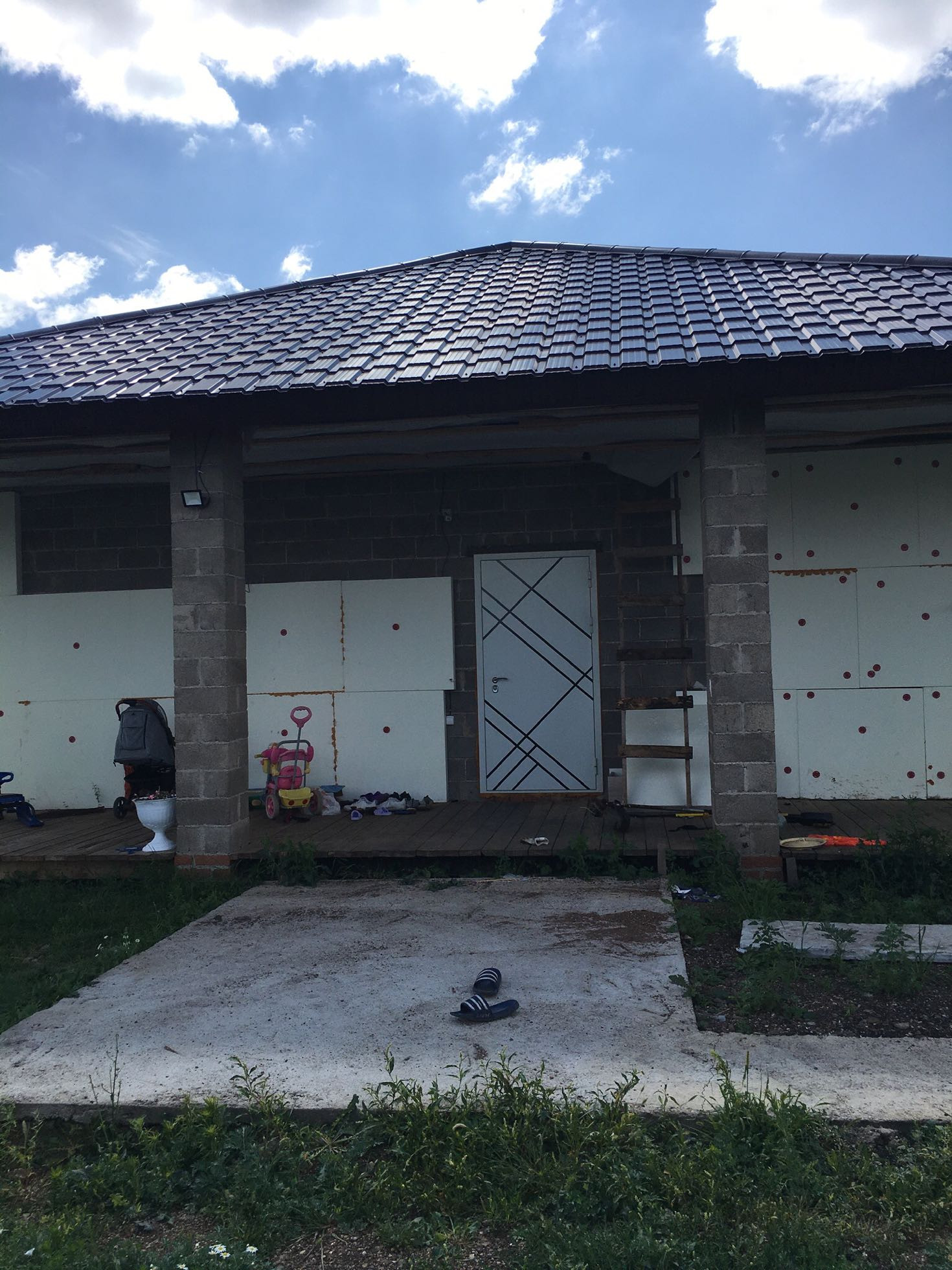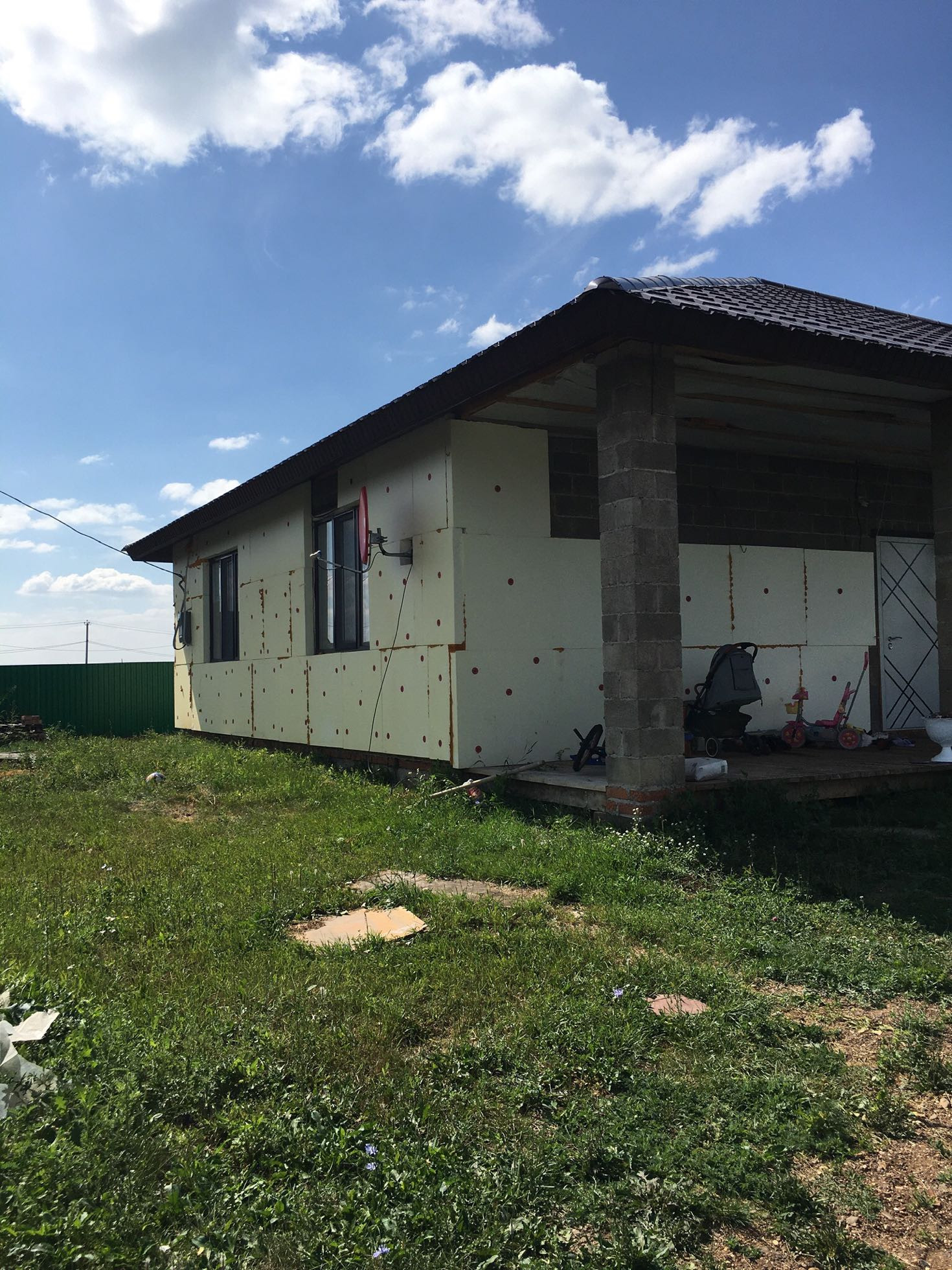 В коридоре большой встроенный шкаф-купе. Дом утеплен, но без финишной отделки. Широкая веранда под общей крышей.