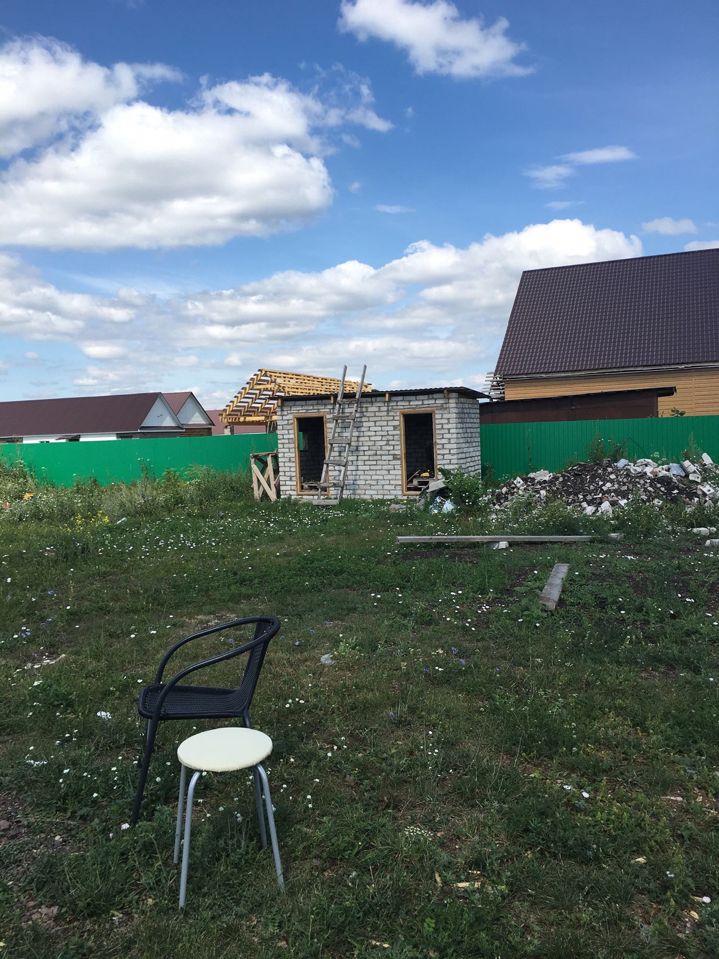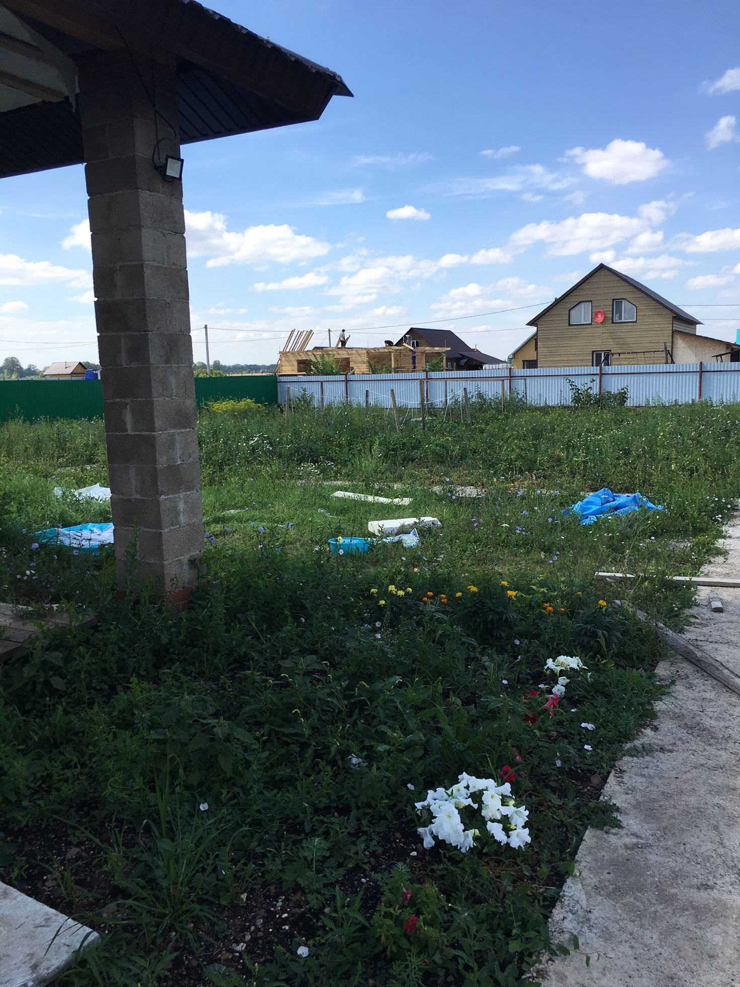 Ровный квадратный участок 40*40м. На участке небольшая постройка для сарая или курятника. Выкопан фундамент под баню. Залита бетонная дорожка по участку. Забор по всему периметру.