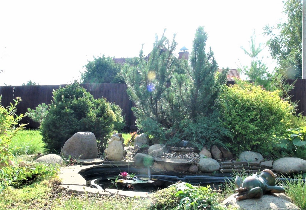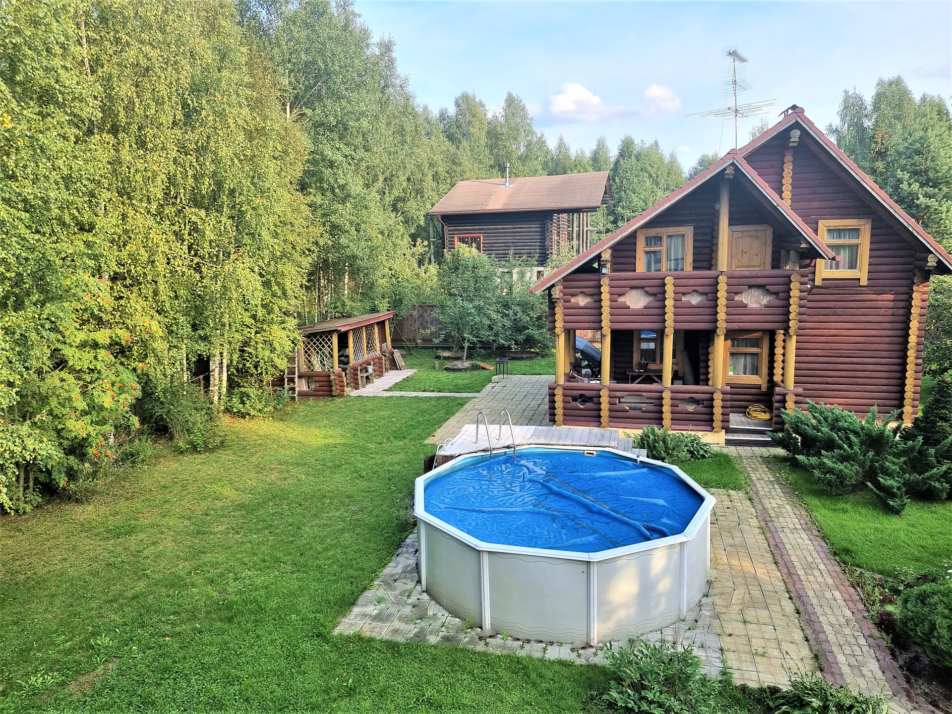Организована дренажная система, отмостка, дорожки - натуральный камень и плитка, площадка для отдыха и барбекю, беседка с мангалом, бассейн.