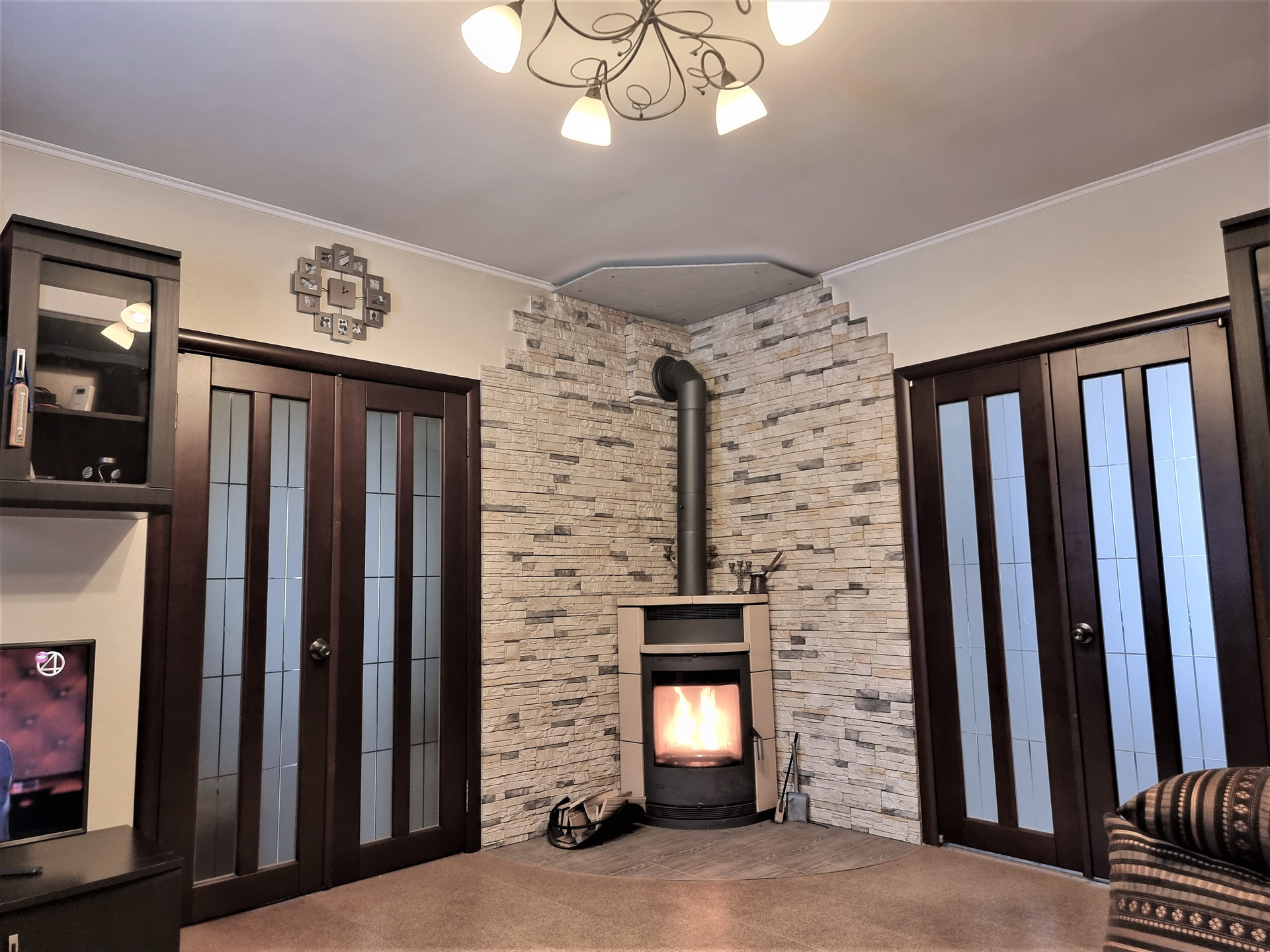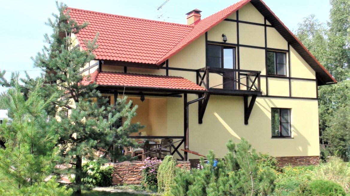 1 этаж: просторный холл с встроенными шкафами, большая гостиная с дровяным камином, кухня-столовая с выходом на веранду, спальня, санузел, бойлерная.