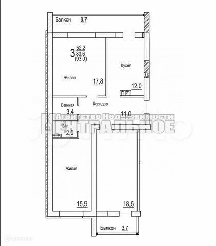 Жилая площадь 52.2 м2