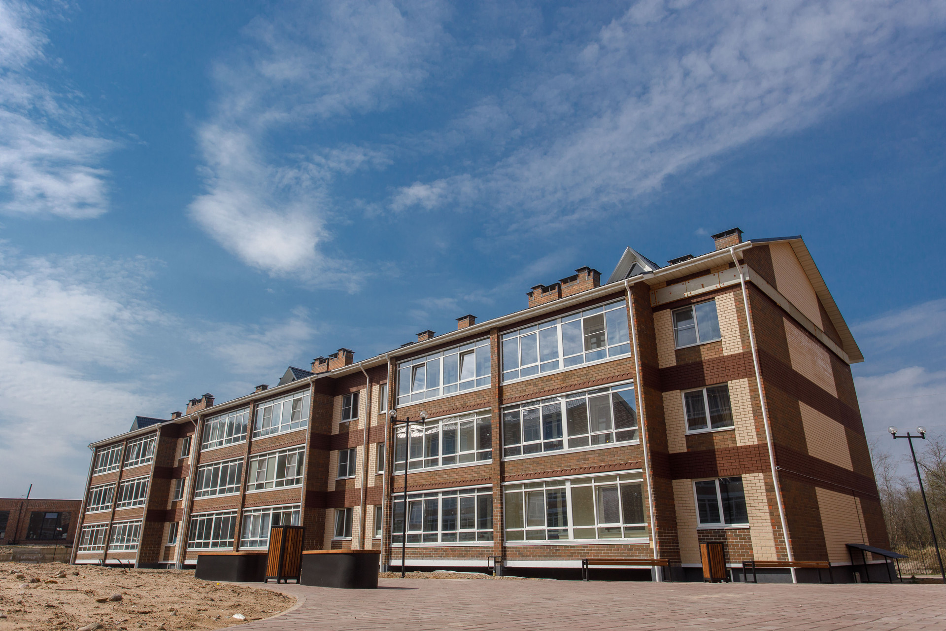Благоустроенная территория со скверами, спортивными площадками и зоной барбекю.