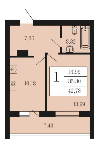 Общая площадь 42.73 м2