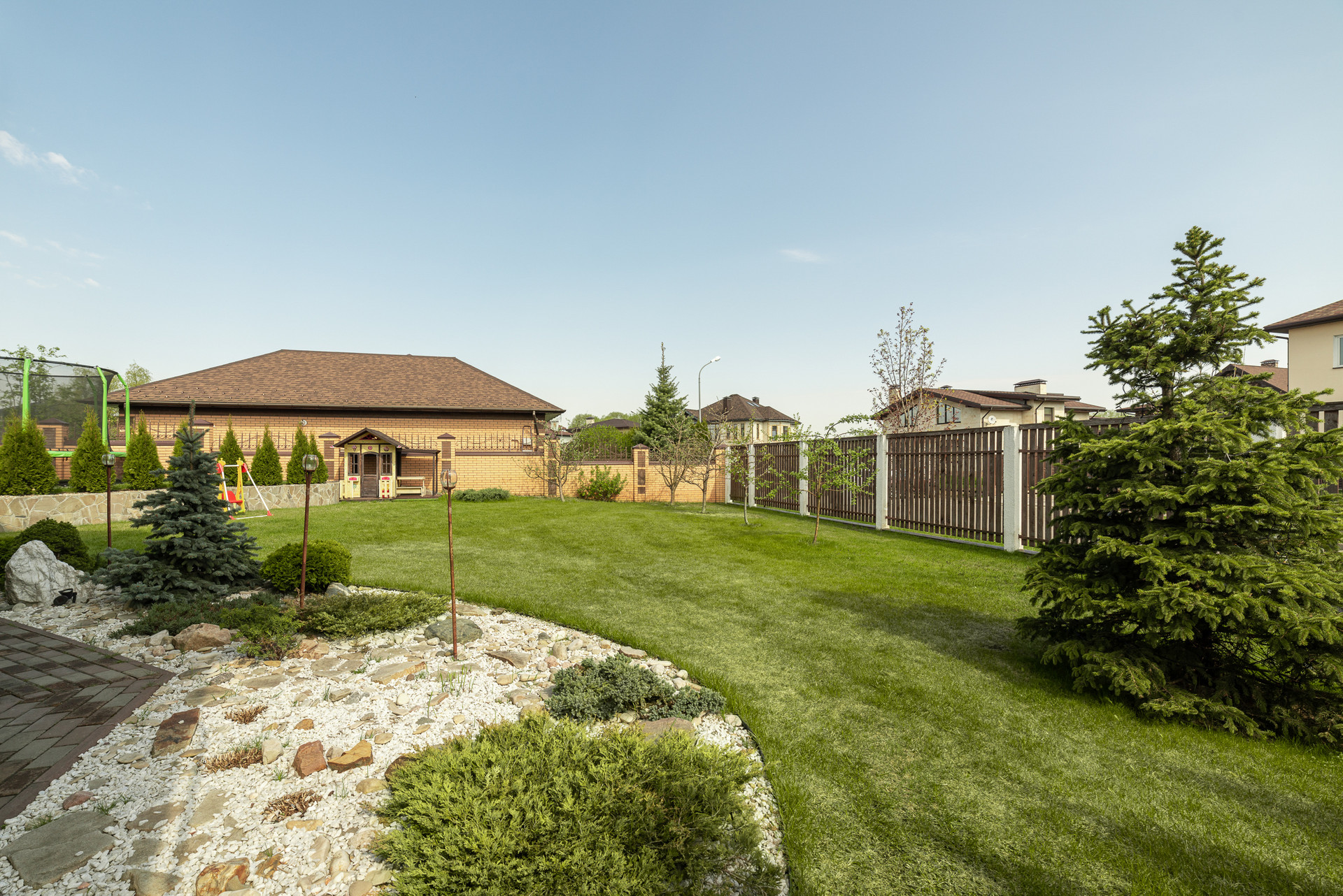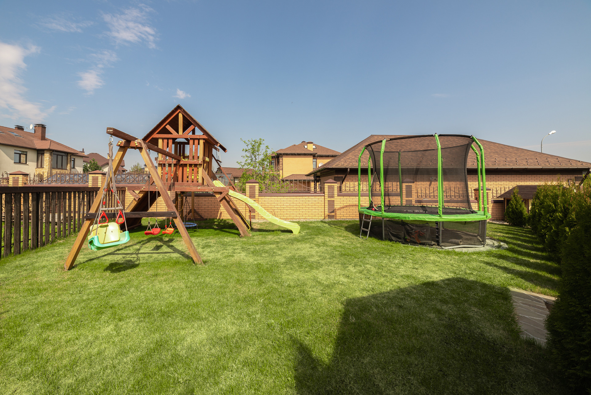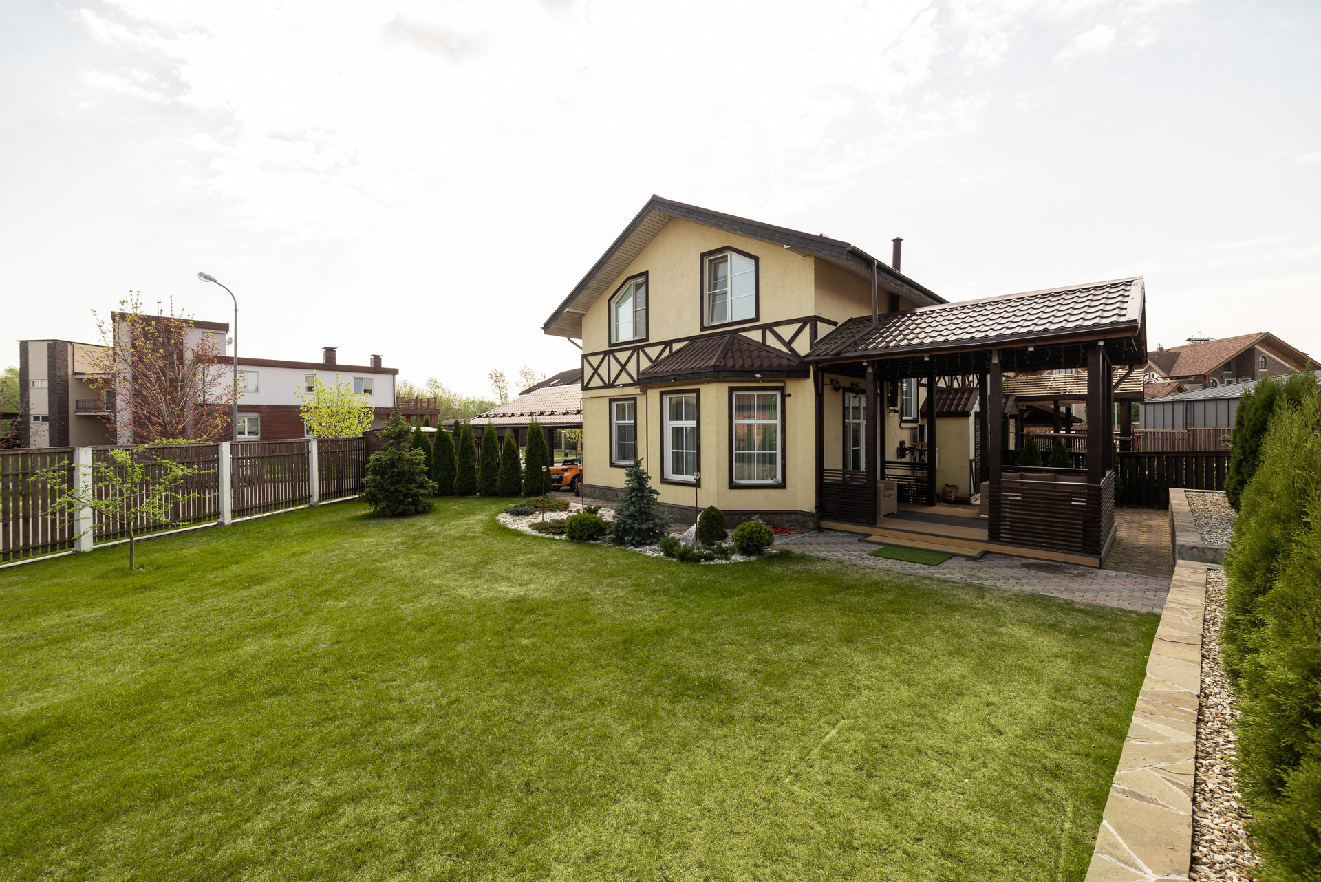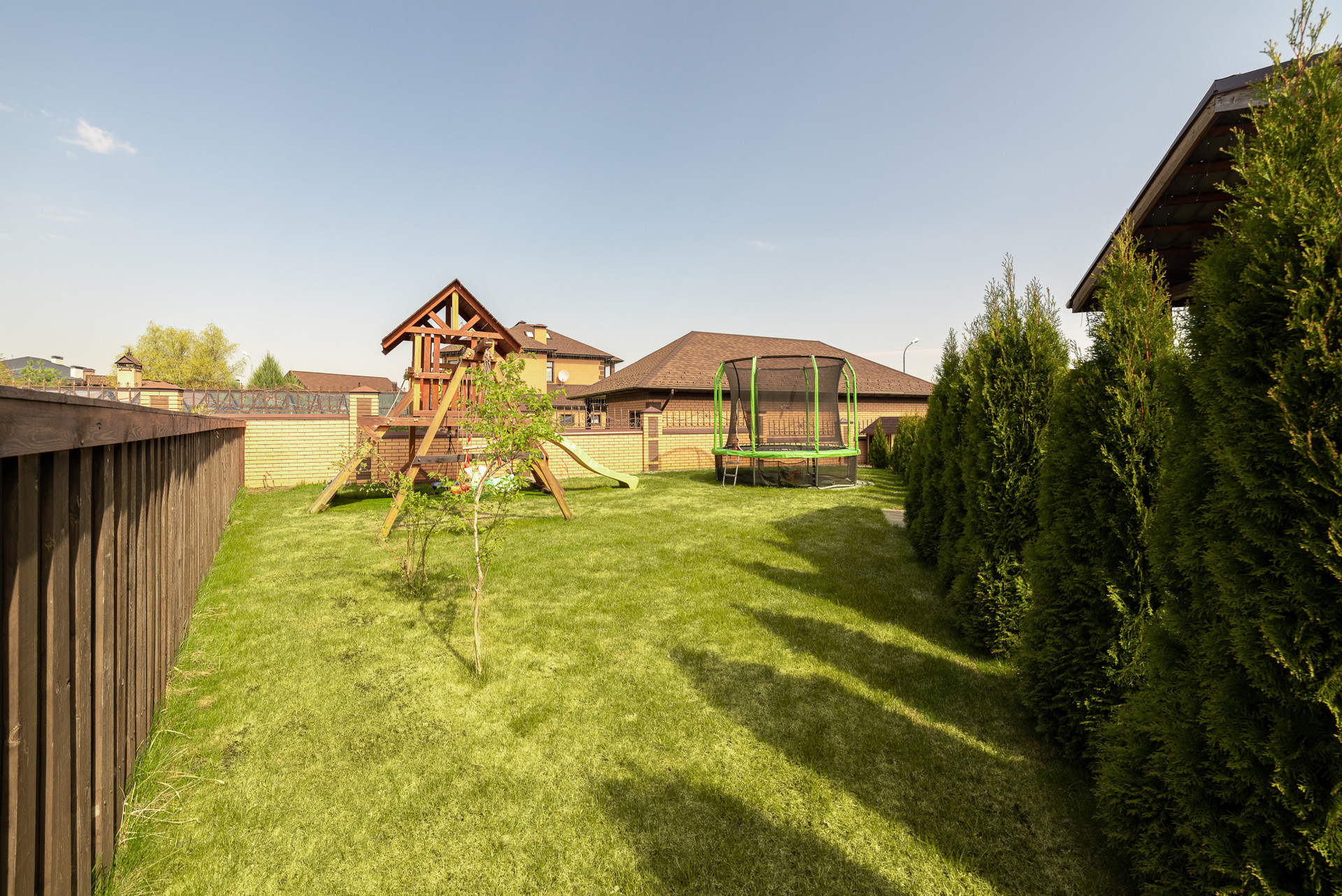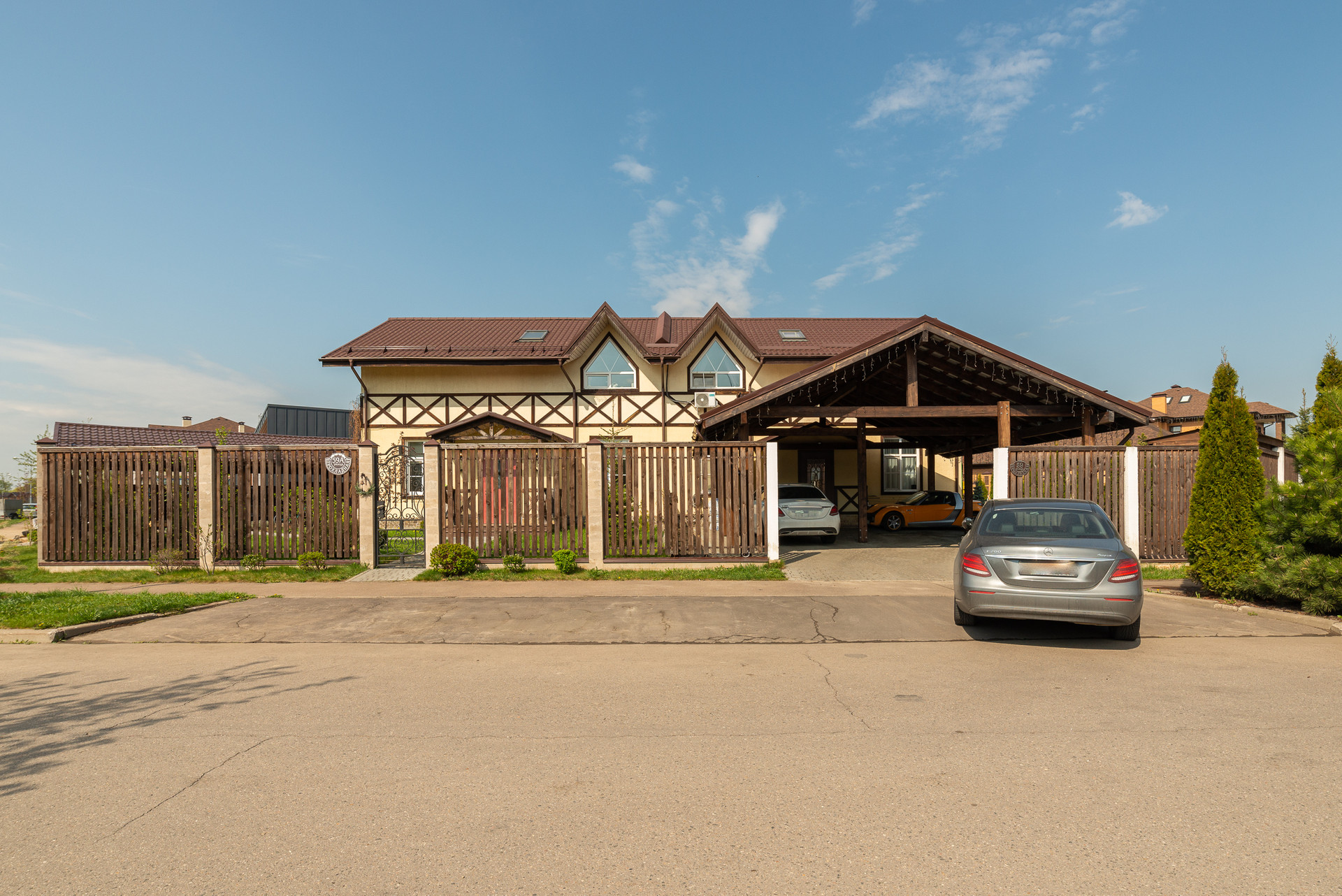 Перед домом навес на несколько машин.  Внутренний двор с ландшафтным проектом, спортивный газон, качели и горки для детей, терраса и барбекю для взрослых. Удобно выходить из кухни-гостиной во двор. На свежем воздухе находиться так же комфортно как внутри дома.