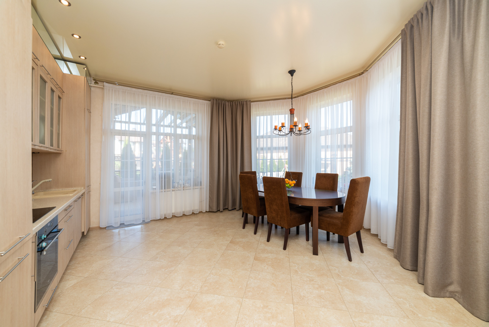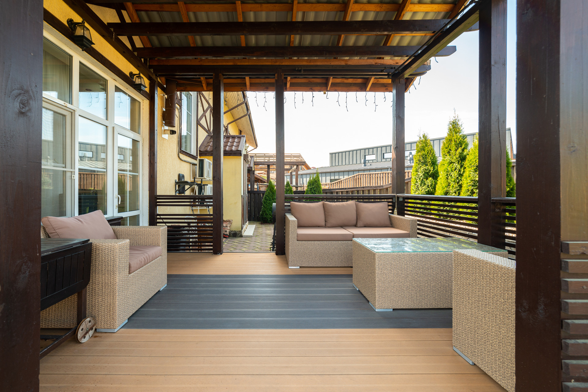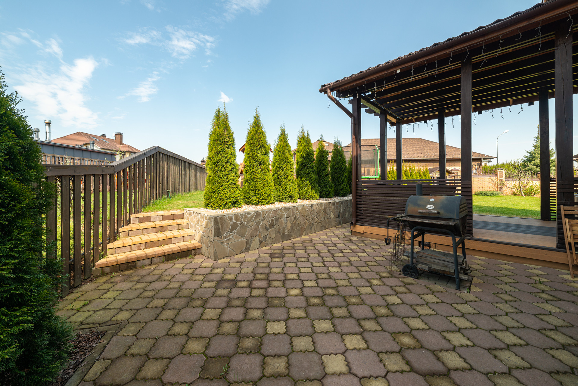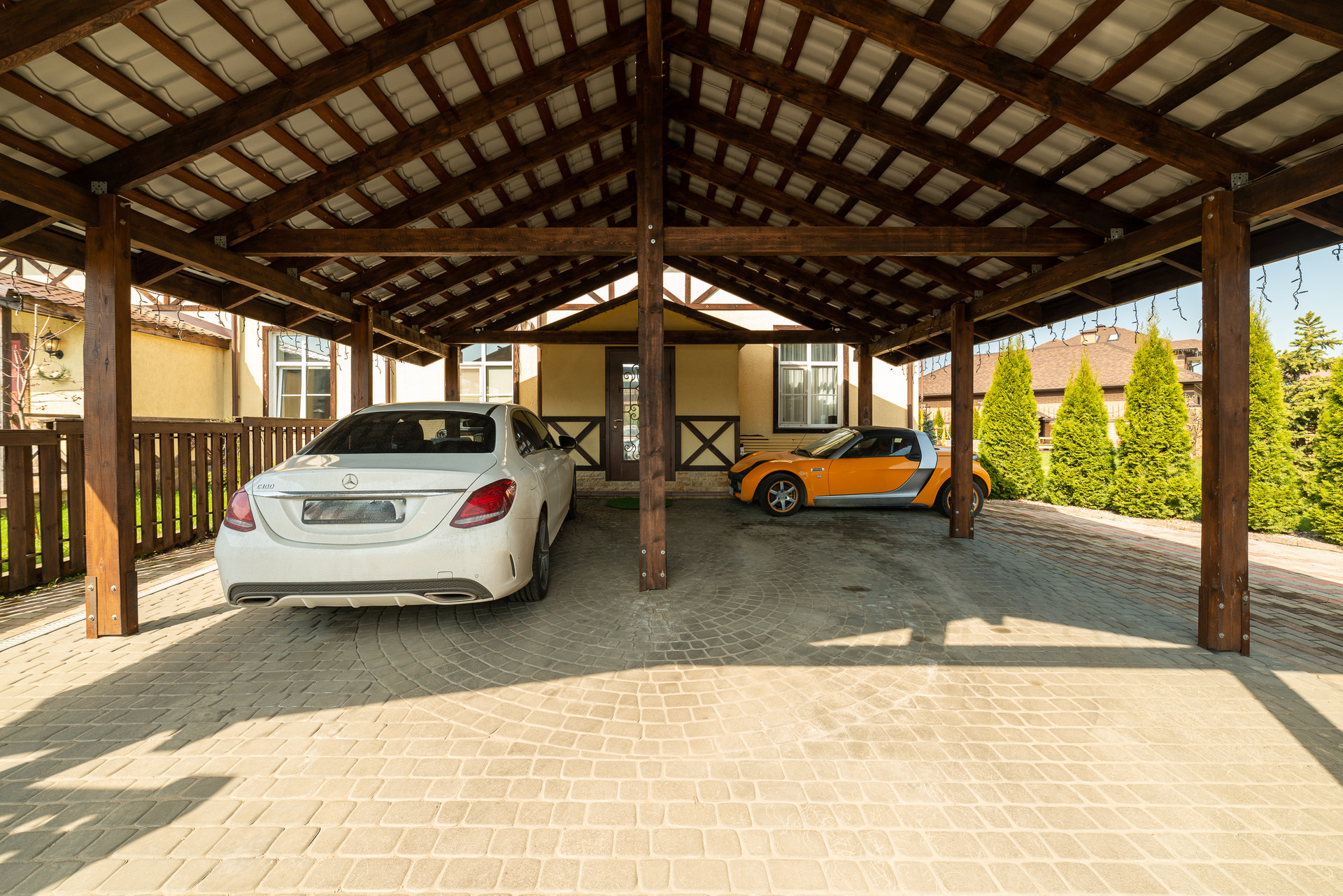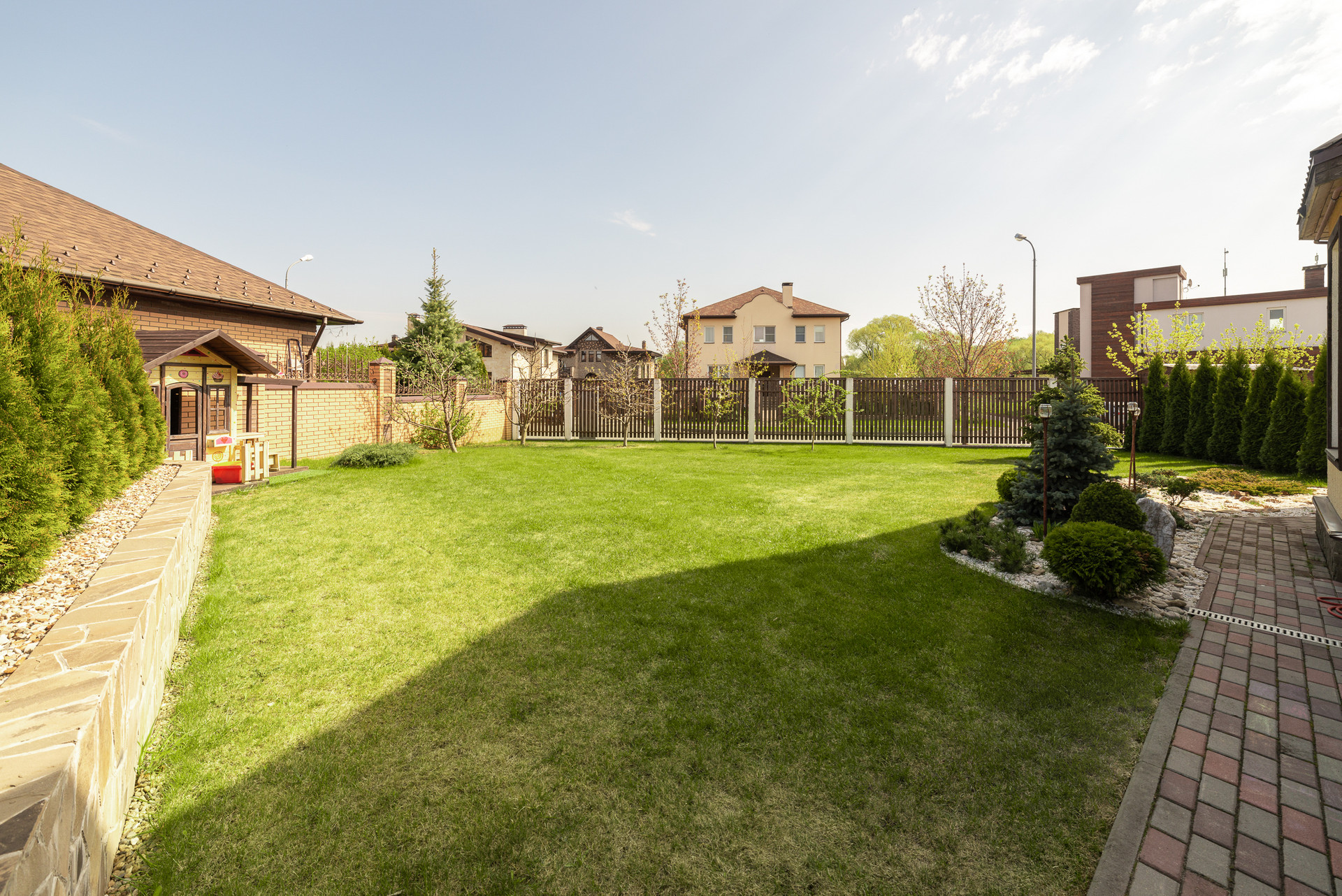 Перед домом навес на несколько машин.  Внутренний двор с ландшафтным проектом, спортивный газон, качели и горки для детей, терраса и барбекю для взрослых. Удобно выходить из кухни-гостиной во двор. На свежем воздухе находиться так же комфортно как внутри дома.