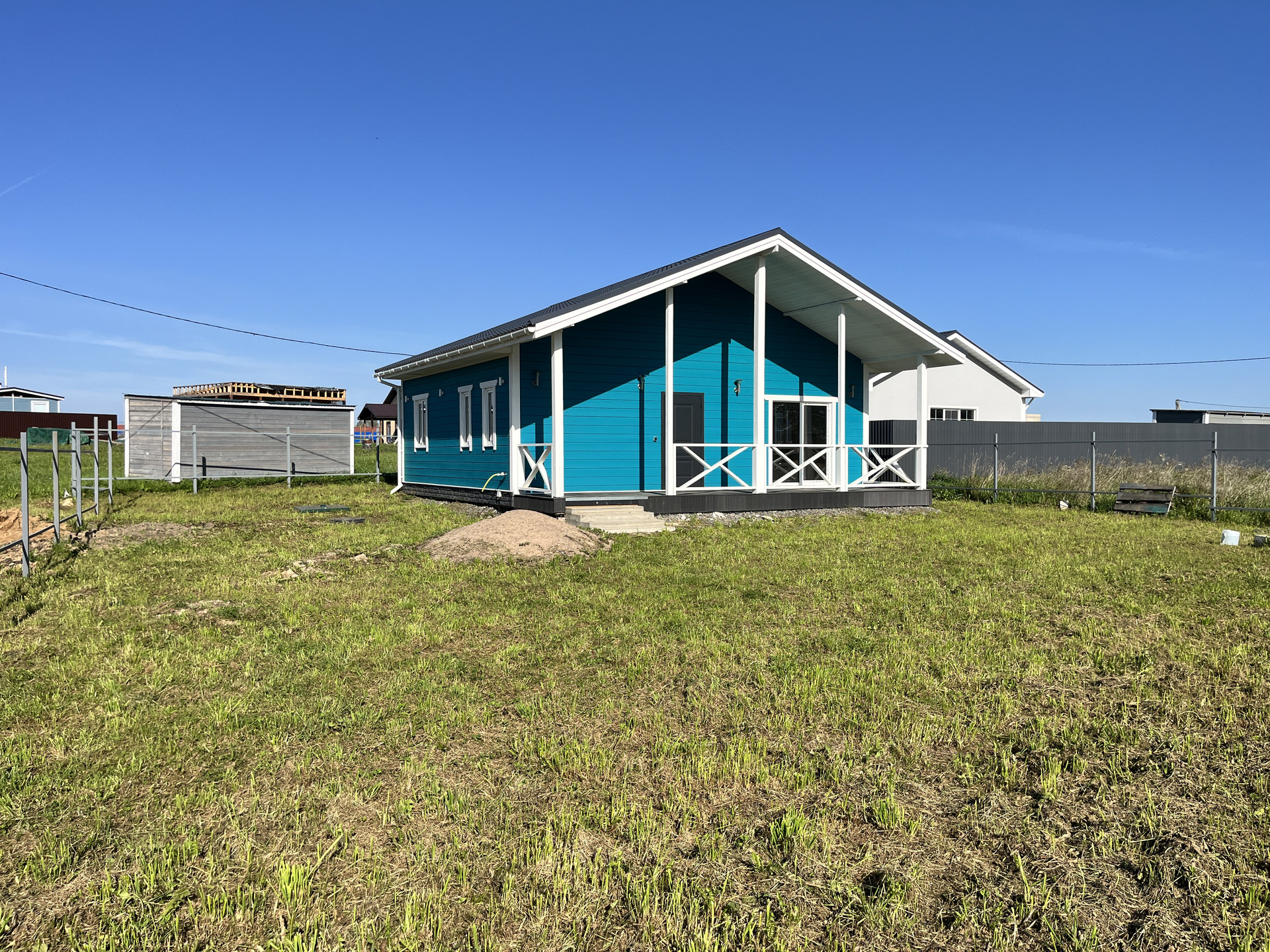 Участок ровный сухой. Установлены металлические столбы для забора по всему периметру с въездной группой.