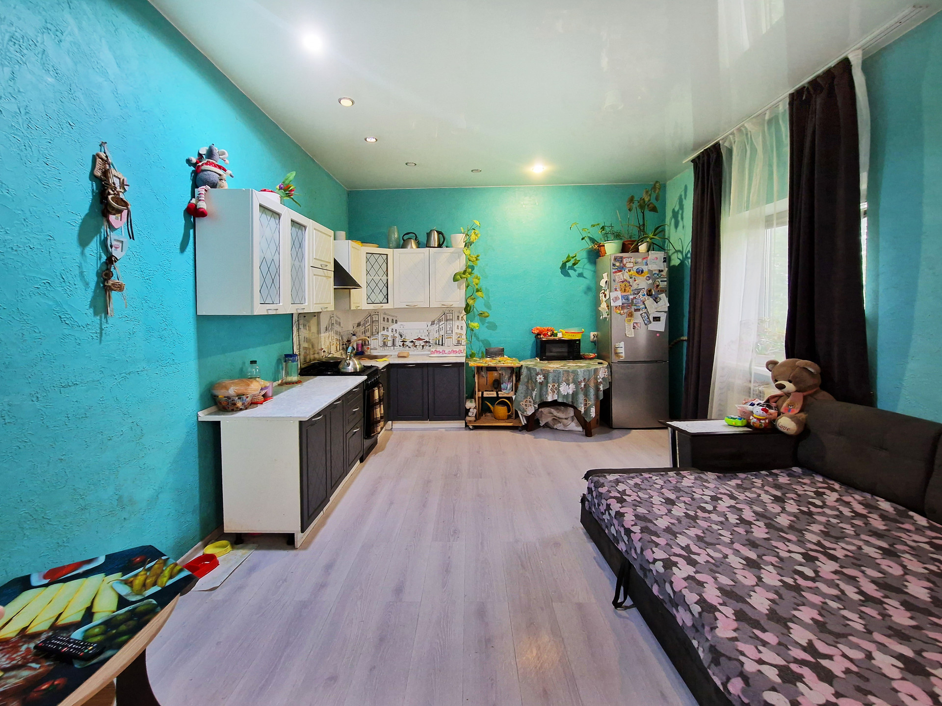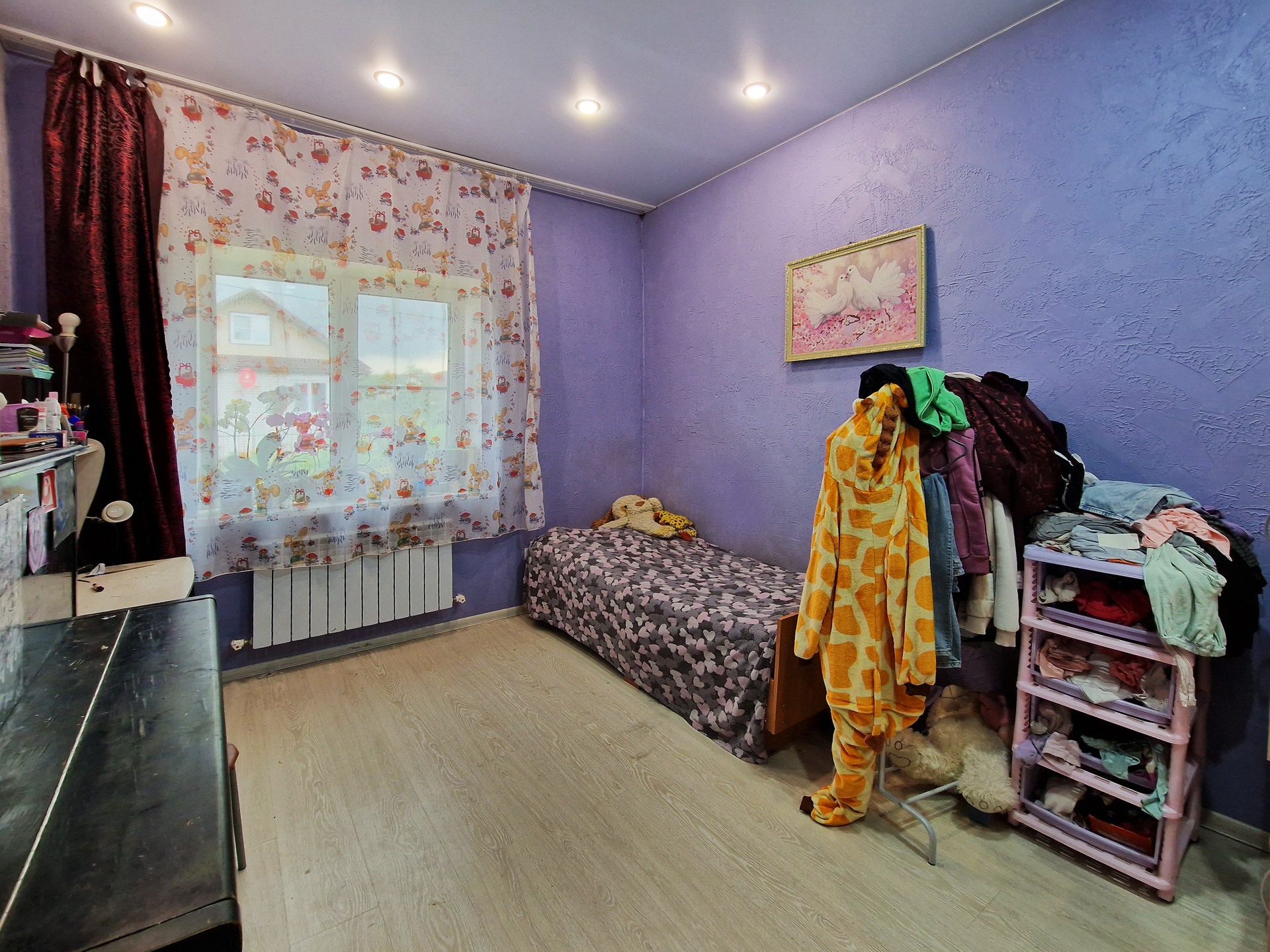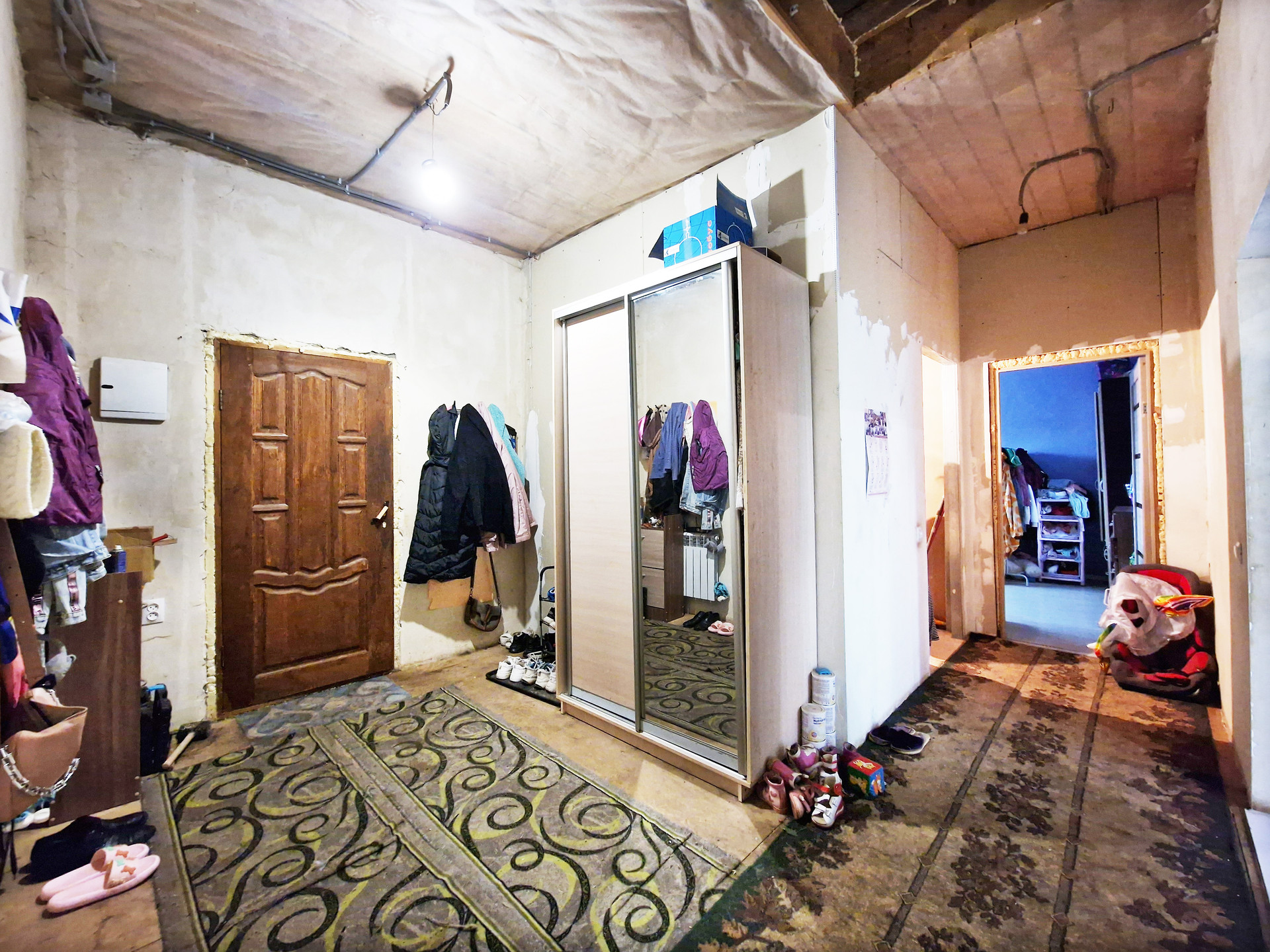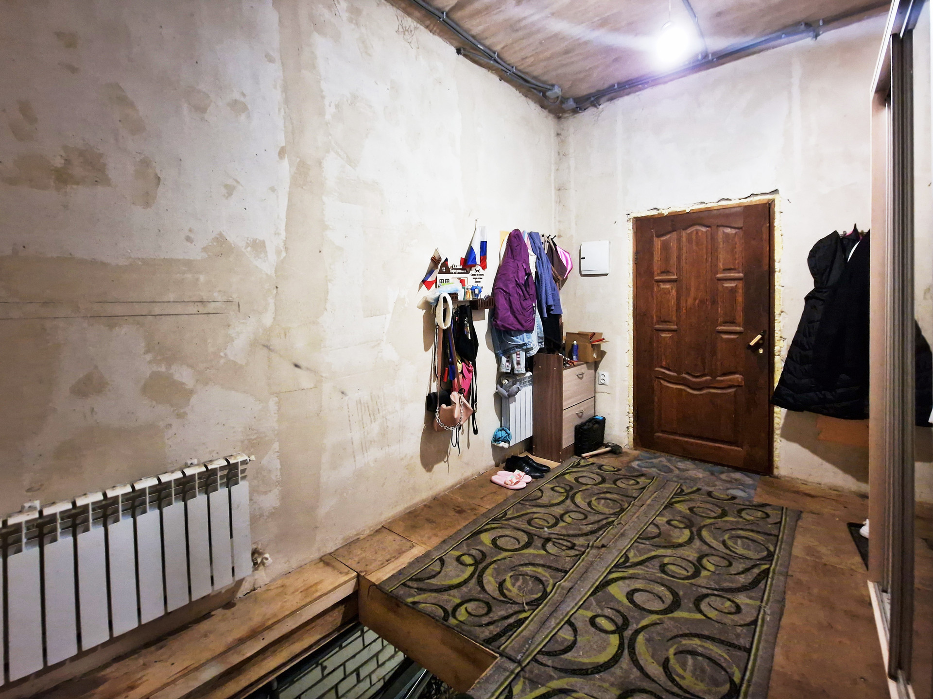 На первом этаже располагается большая кухня-гостиная (с выходом на балкон), санузел, жилая комната. Второй этаж свободной планировки, с полным утеплением и выводом всех коммуникаций. Планировалось сделать три спальни и санузел, нужно выставить межкомнатные перегородки по усмотрению покупателя. В наличии готовый новый металлический каркас лестницы со ступенями и переходной площадкой, который остаётся покупателю.