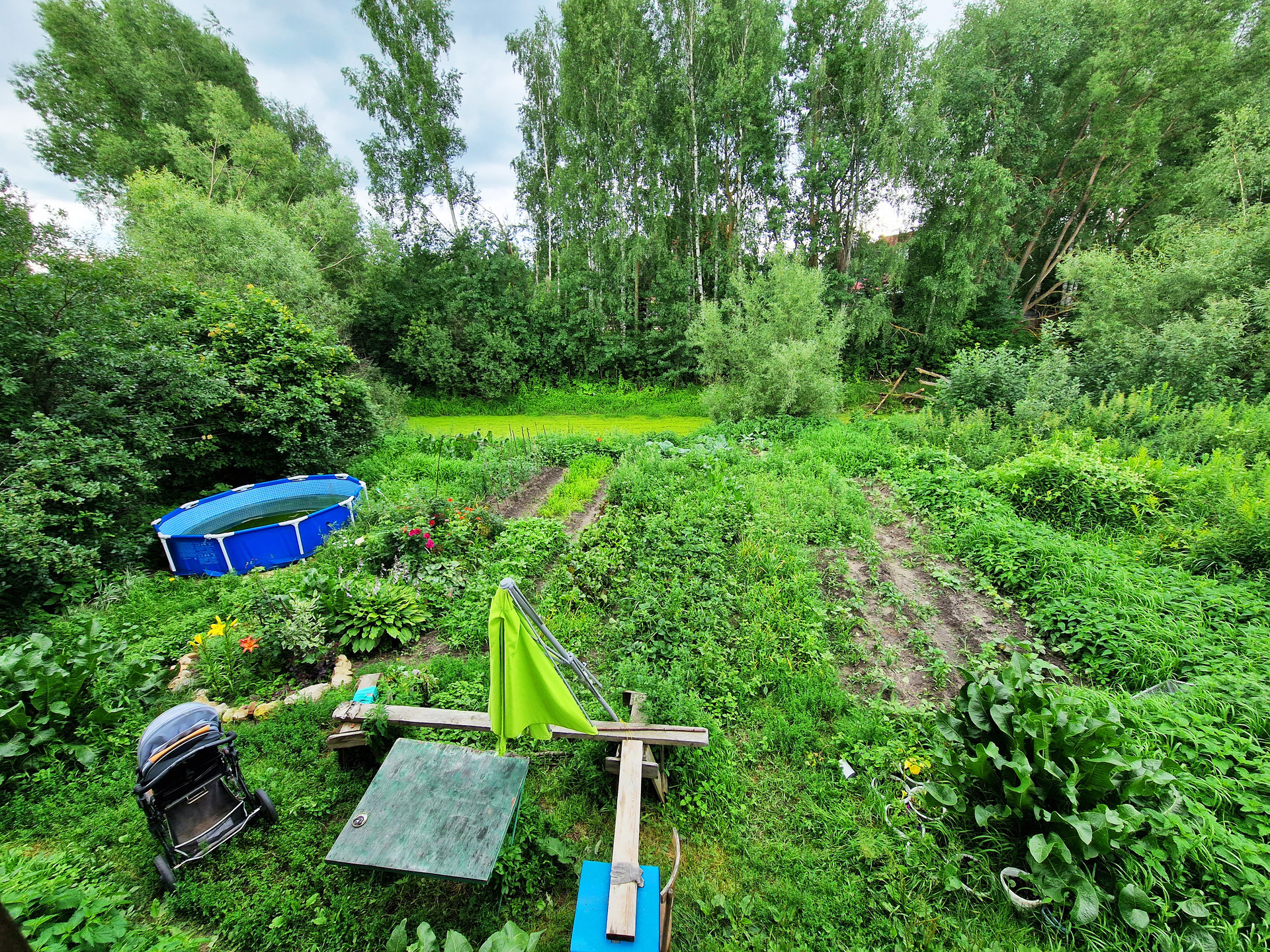 Земельный участок хоть и небольшой (4 с небольшим сотки по документам, но в реальности больше), но вполне удобный, окультуренный, на нём расположены грядки и посадки, есть место под баню, а по самой границе участка расположен небольшой собственный водоём, который при желании можно превратить в красивое озерцо.
