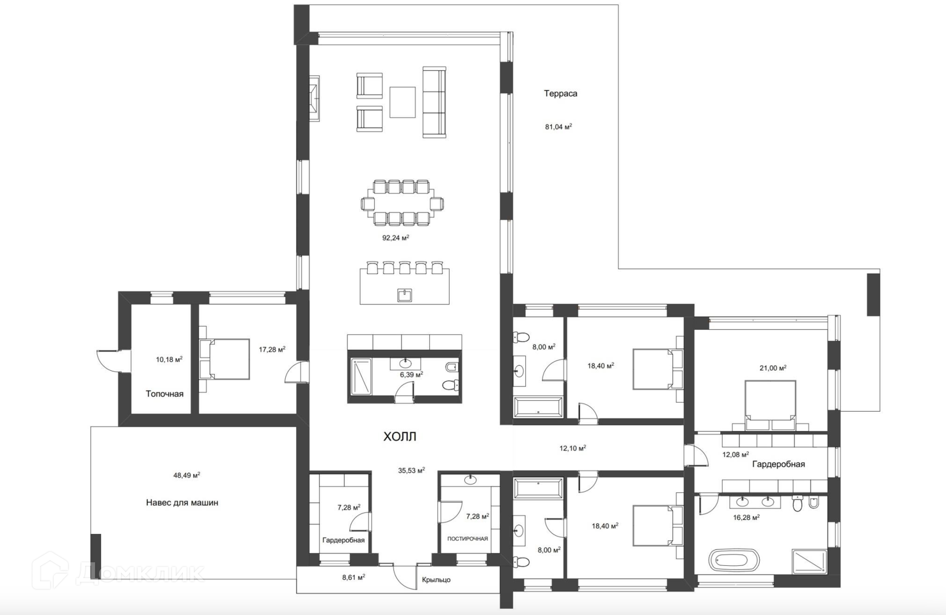 1-й этаж: холл, гардеробная, постирочная, гостевой с/у, кухня-гостинная 90 кв. м с выходом на террасу, две спальни с с/у, спальня с с/у и гардеробной.
