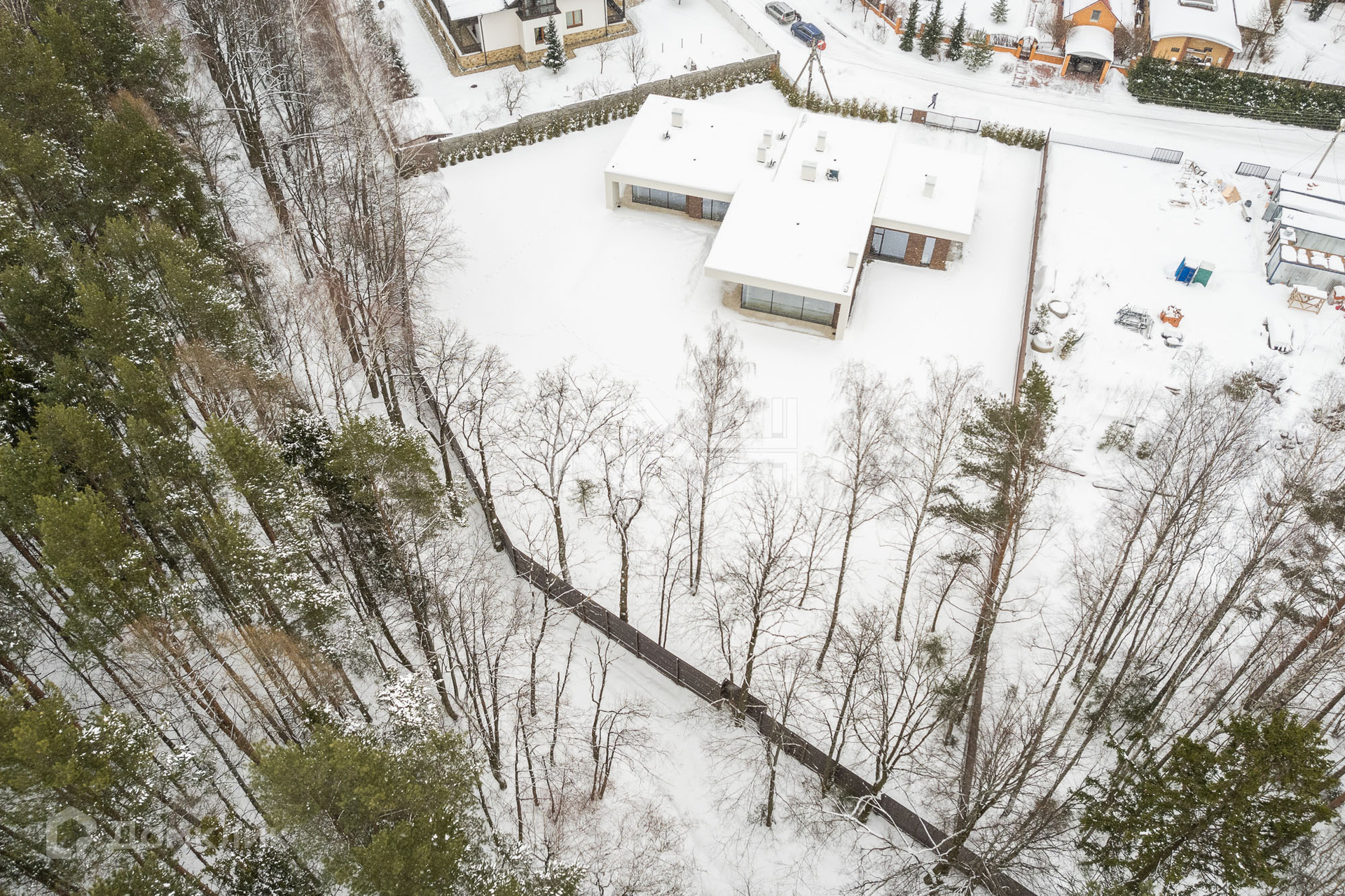 Участок 30 соток (20 собственность + 10 аренда) выровнен, на участке разбит газон, растут взрослые хвойные деревья. Из любой точки дома открывается панорамный вид на лес. Участок огорожен забором с автоматическими воротами.
