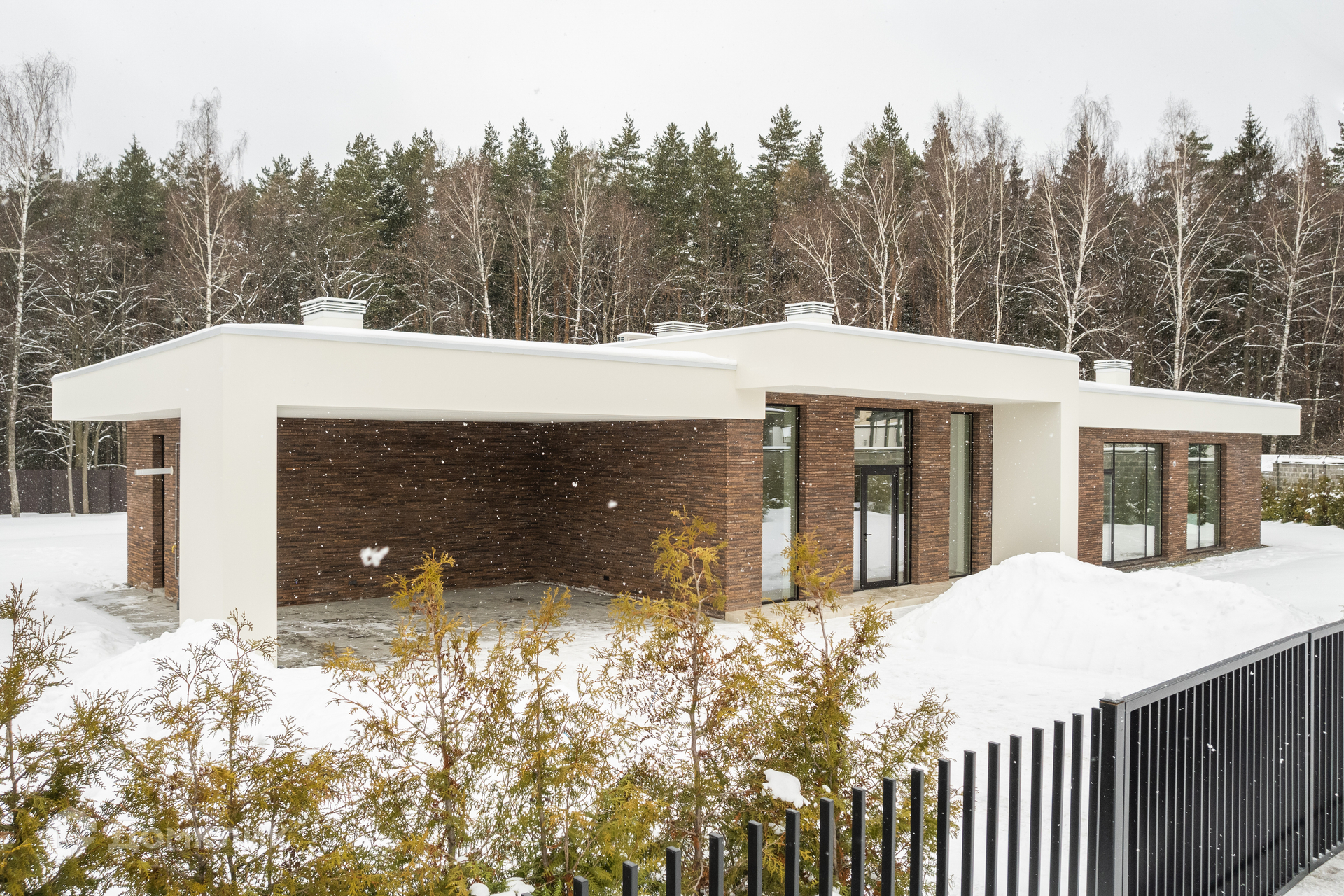 Отличительные особенности: современный проект, одноэтажный дом, дизайнерская отделка, панорамные окна, высокие потолки, участок около леса, дровяной камин Panadero в гостиной, высокие потолки (3,7 м), все центральные коммуникации, центральная система кондиционирования, сантехника Kludi.