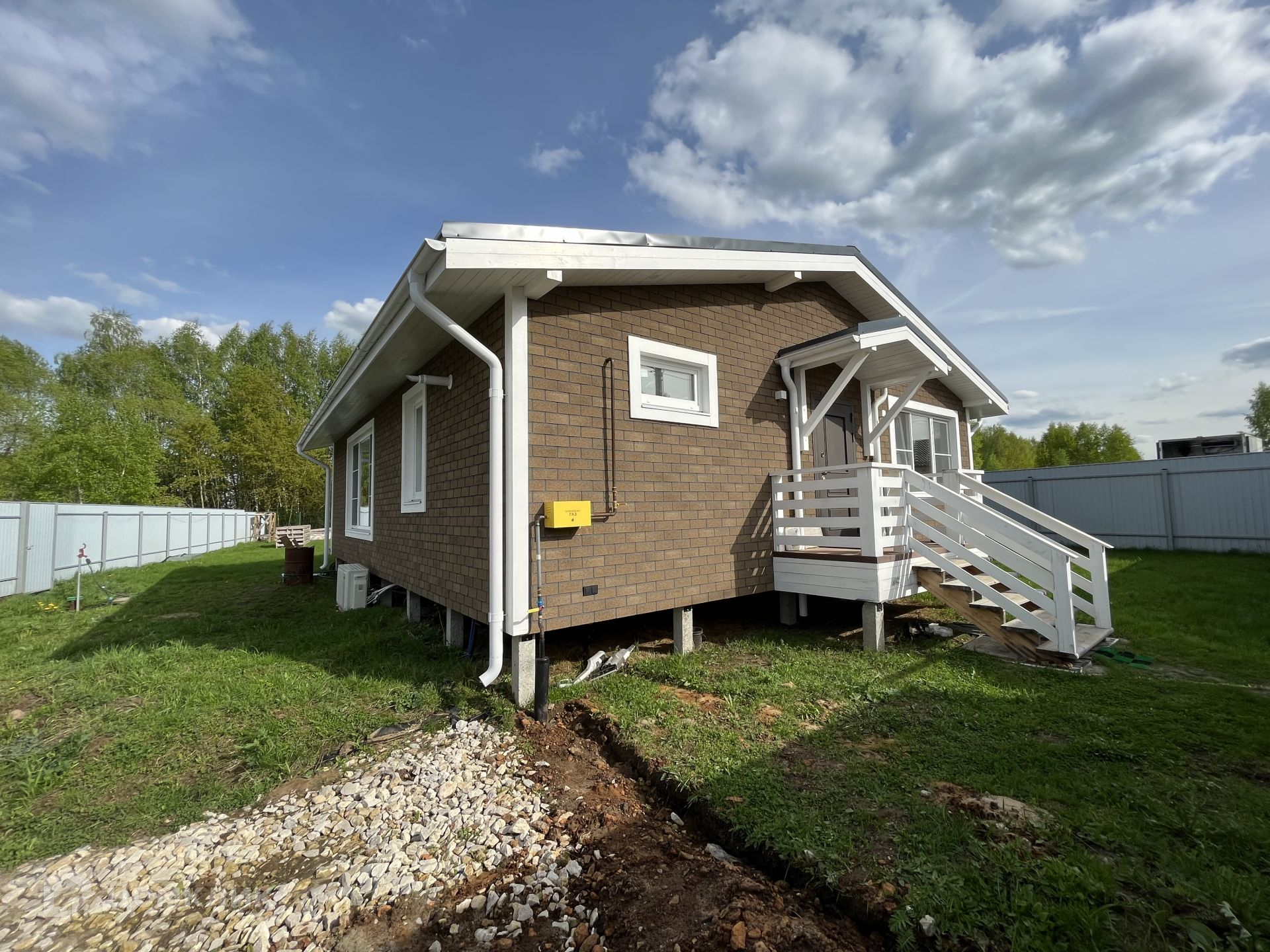 Кровля - гибкая черепица, внешняя отделка фасадов дома так же выполнена из гибкой черепицы, очень хорошего качества. Имеется наружная подсветка дома, опоры крыльца и террасы выполнены из клееного бруса.