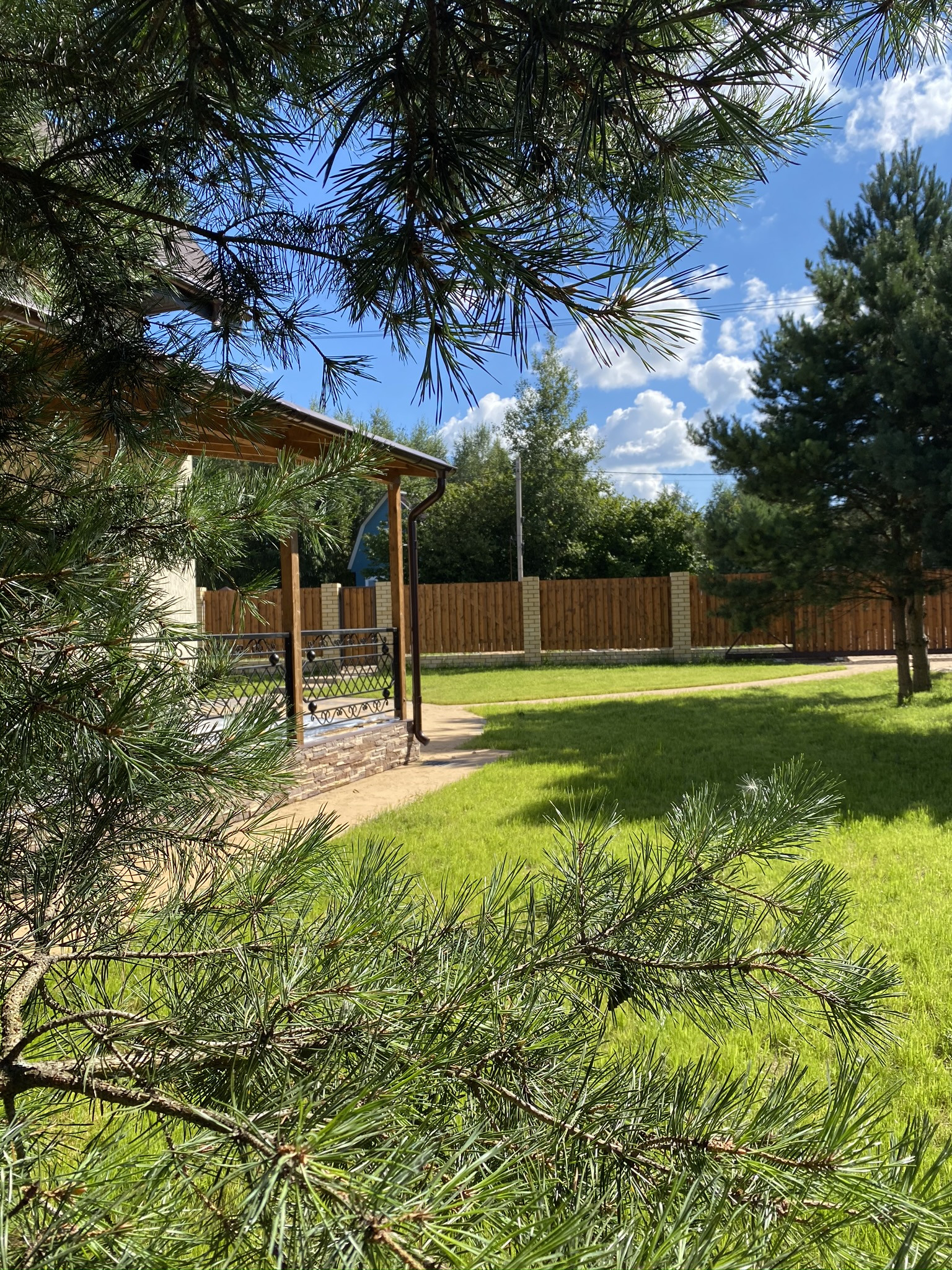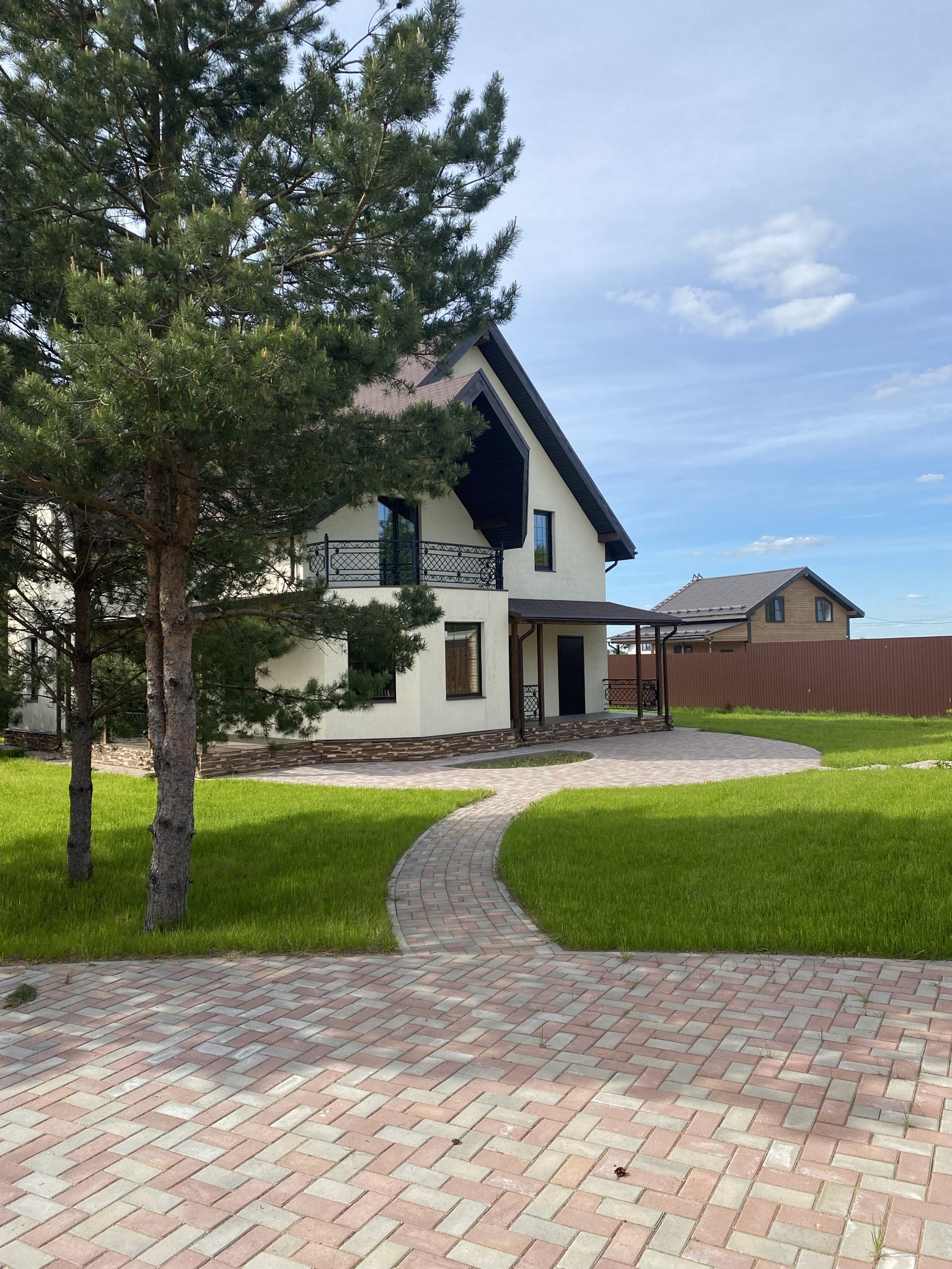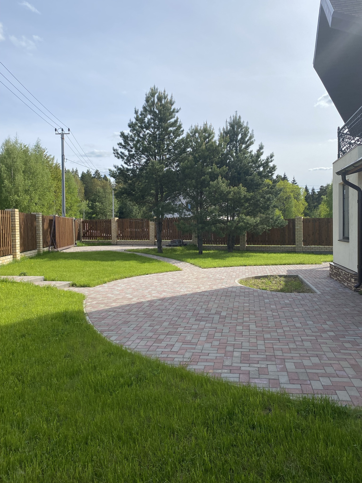 Участок: благоустроенный, ровный, с брусчаткой, газонами, взрослыми соснами, с выведенным освещением.