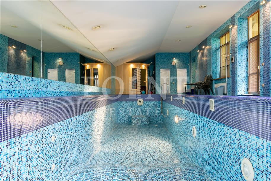 Лот: 92644.   Классический четырехуровневый загородный дом площадью 800 кв.м располагается на участке 12 соток в охраняемой коттеджной застройке "Захарково" в непосредственный близости от столицы. Комфортная планировка. На первом уровне (цоколь) находится винная комната. Второй уровень занимает гостиная с камином, кухня, столовая, кабинет, два санузла, холл, СПА-зона с бассейном, сауной и душевой, котельная, прихожая. Третий уровень включает в себя четыре спальни, одна из которых с индивидуальной гардеробной и санузлом, полноценный санузел. Четвертый уровень (мансарда) отведен под спальню, санузел, кладовую. Предусмотрен встроенный гараж на два машино-места. На придомовой территории отдельно построен дом для персонала 40 кв.м. К услугам жителей разнообразная инфраструктура Рублево-Успенского направления.