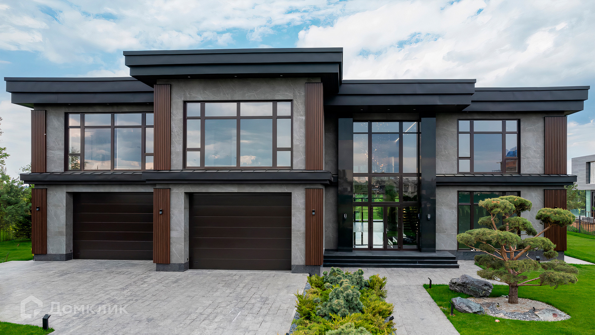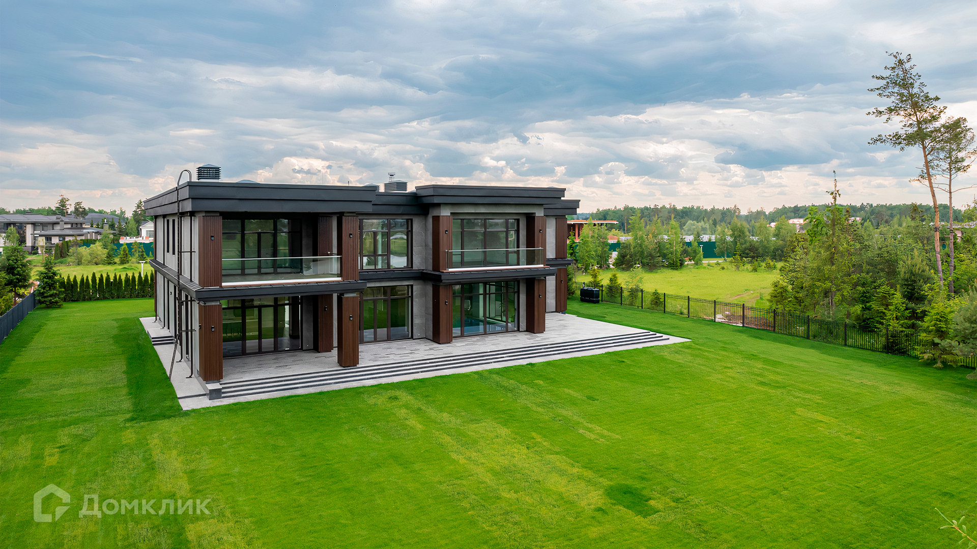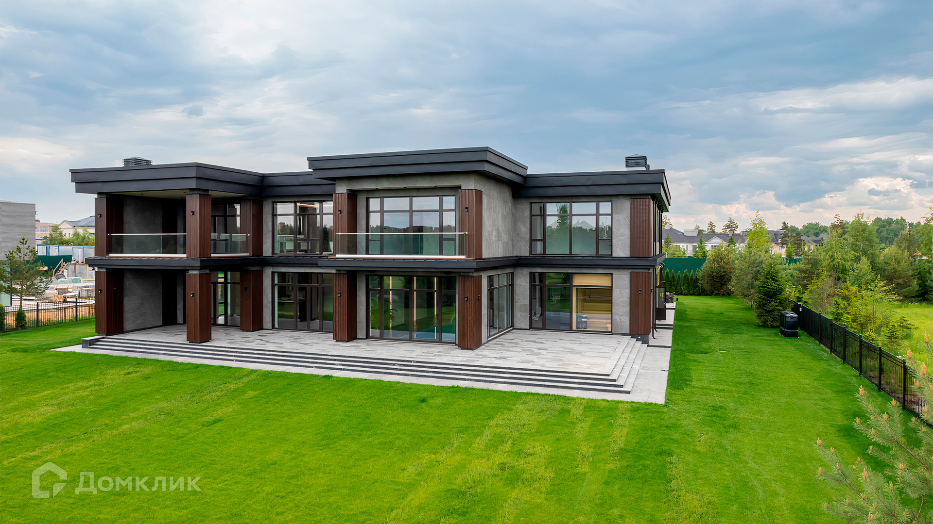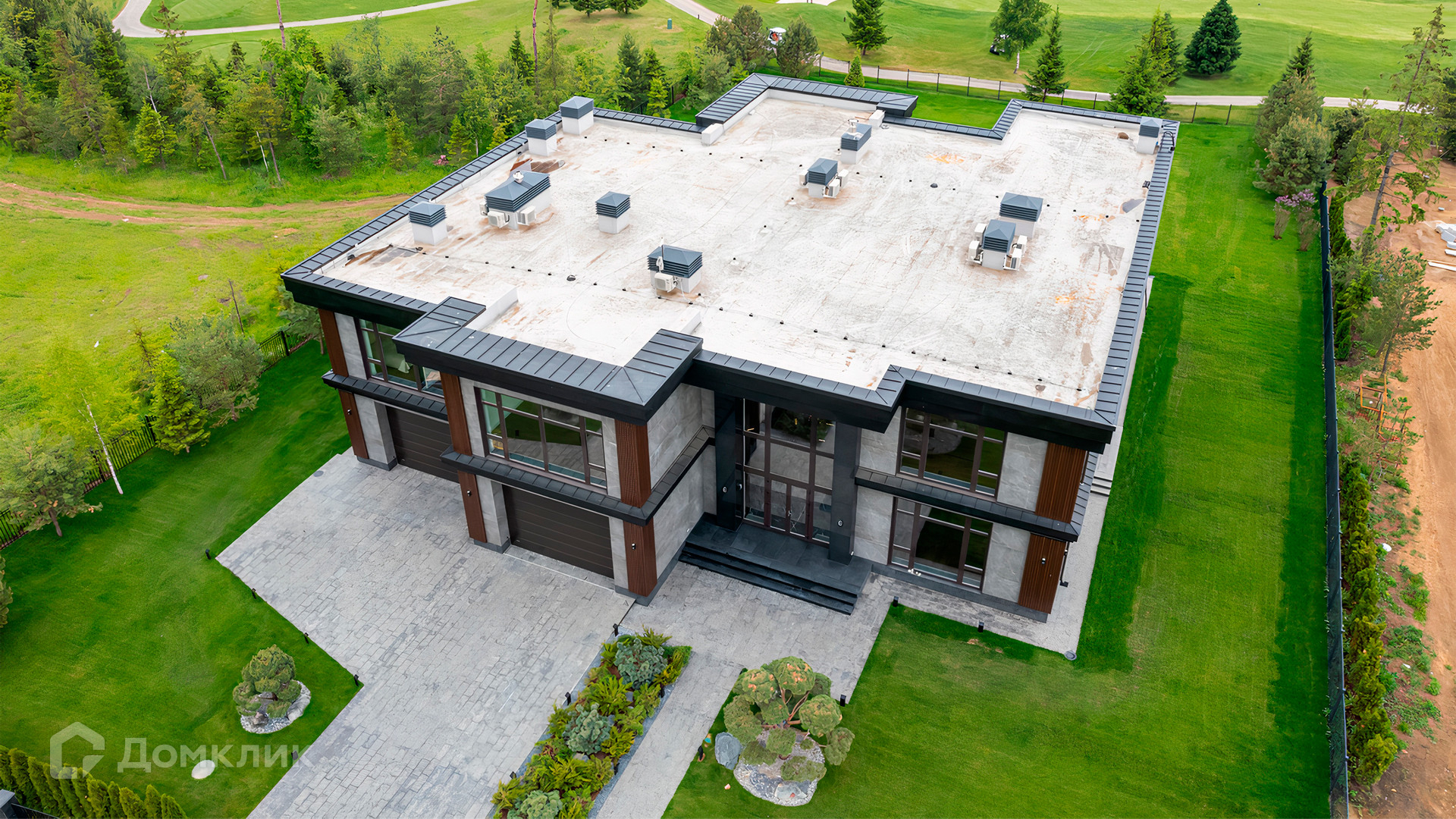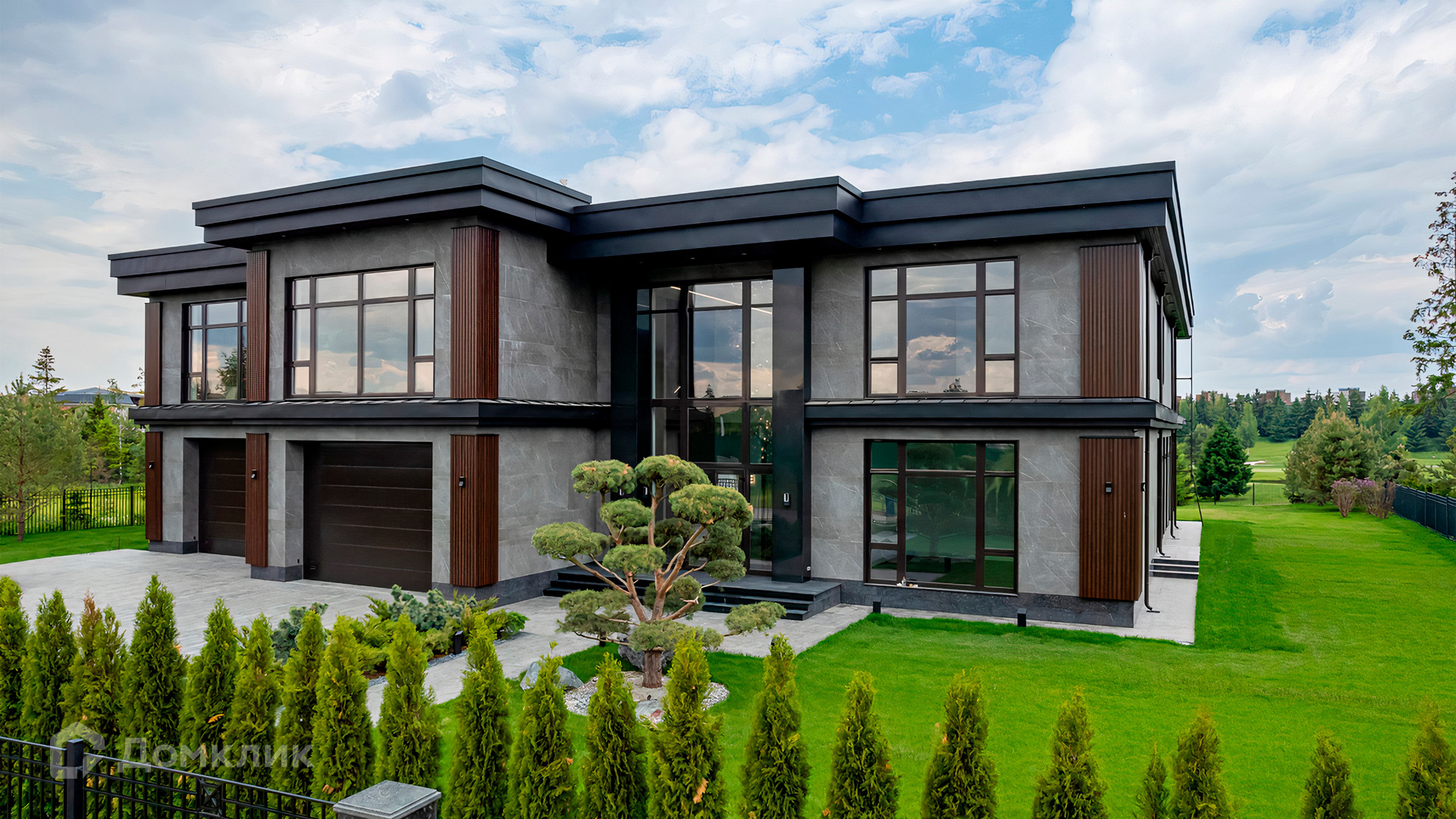ID 9 937. Agalarov Estate. Просторный загородный дом площадью 1590 м² расположен на полевом участке 40 соток. Фасад в современном стиле облицован деревом и камнем, декорирован подсветкой. Интерьер выполнен в современном стиле с применением сдержанной палитры цветов. В отделке использованы природные текстуры — дерево и камень. Панорамное остекление наполняет пространство воздухом и светом. В коттедже предусмотрены бассейн с зоной отдыха и сауной, 2 гаража. С участка с ландшафтным дизайном и высаженными растениями открывается вид на гольф-поле.