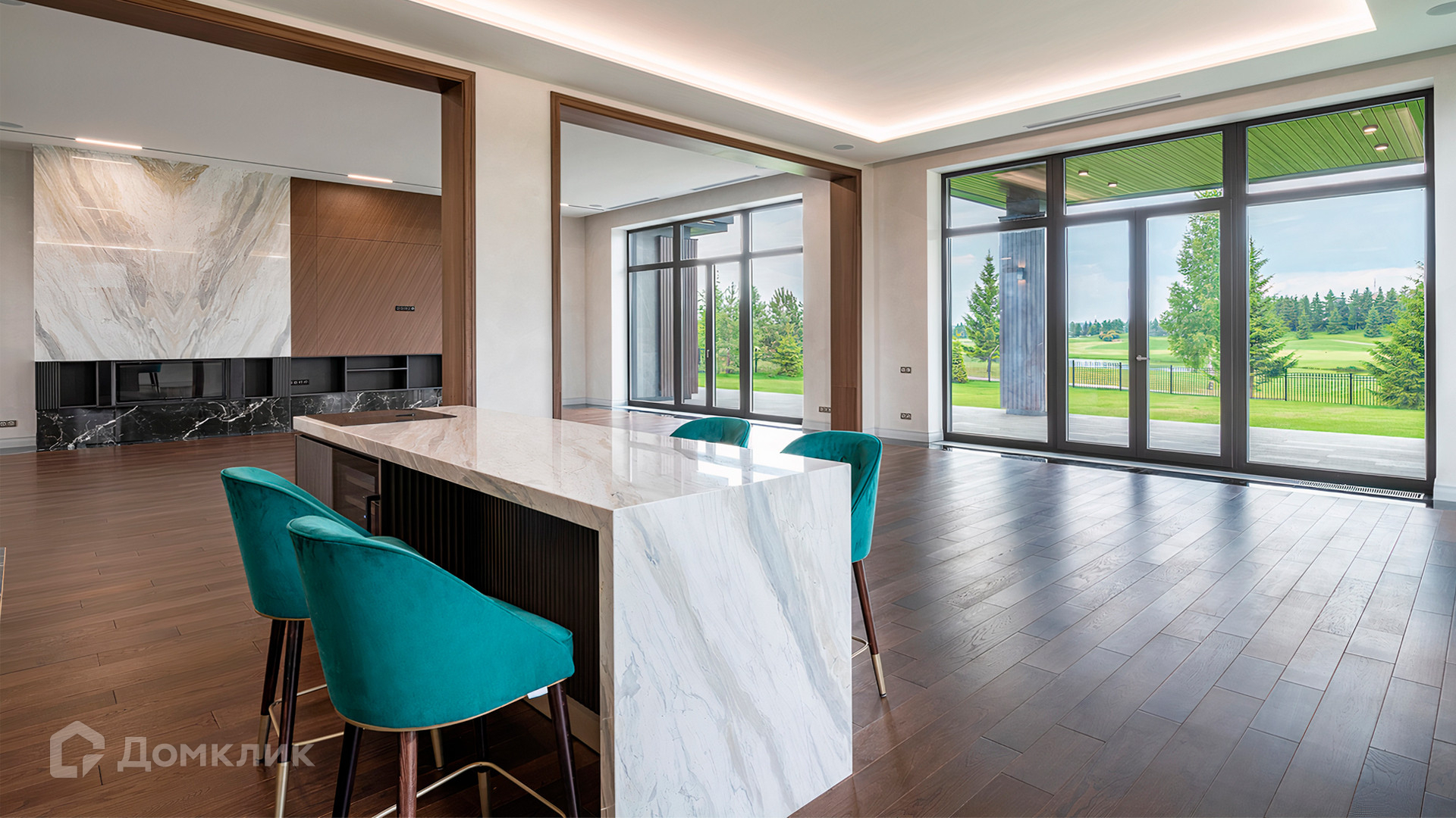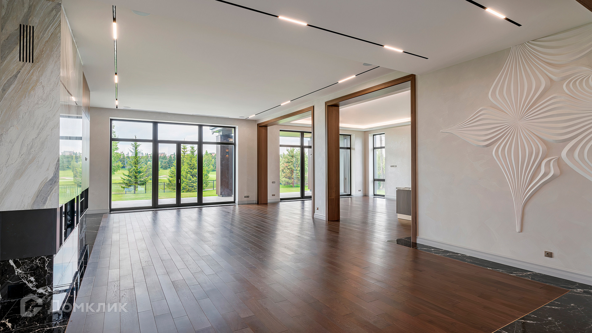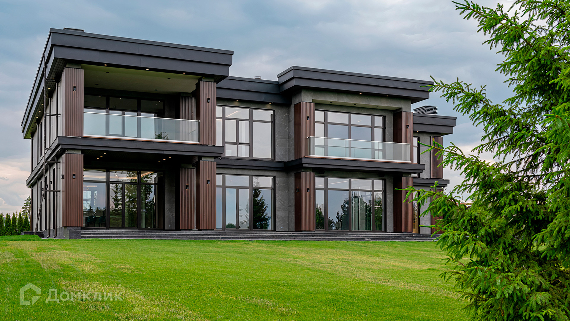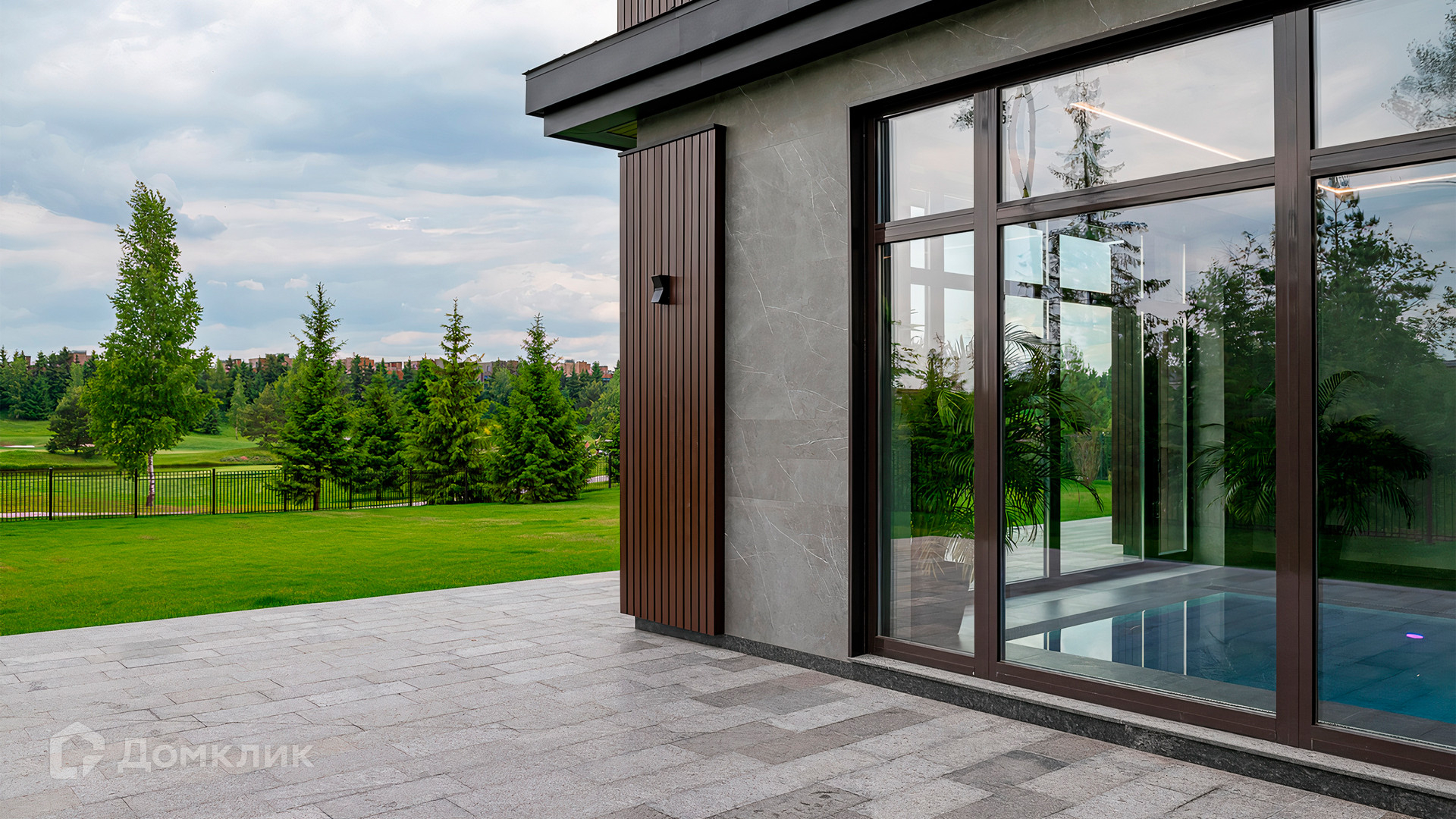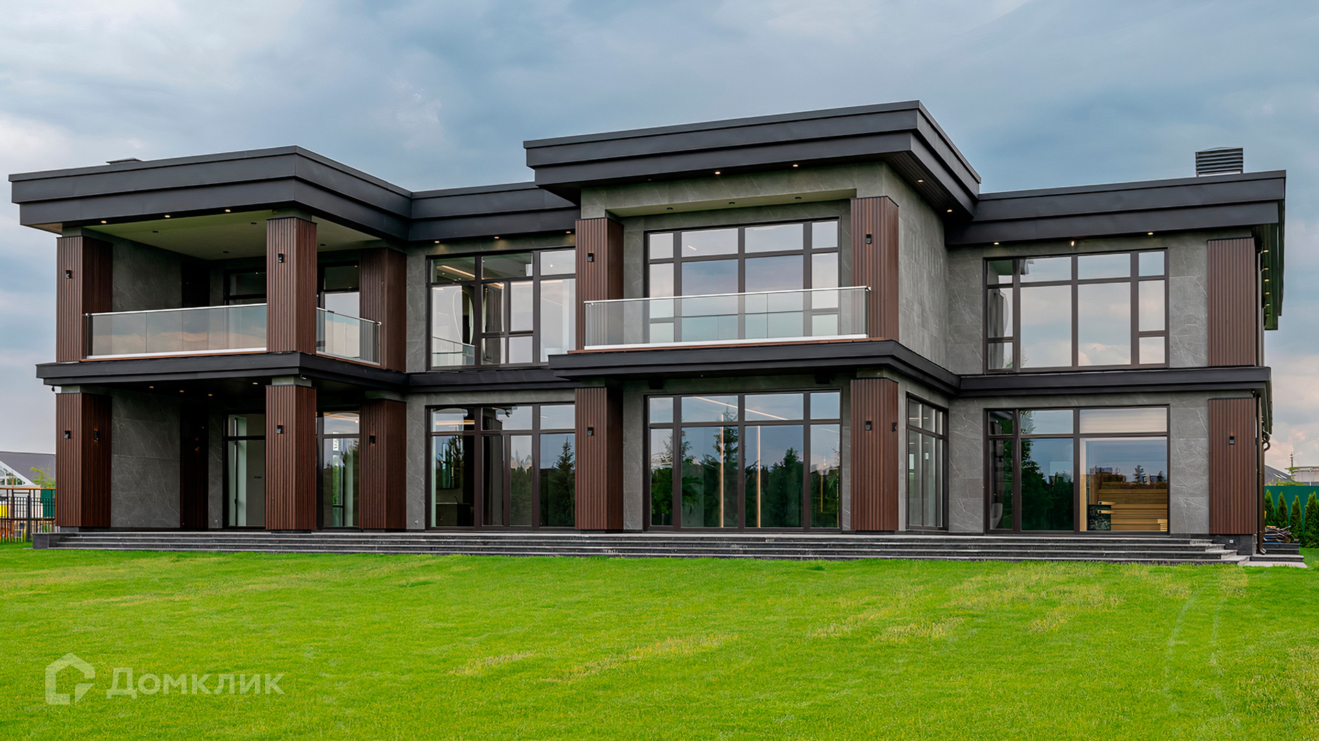 ID 9 937. Agalarov Estate. Просторный загородный дом площадью 1590 м² расположен на полевом участке 40 соток. Фасад в современном стиле облицован деревом и камнем, декорирован подсветкой. Интерьер выполнен в современном стиле с применением сдержанной палитры цветов. В отделке использованы природные текстуры — дерево и камень. Панорамное остекление наполняет пространство воздухом и светом. В коттедже предусмотрены бассейн с зоной отдыха и сауной, 2 гаража. С участка с ландшафтным дизайном и высаженными растениями открывается вид на гольф-поле.