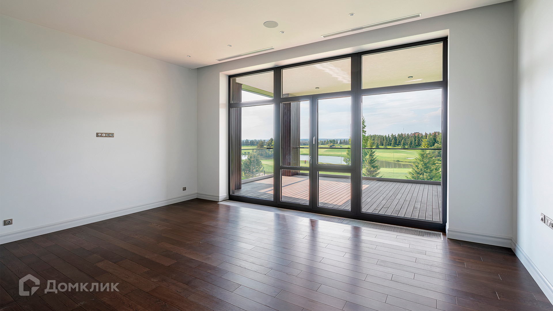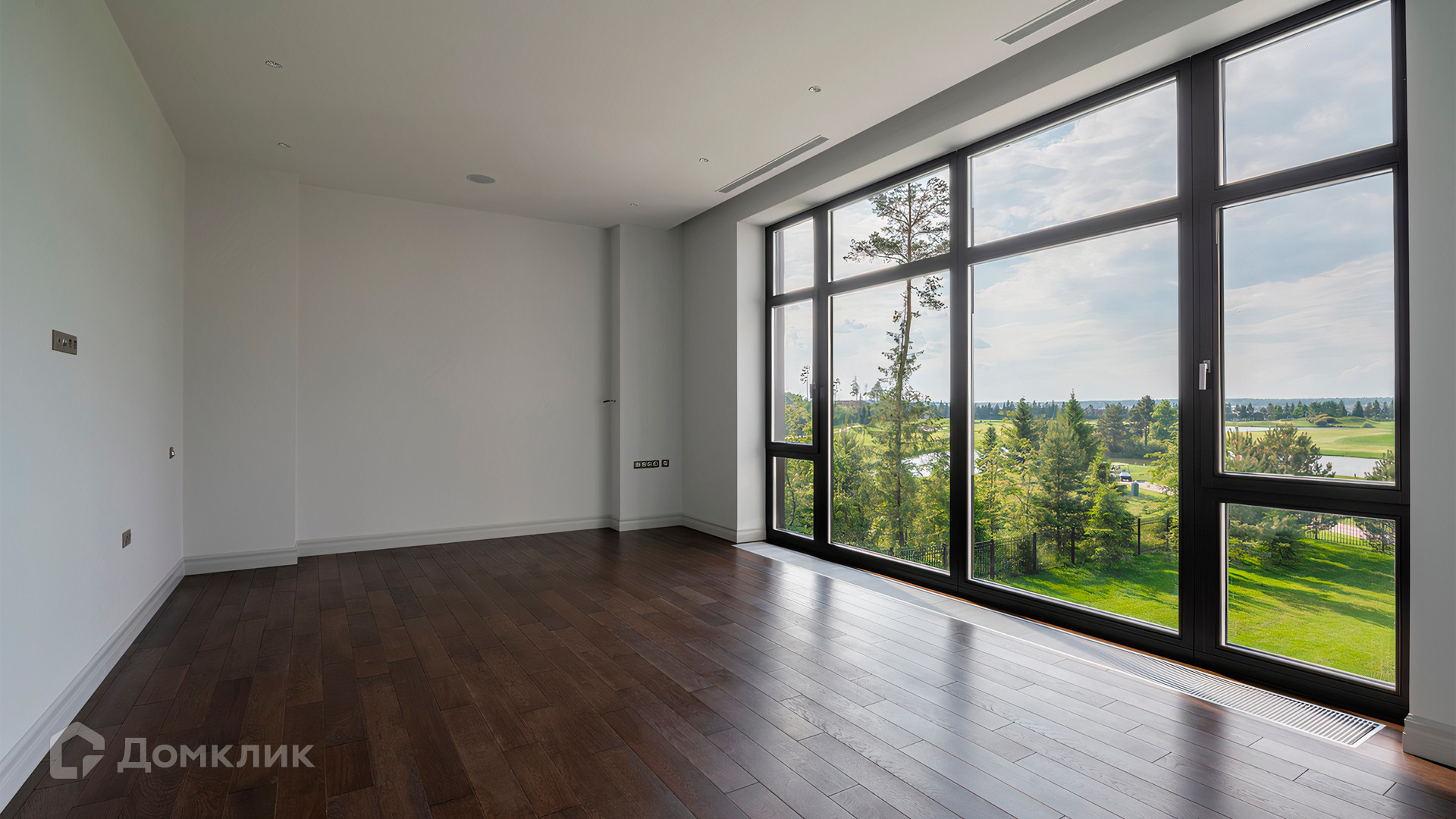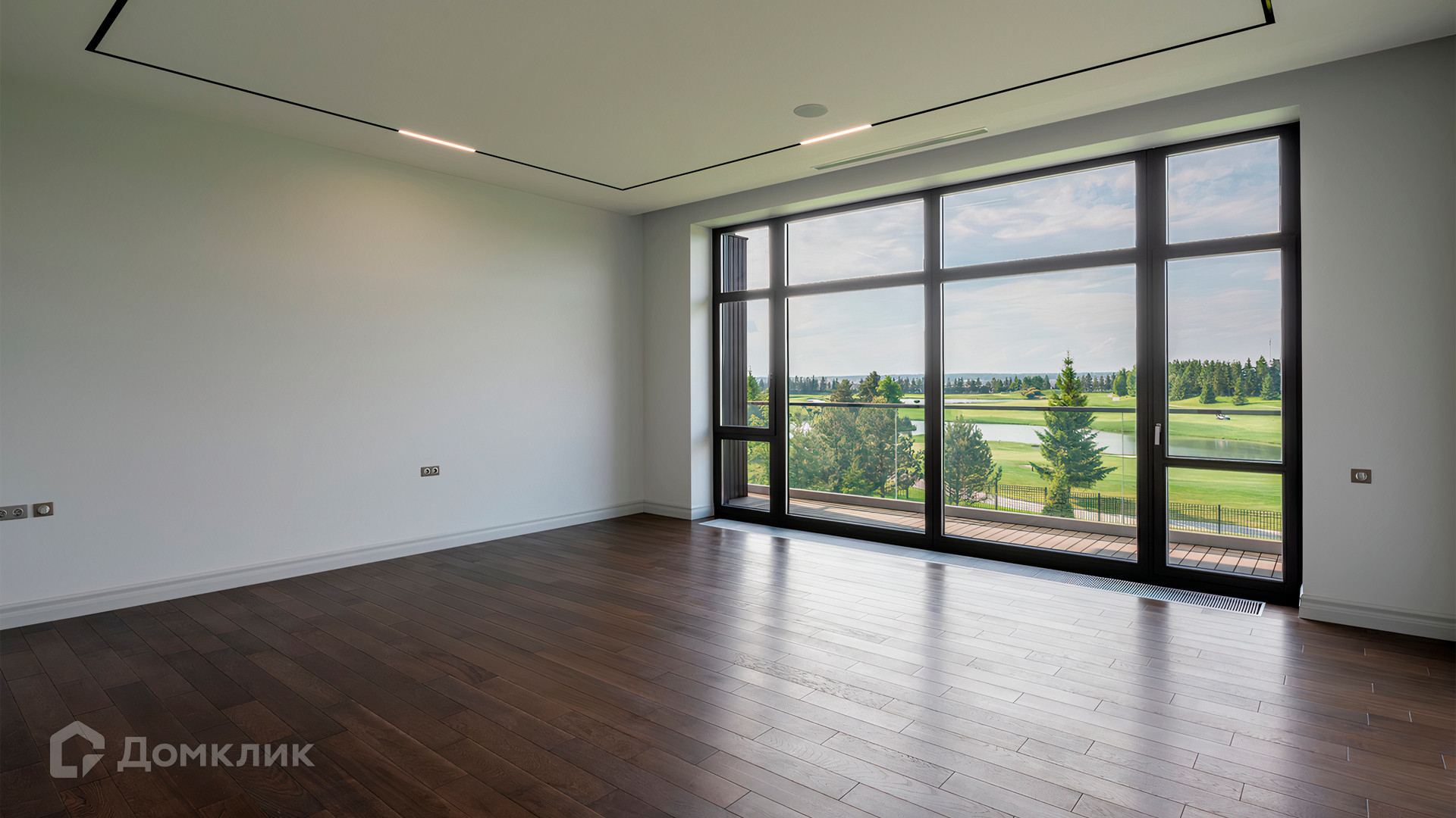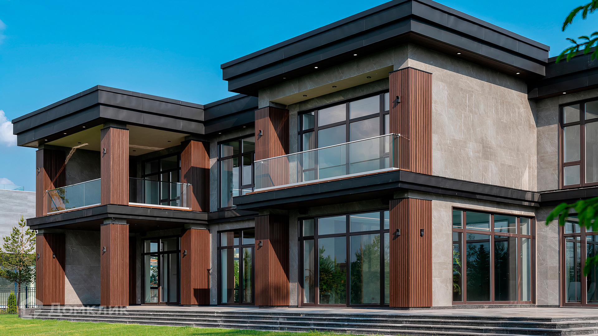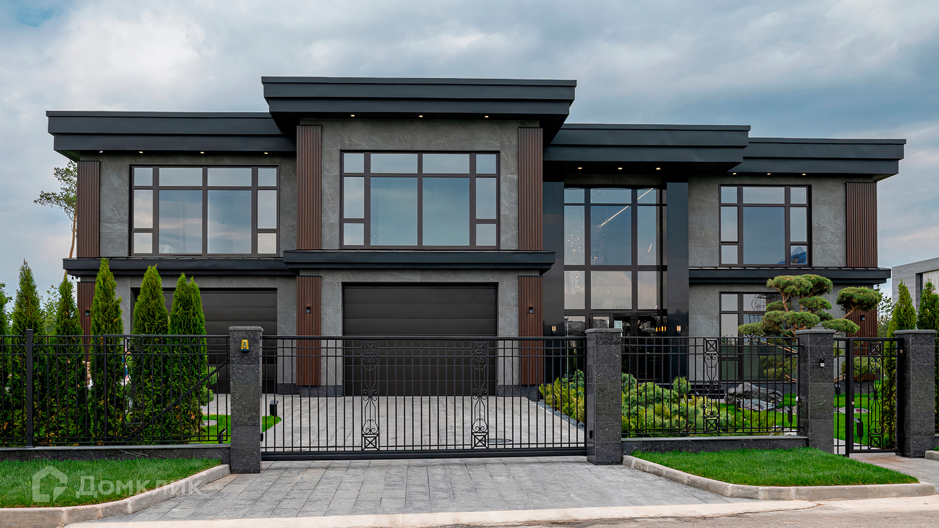 ID 9 937. Agalarov Estate. Просторный загородный дом площадью 1590 м² расположен на полевом участке 40 соток. Фасад в современном стиле облицован деревом и камнем, декорирован подсветкой. Интерьер выполнен в современном стиле с применением сдержанной палитры цветов. В отделке использованы природные текстуры — дерево и камень. Панорамное остекление наполняет пространство воздухом и светом. В коттедже предусмотрены бассейн с зоной отдыха и сауной, 2 гаража. С участка с ландшафтным дизайном и высаженными растениями открывается вид на гольф-поле.