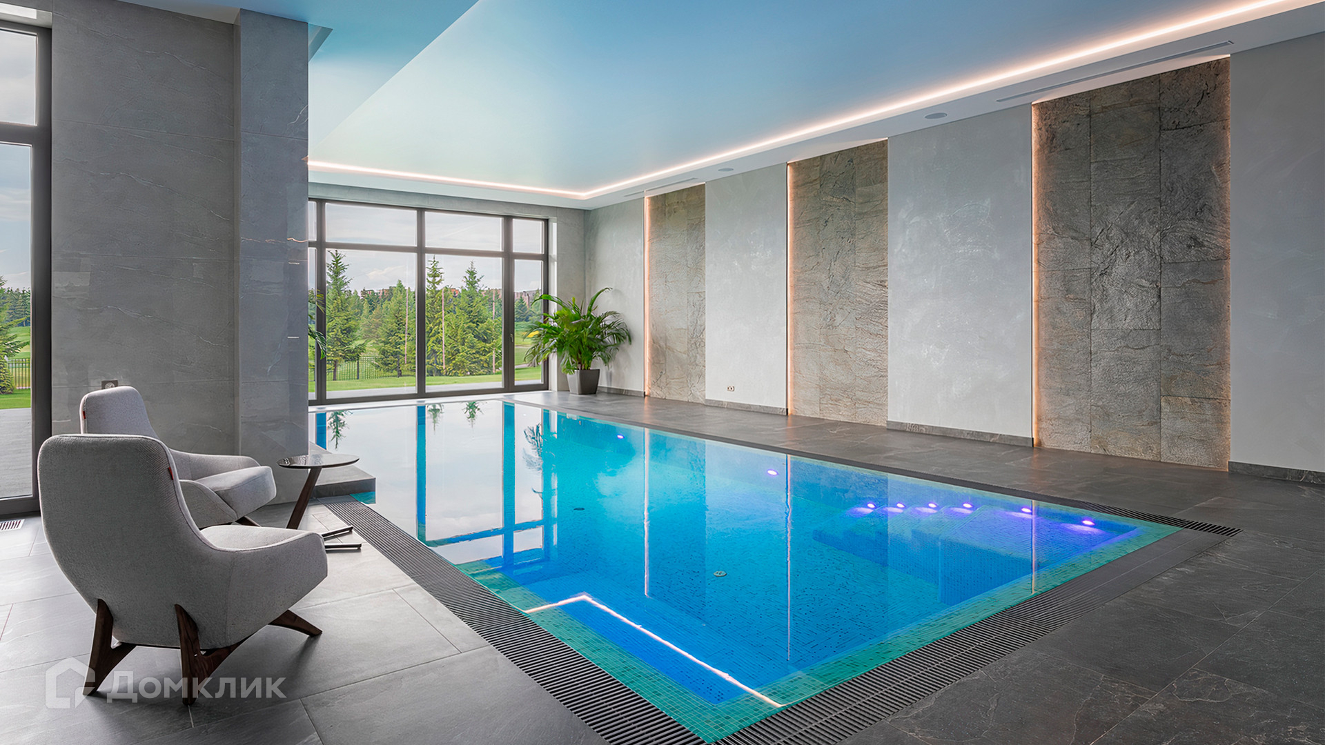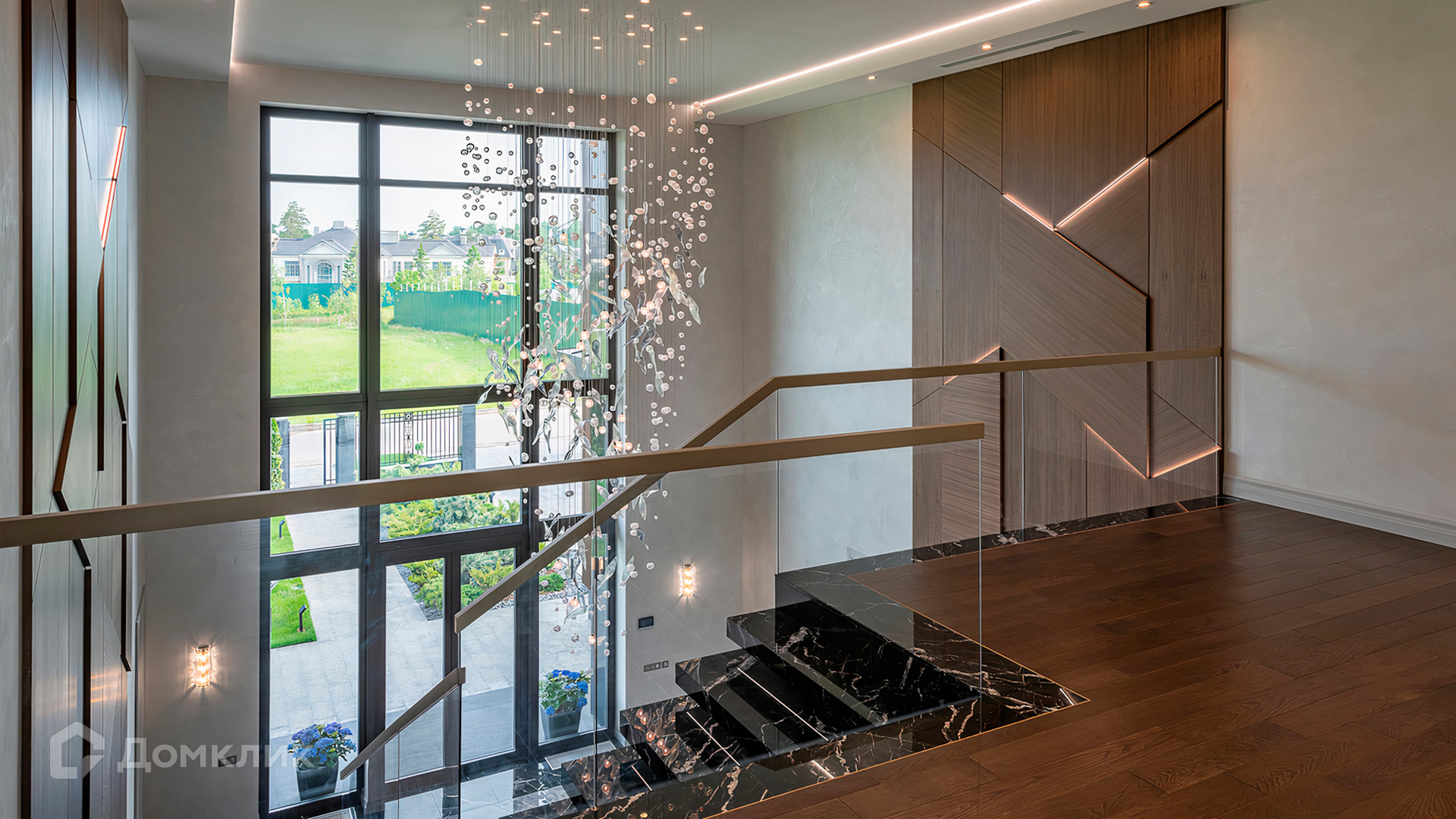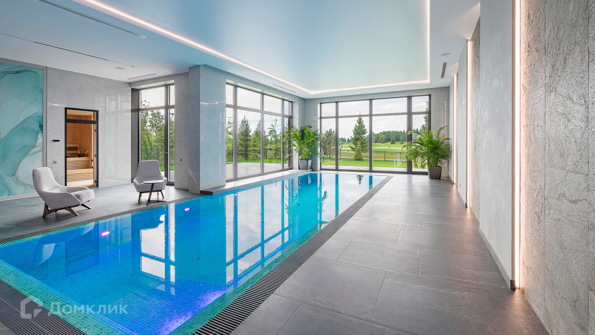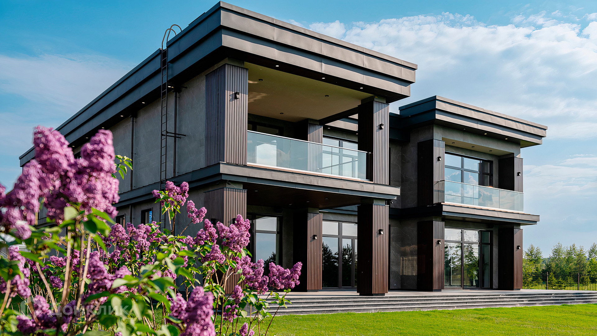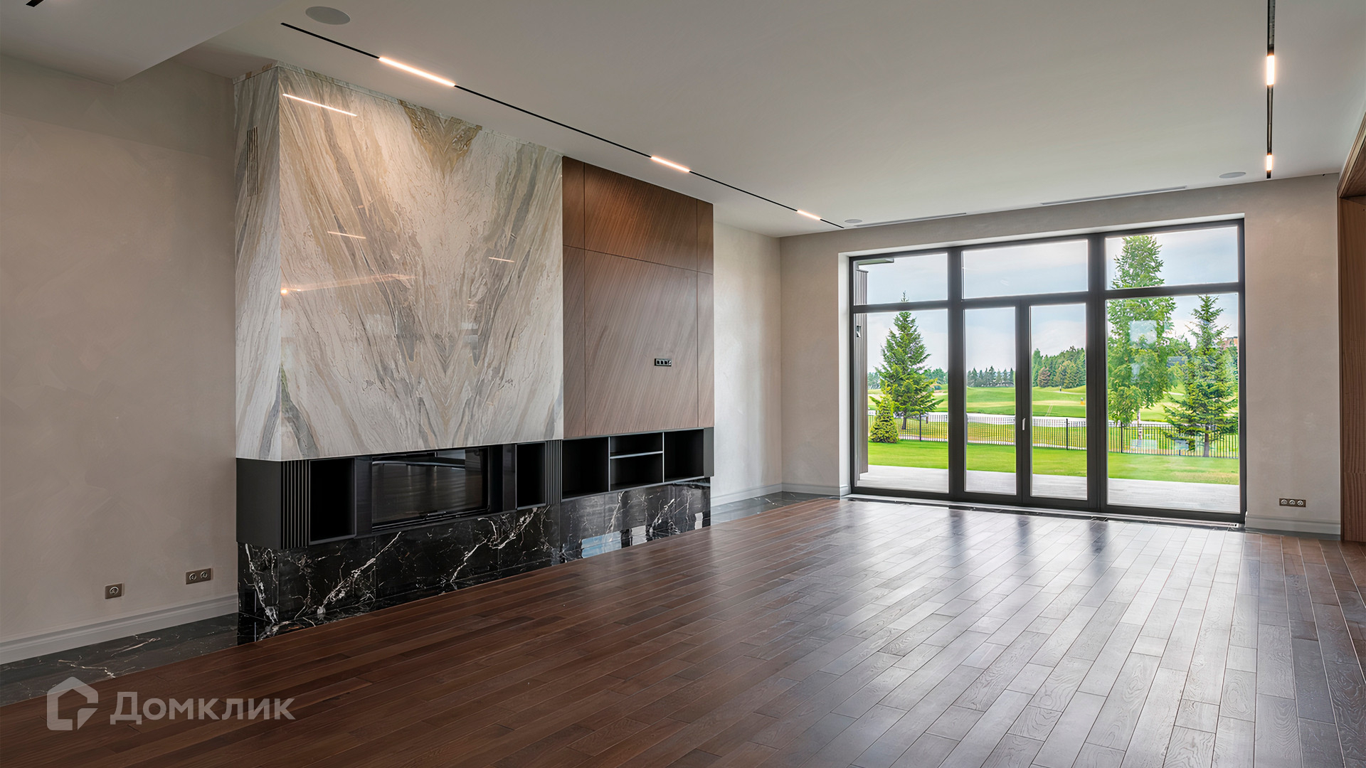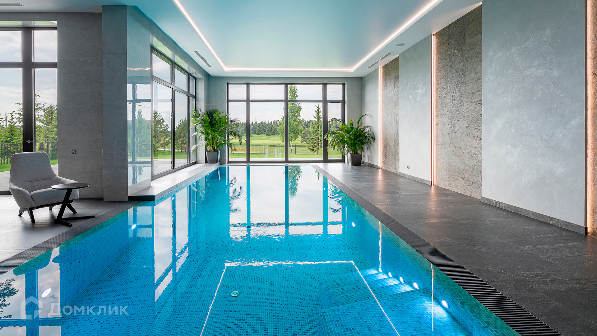ID 9 937. Agalarov Estate. Просторный загородный дом площадью 1590 м² расположен на полевом участке 40 соток. Фасад в современном стиле облицован деревом и камнем, декорирован подсветкой. Интерьер выполнен в современном стиле с применением сдержанной палитры цветов. В отделке использованы природные текстуры — дерево и камень. Панорамное остекление наполняет пространство воздухом и светом. В коттедже предусмотрены бассейн с зоной отдыха и сауной, 2 гаража. С участка с ландшафтным дизайном и высаженными растениями открывается вид на гольф-поле.