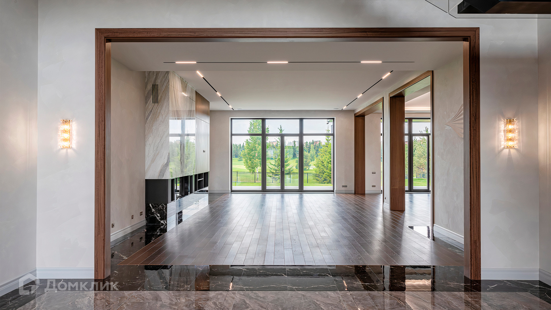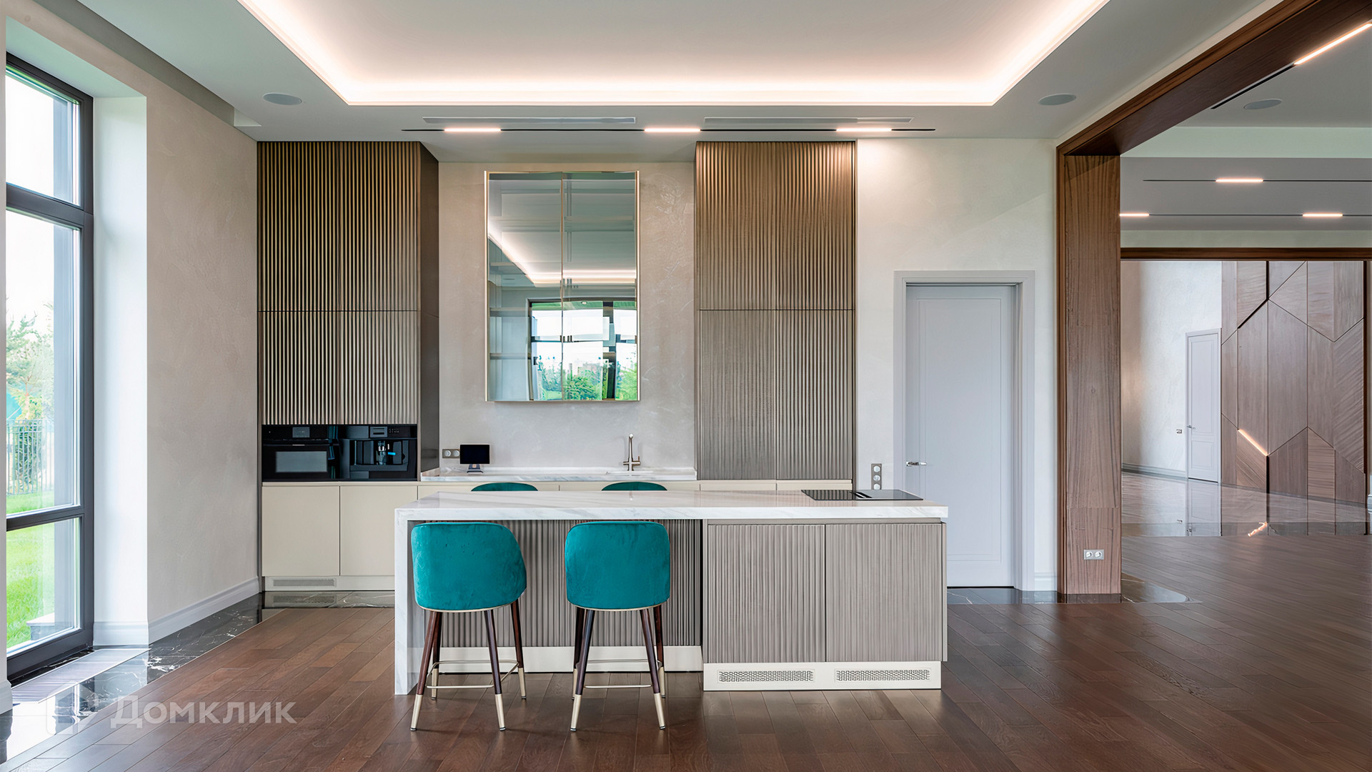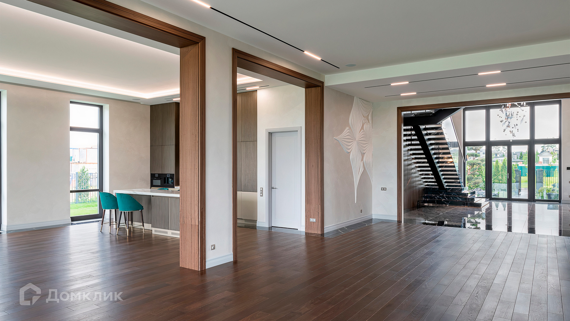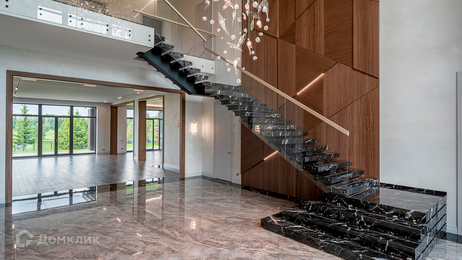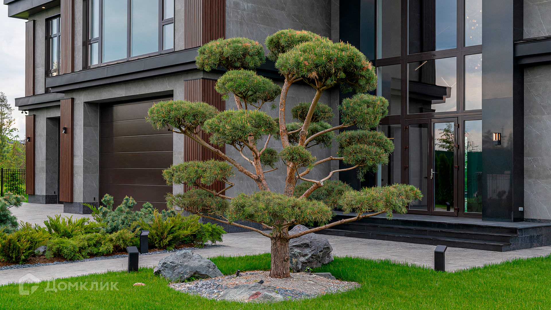ID 9 937. Agalarov Estate. Просторный загородный дом площадью 1590 м² расположен на полевом участке 40 соток. Фасад в современном стиле облицован деревом и камнем, декорирован подсветкой. Интерьер выполнен в современном стиле с применением сдержанной палитры цветов. В отделке использованы природные текстуры — дерево и камень. Панорамное остекление наполняет пространство воздухом и светом. В коттедже предусмотрены бассейн с зоной отдыха и сауной, 2 гаража. С участка с ландшафтным дизайном и высаженными растениями открывается вид на гольф-поле.