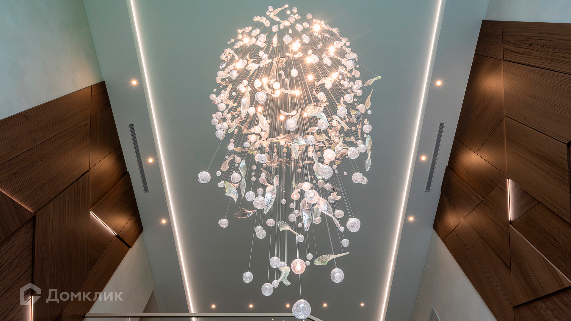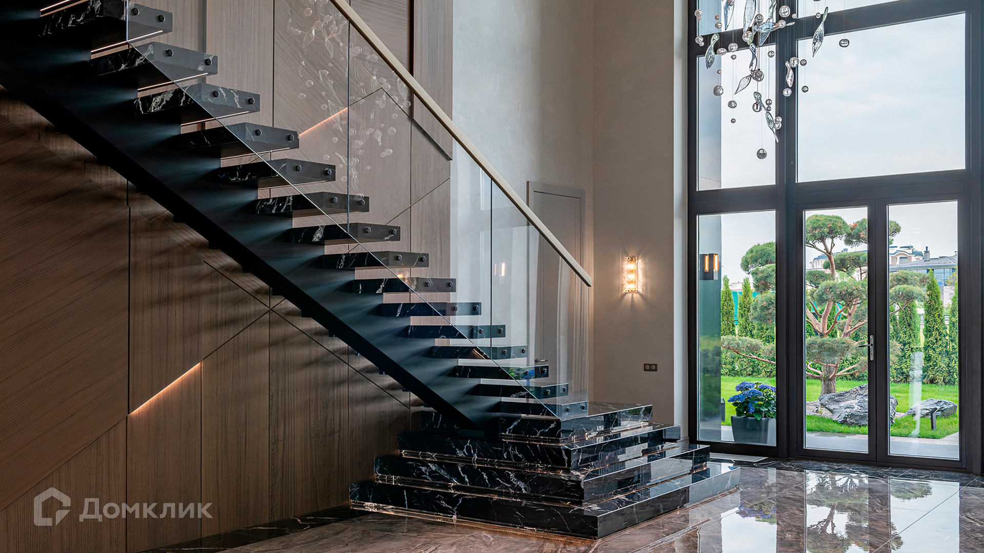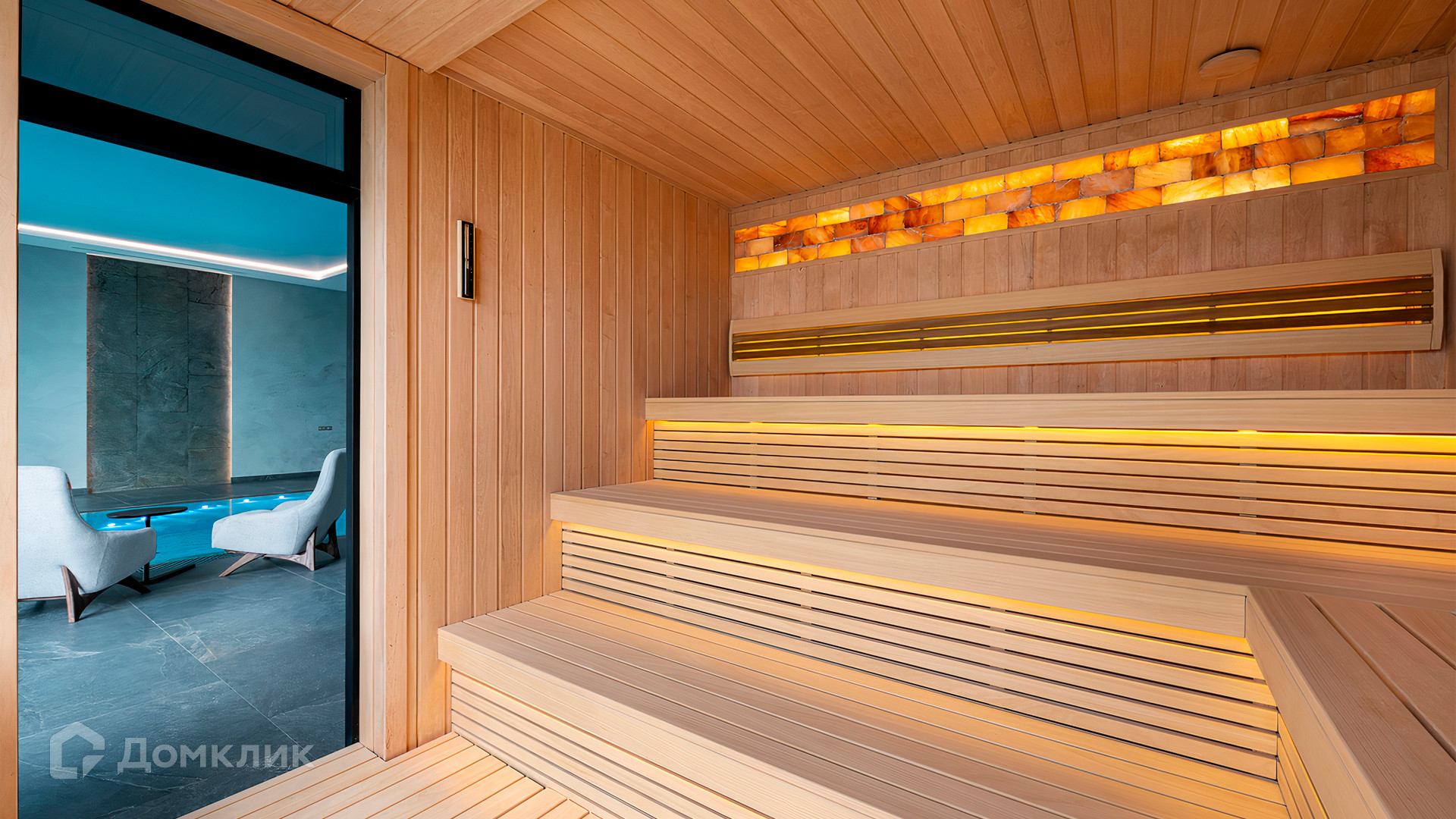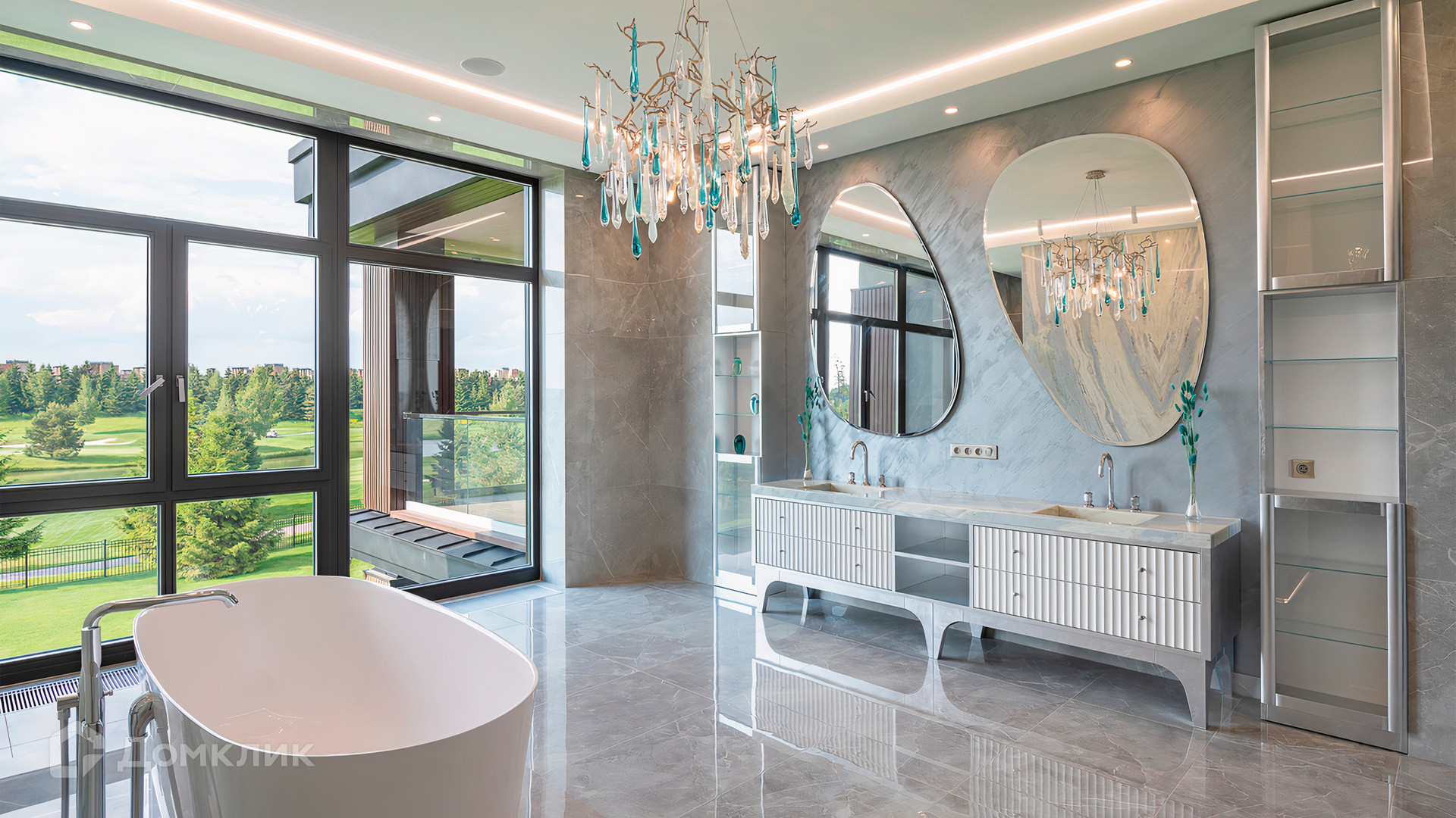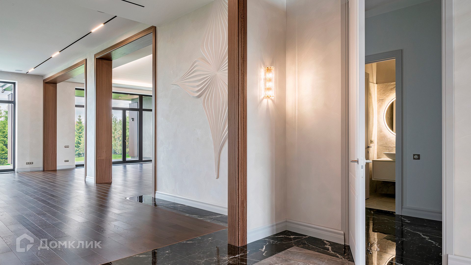 ID 9 937. Agalarov Estate. Просторный загородный дом площадью 1590 м² расположен на полевом участке 40 соток. Фасад в современном стиле облицован деревом и камнем, декорирован подсветкой. Интерьер выполнен в современном стиле с применением сдержанной палитры цветов. В отделке использованы природные текстуры — дерево и камень. Панорамное остекление наполняет пространство воздухом и светом. В коттедже предусмотрены бассейн с зоной отдыха и сауной, 2 гаража. С участка с ландшафтным дизайном и высаженными растениями открывается вид на гольф-поле.