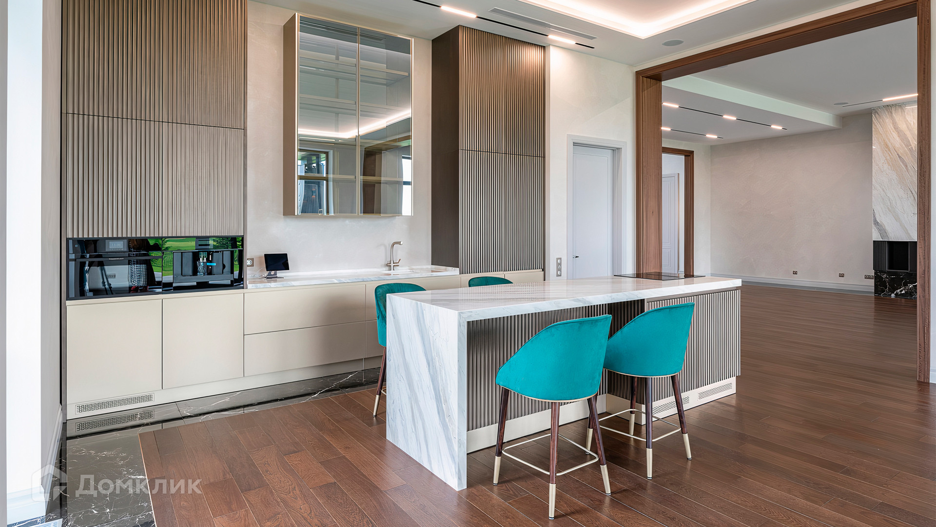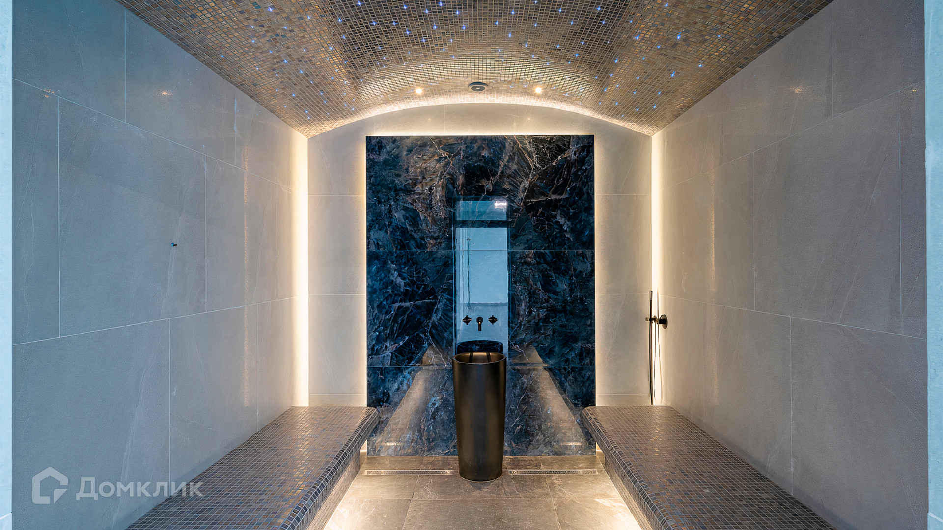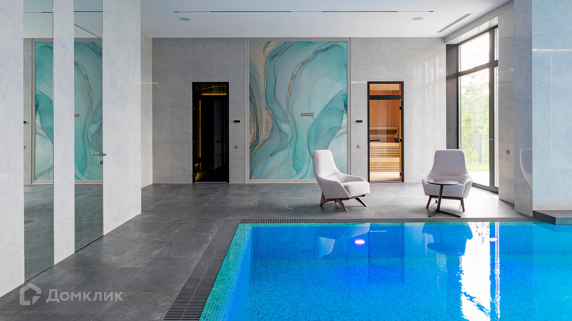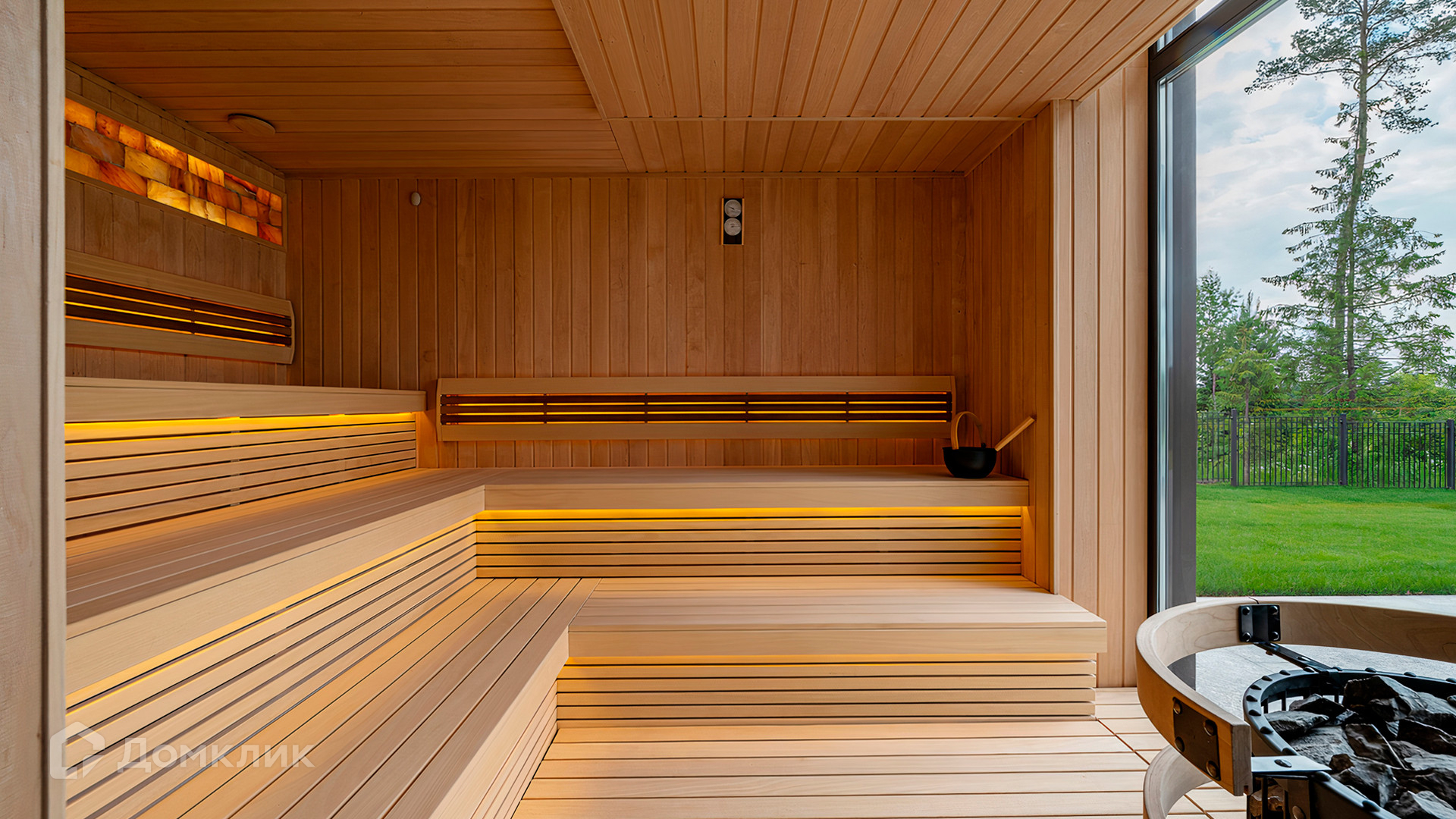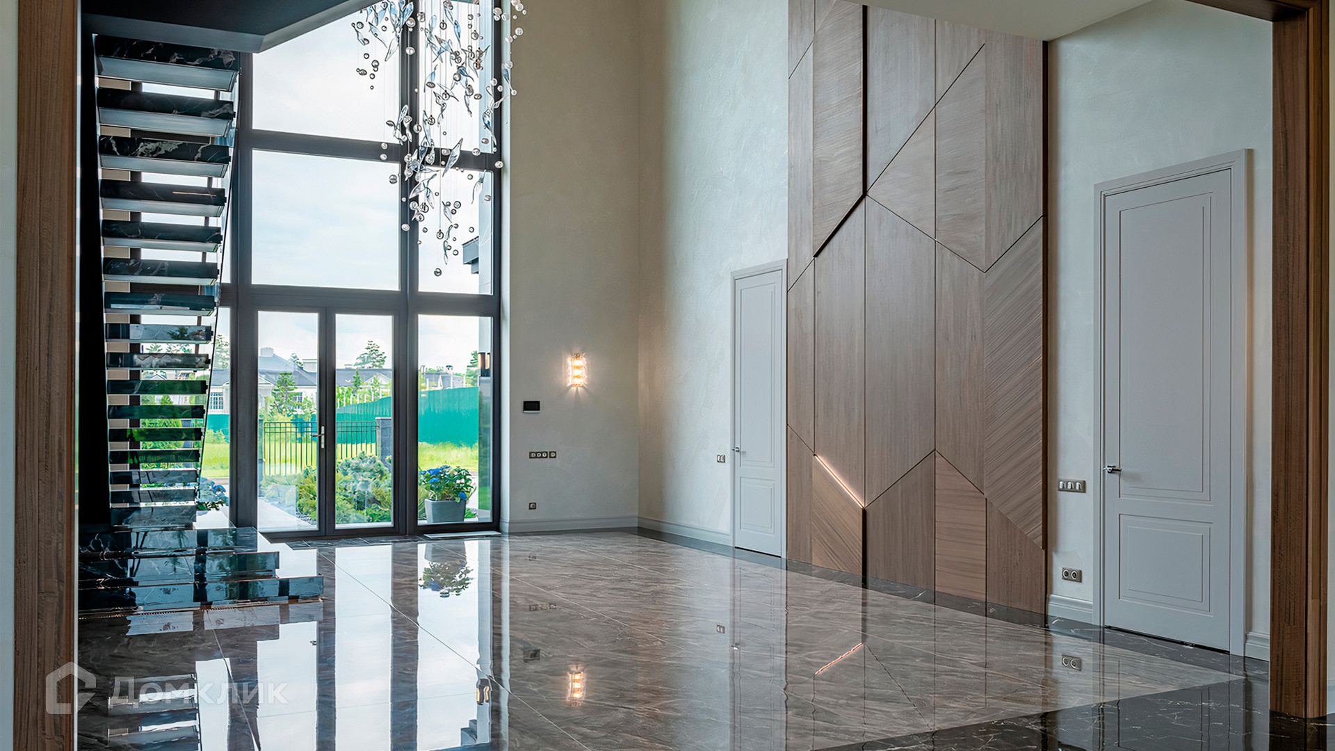 ID 9 937. Agalarov Estate. Просторный загородный дом площадью 1590 м² расположен на полевом участке 40 соток. Фасад в современном стиле облицован деревом и камнем, декорирован подсветкой. Интерьер выполнен в современном стиле с применением сдержанной палитры цветов. В отделке использованы природные текстуры — дерево и камень. Панорамное остекление наполняет пространство воздухом и светом. В коттедже предусмотрены бассейн с зоной отдыха и сауной, 2 гаража. С участка с ландшафтным дизайном и высаженными растениями открывается вид на гольф-поле.