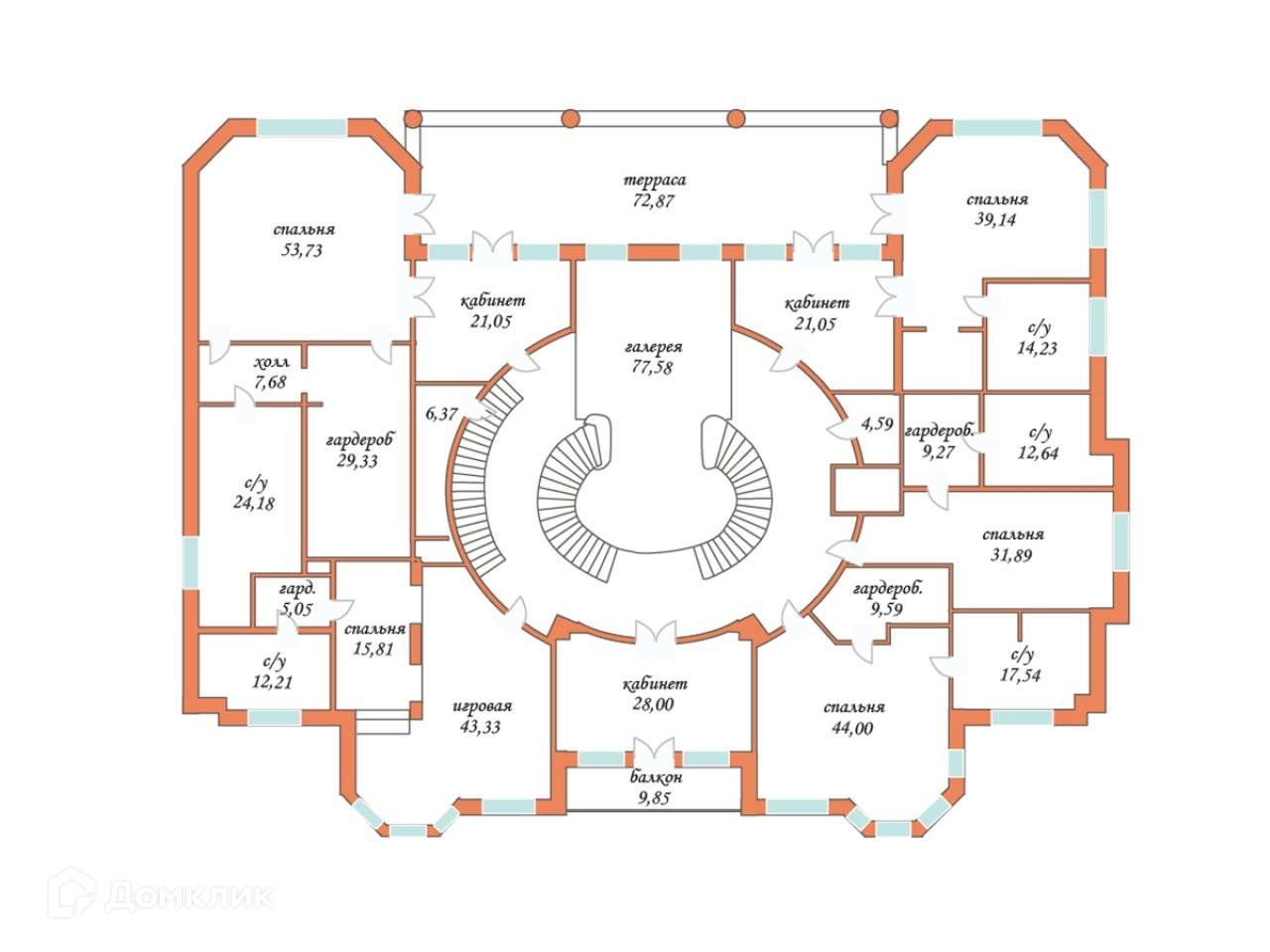 2 этаж: 3 спальни с гостиными, с/узлами и гардеробными, 2 хозяйских спальни с гардеробной, с/узлом и кабинетом, кабинет.