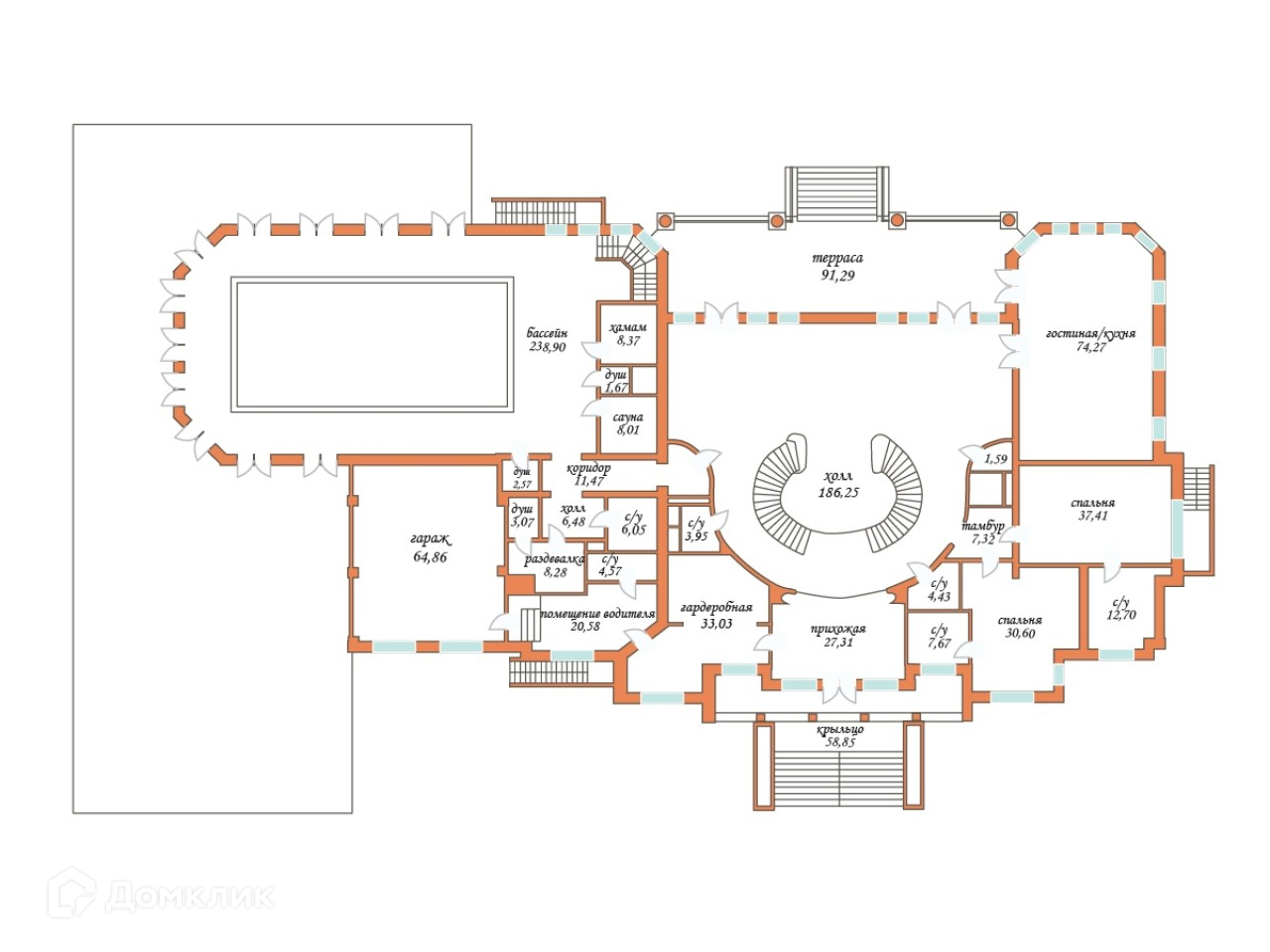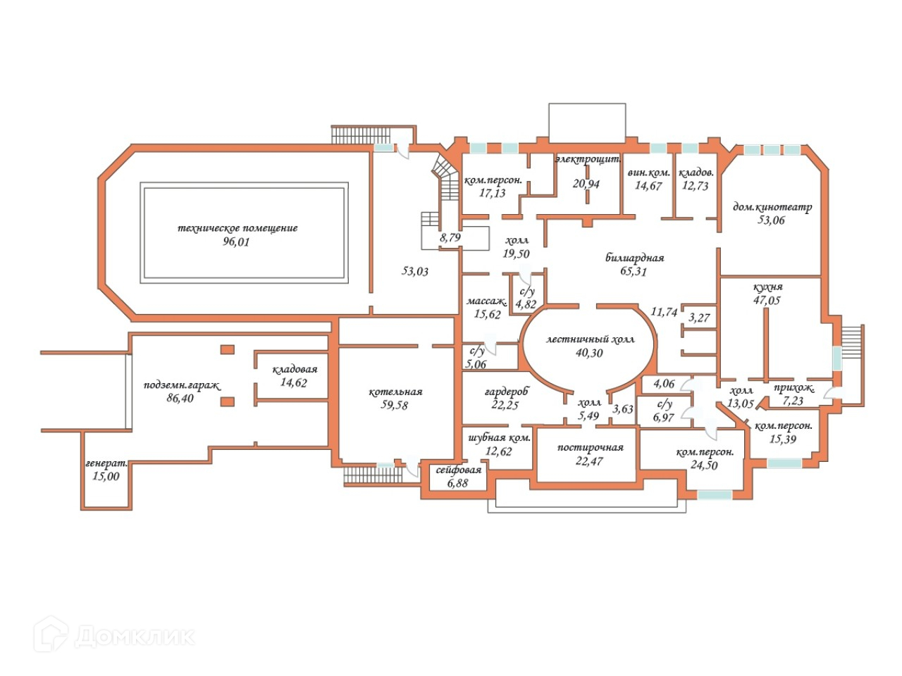 1 этаж: гараж на 2 автомашины с приточно- вытяжной установкой, комната для водителей с с/узлом, прихожая, холл, гардеробная, 2 с/узла, 2 гостевые спальни с гардеробными и с/узлами, лифт, кухня с лифтом для продуктов, столовая с выходом на участок, 2-х светная гостиная с камином, зона бассейна: чаша бассейна 15х6 метров с искусственным течением, с гидро-массажным креслом, сауна, хаммам, 2 с/узла, душевые, зона отдыха.