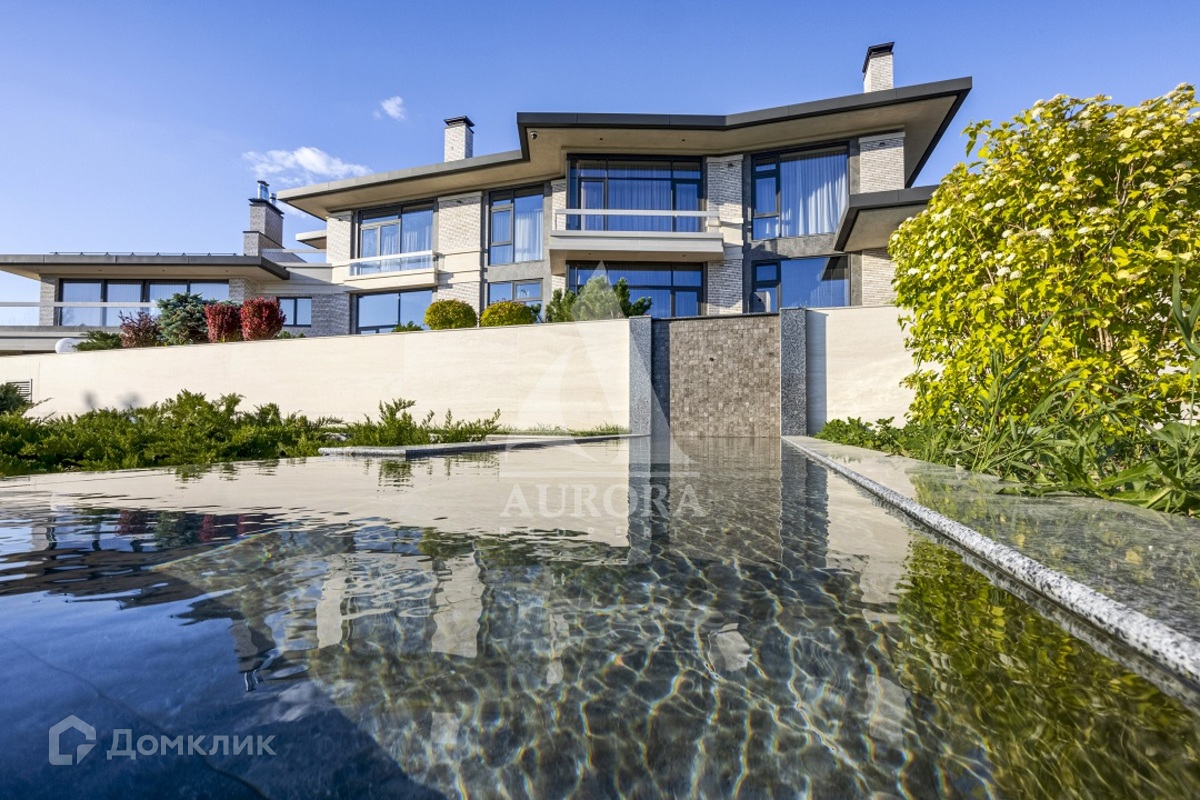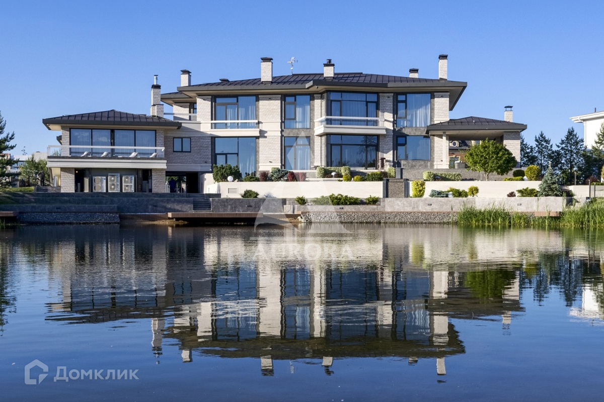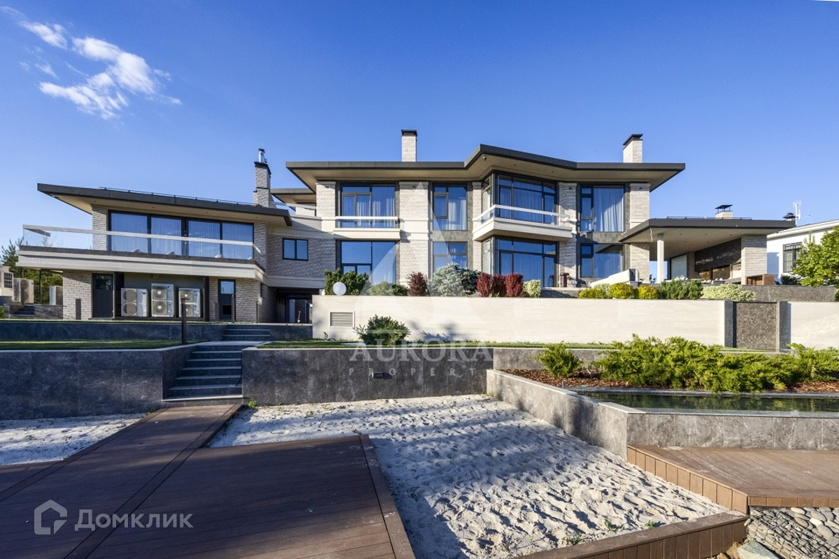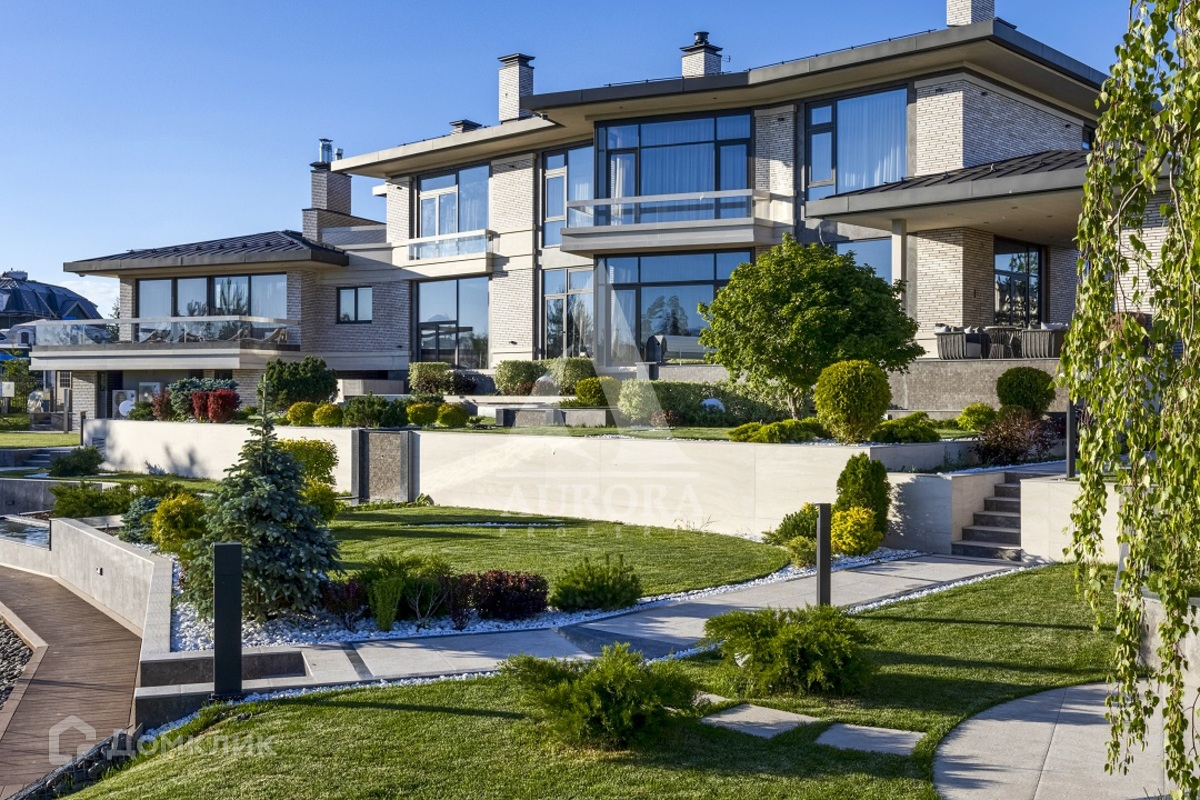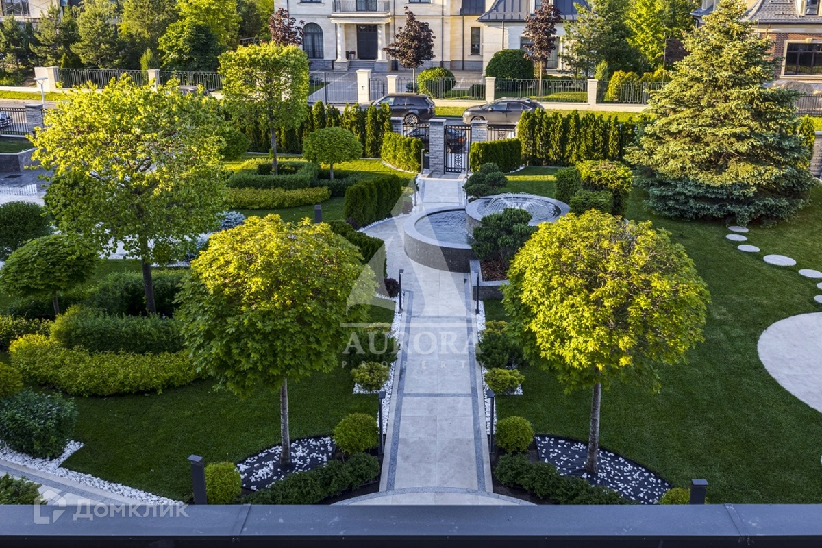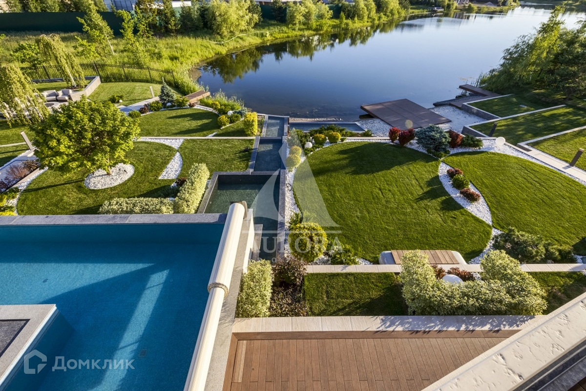 Коттедж располагается на земельном участке 37,0 соток и граничит с искусственным водоемом. На участке произведены ландшафтные работы, включающие: многоуровневое террасирование участка; устройство декоративных клумб и фонтана; систему каскадных многоуровневых мини-прудов; открытый сезонный бассейн; мощеные заезд, площадки и дорожки; пляжную зону и пирсы на берегу водоема; костровище с диванной зоной; декоративные ландшафтные посадки хвойных и лиственных деревьев и кустарников, рулонный газон.