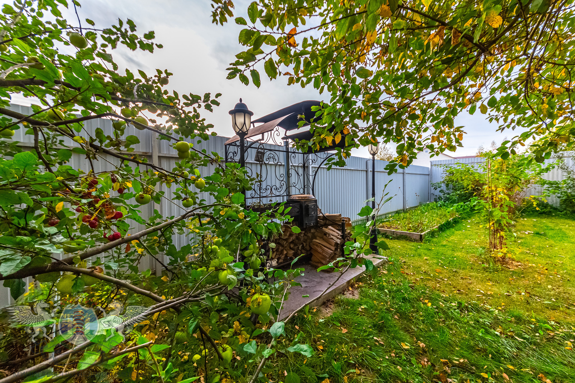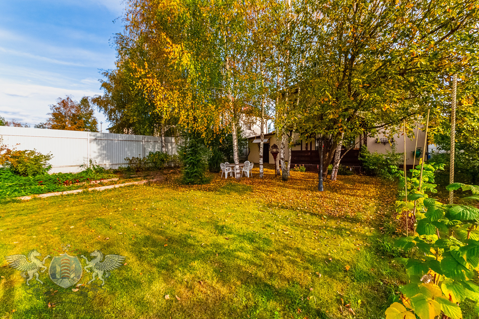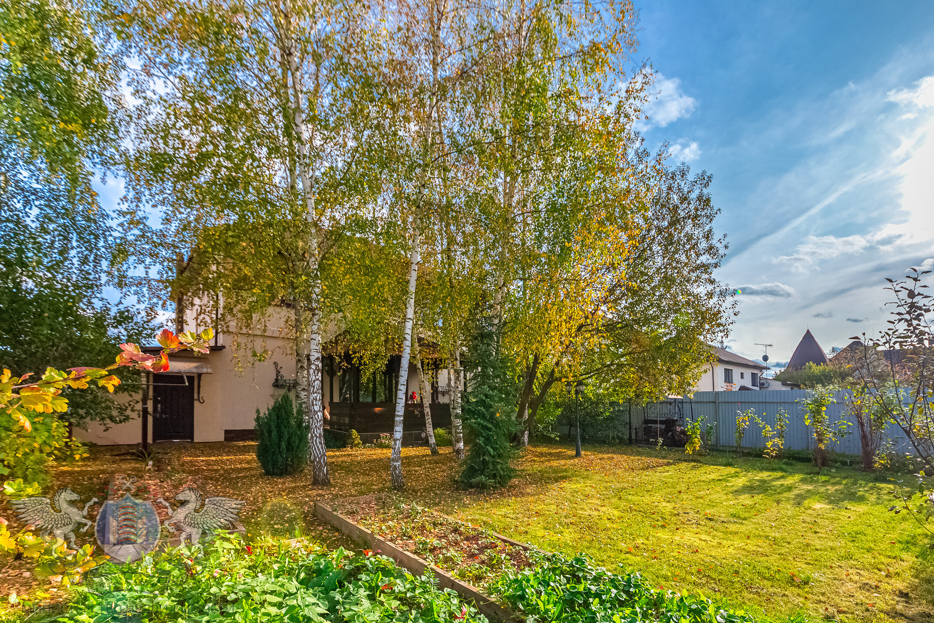 Участок правильной геометрии, ровный, сухой, огорожен забором. На участке посажены плодовые деревья, кустарники, березы и туи.